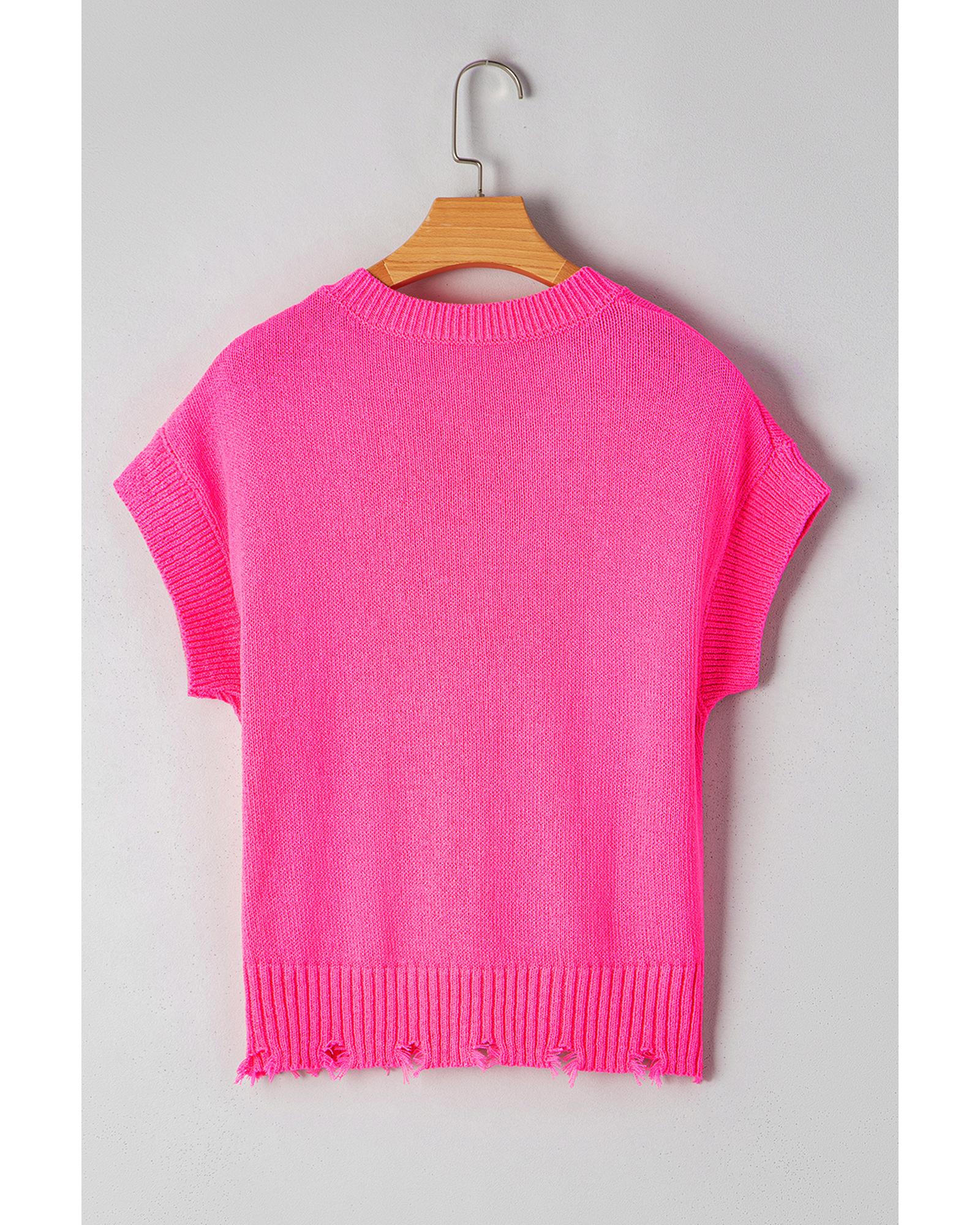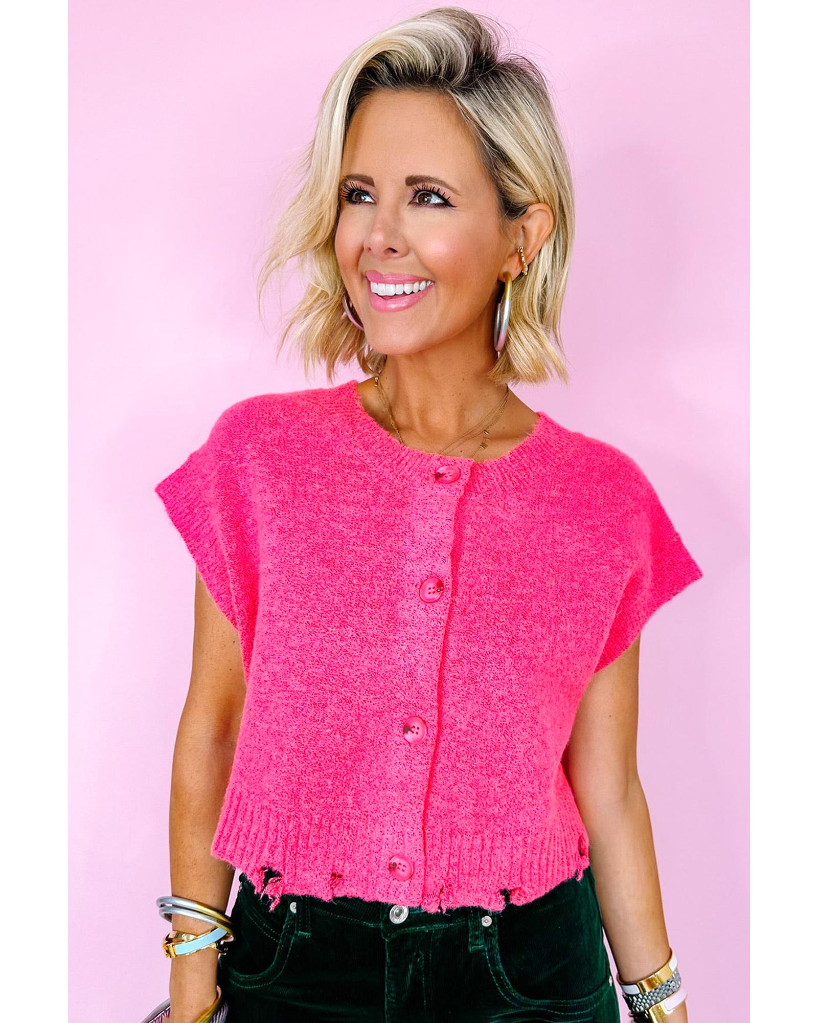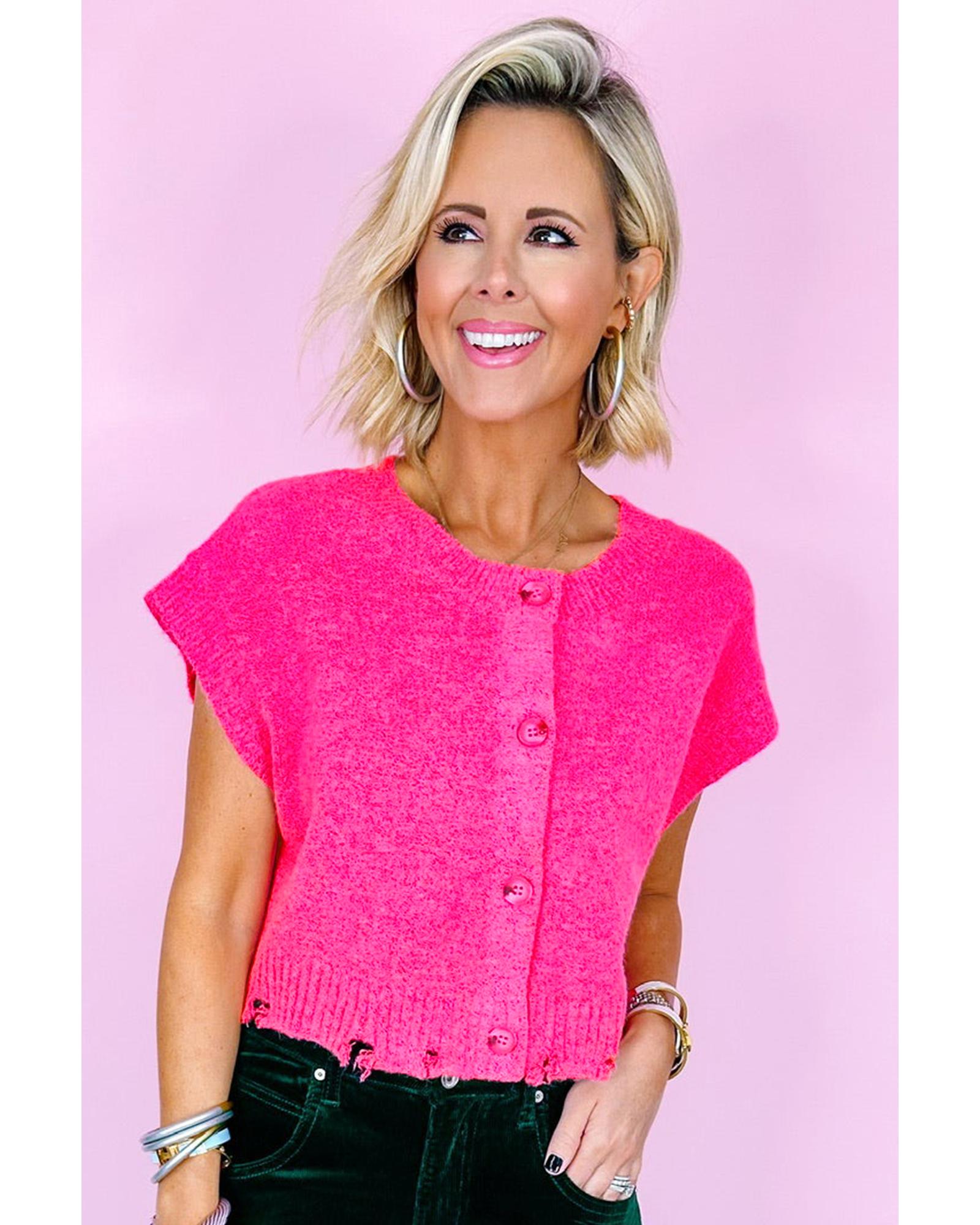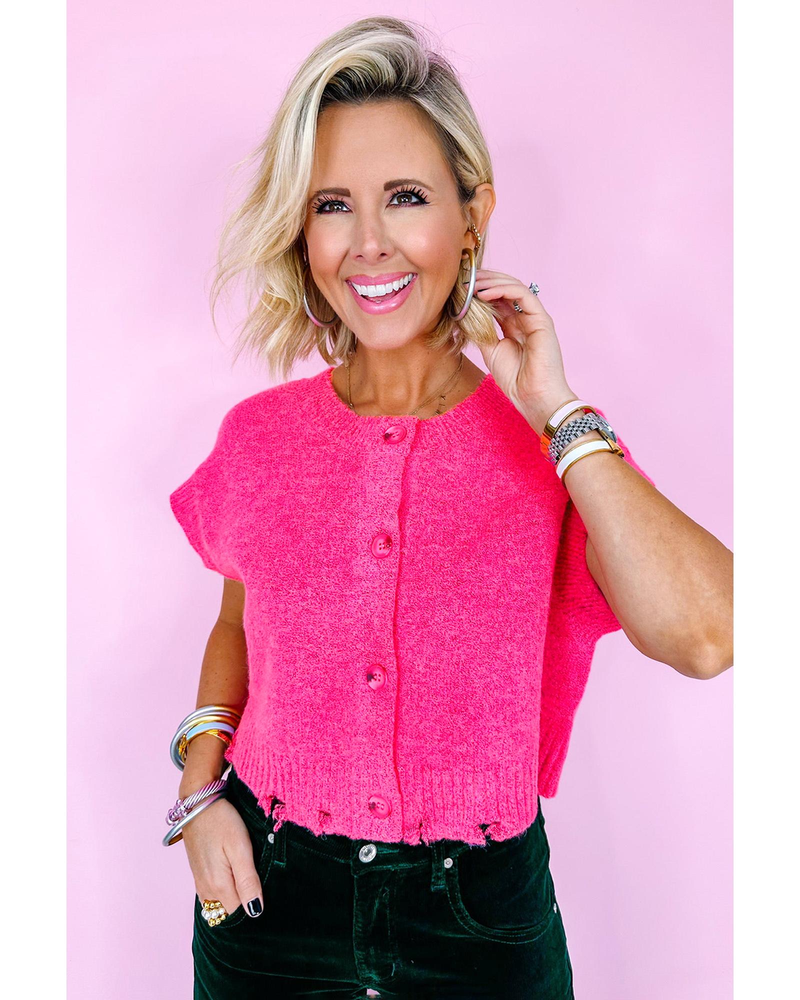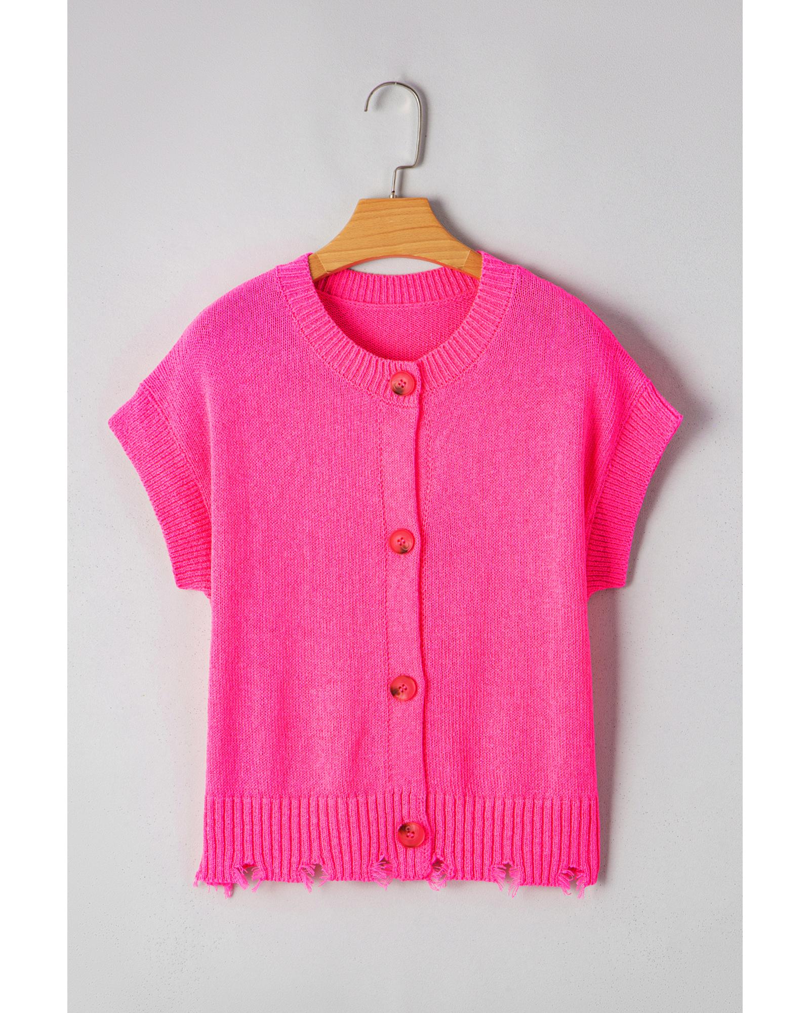 Bright Pink Distressed Hem Short Sleeve Knitted Button Front Sweater – L