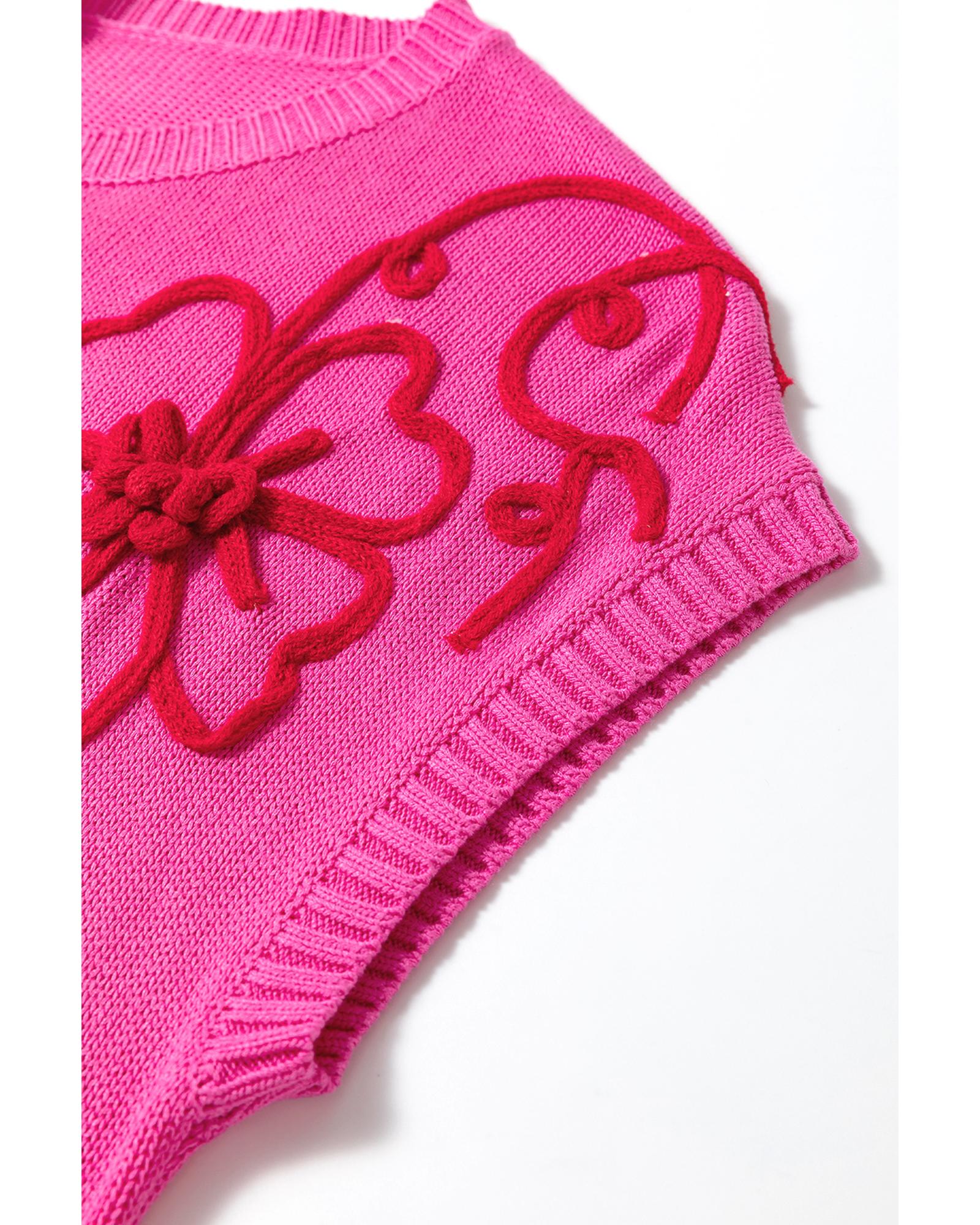 Bright Pink Flower Embroidery Short Sleeve Knitwear Top – L