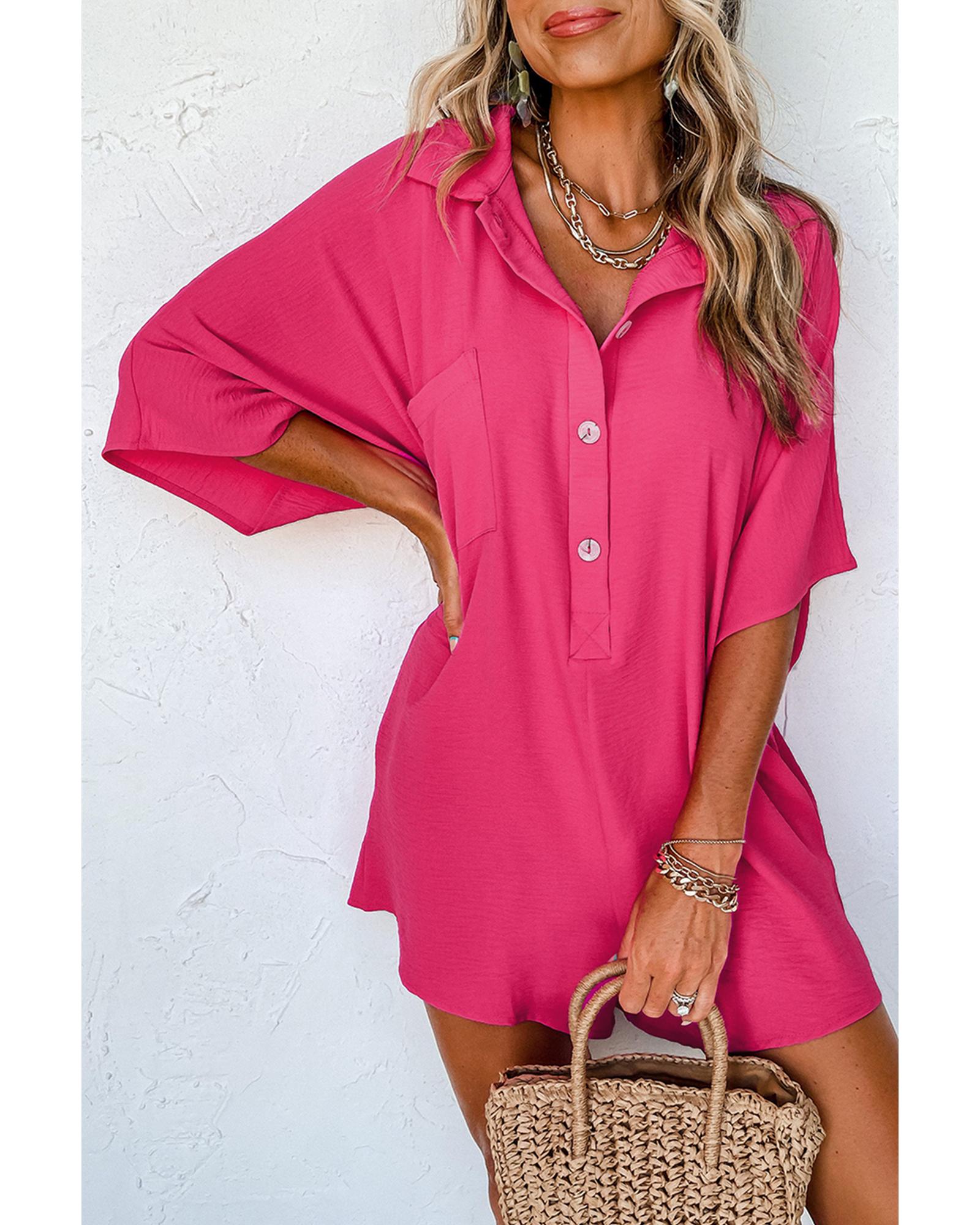 Bright pink half - button collared loose romper Solid color casual wear for women Button closures turn