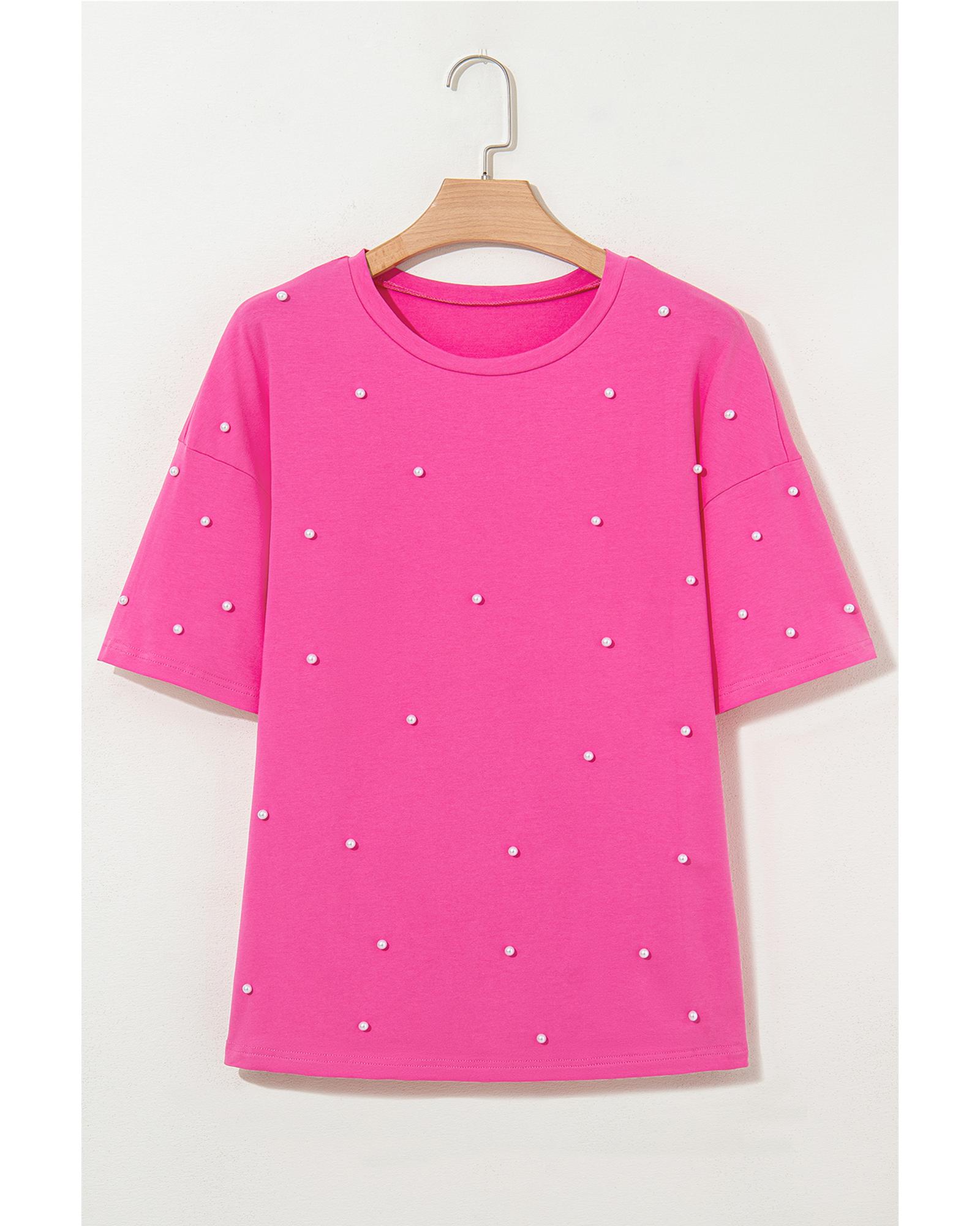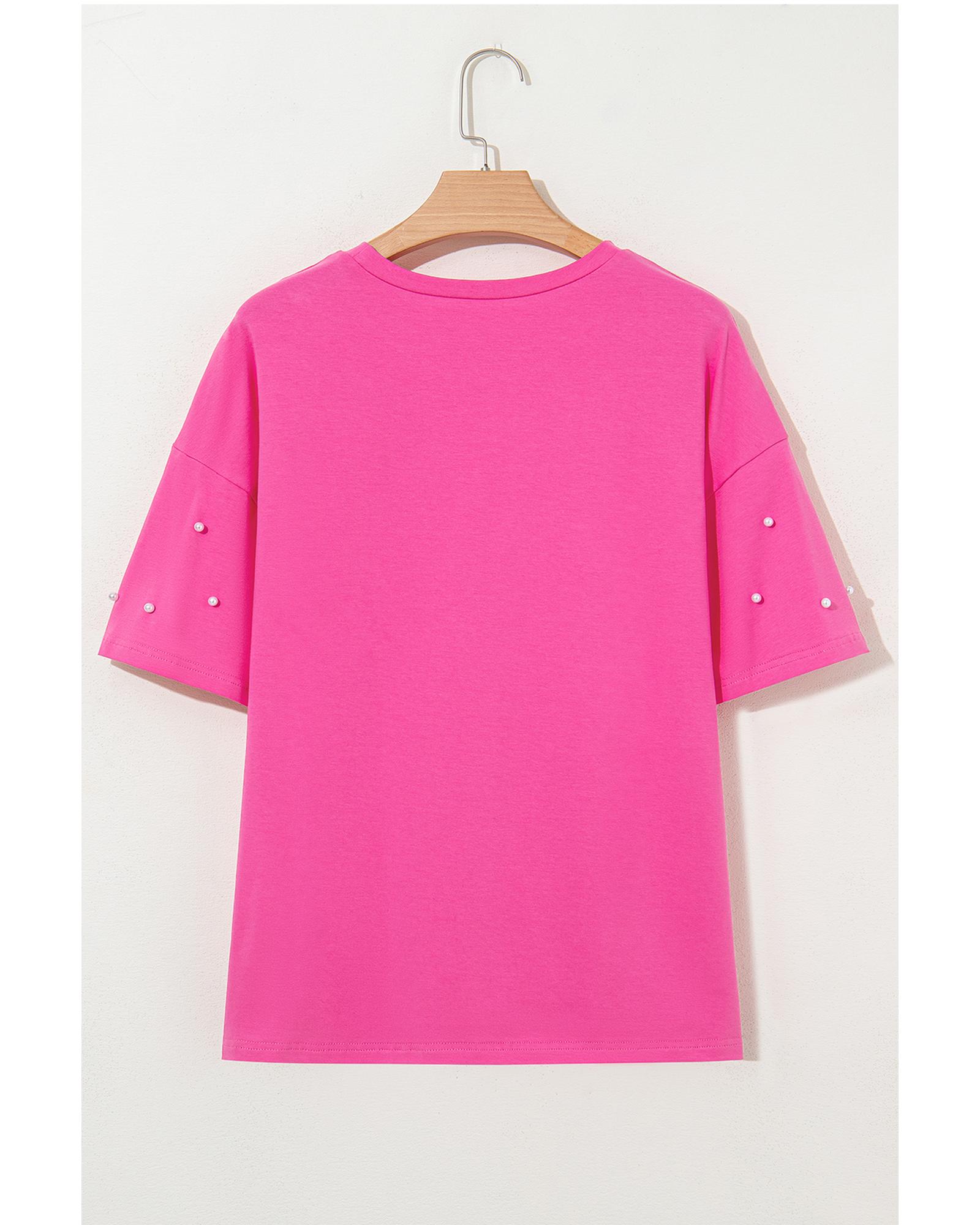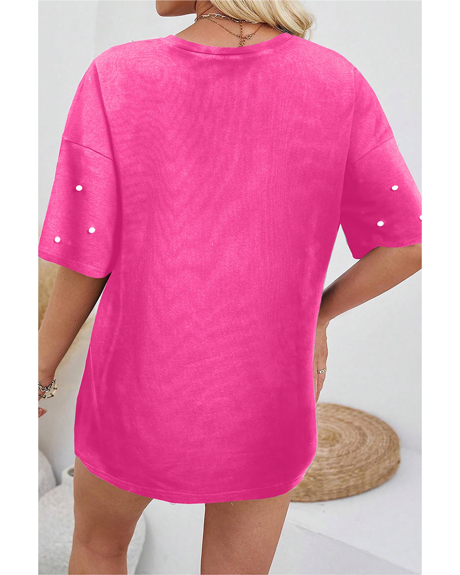 Bright Pink Pearl Beaded Drop Shoulder Crewneck T Shirt – S