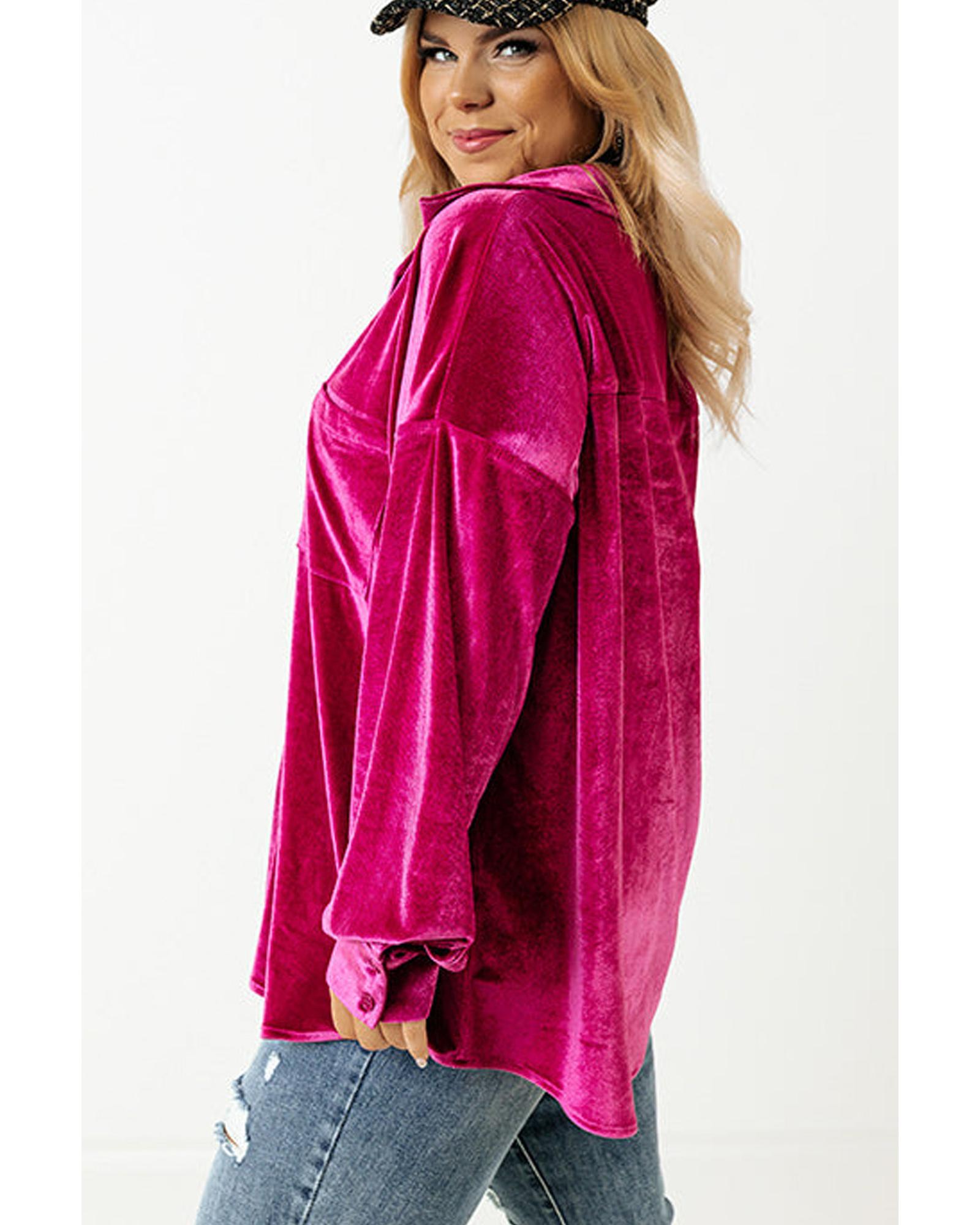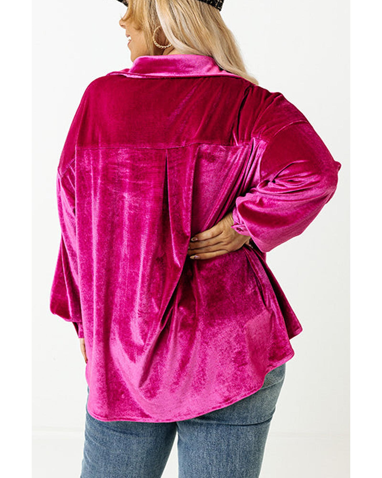 Bright Pink Plus Size Velvet Chest Pocket Drop Shoulder Shirt – 2X