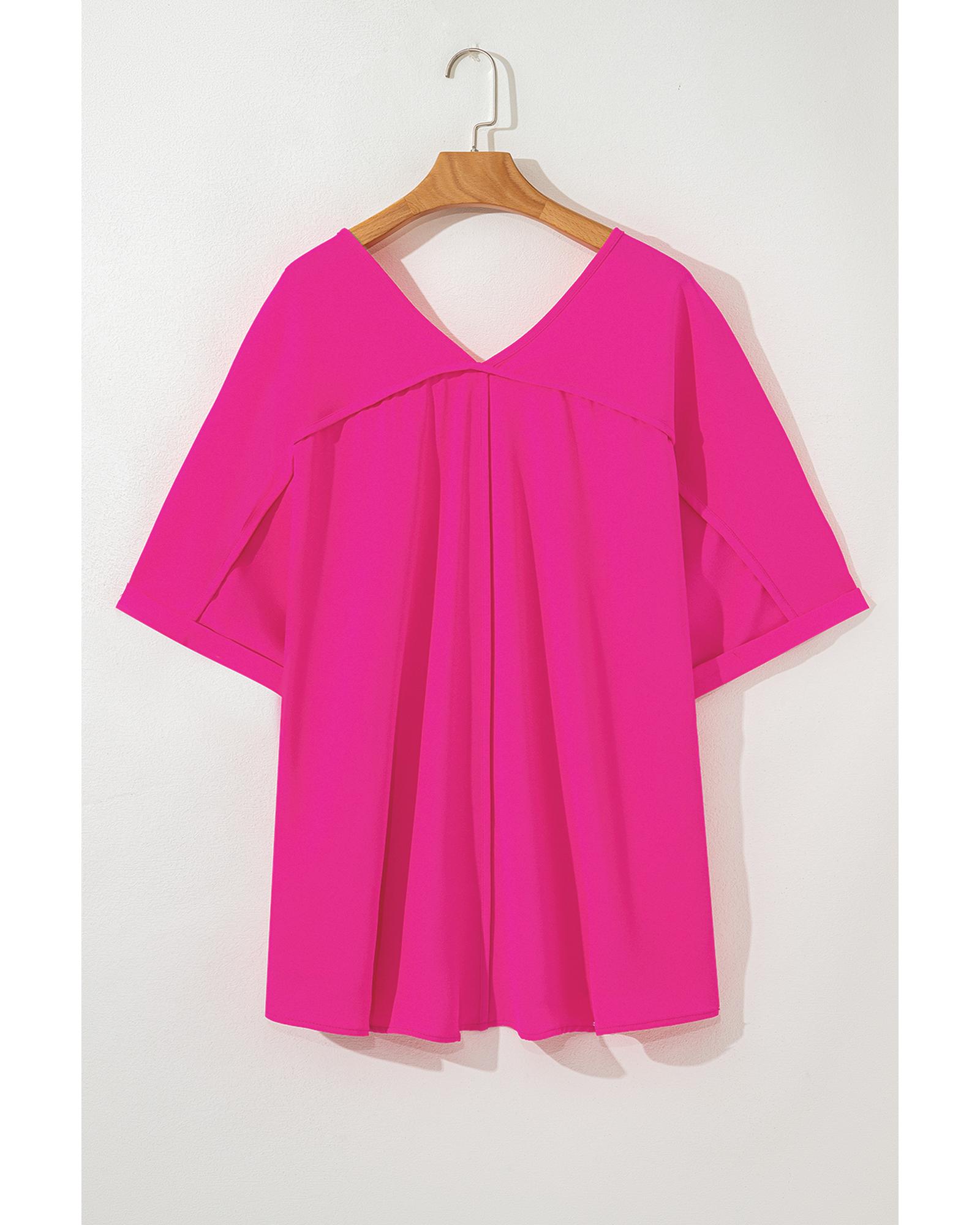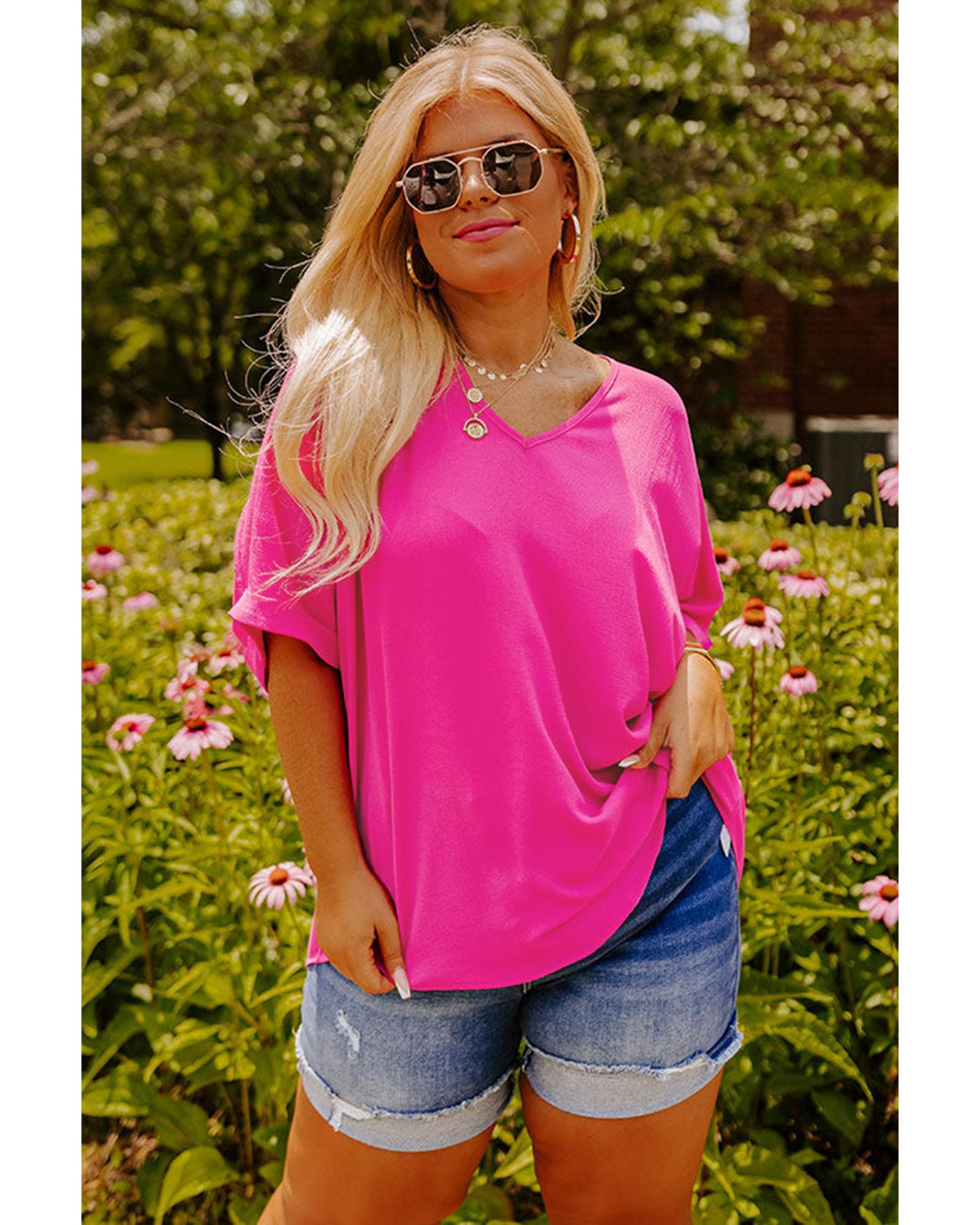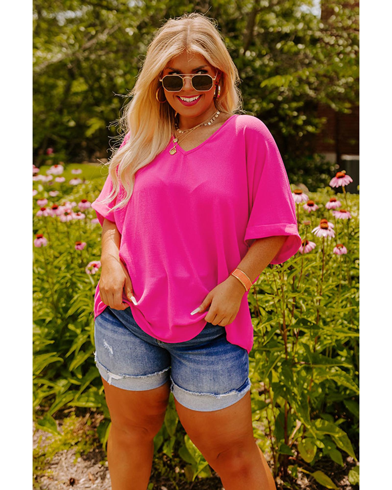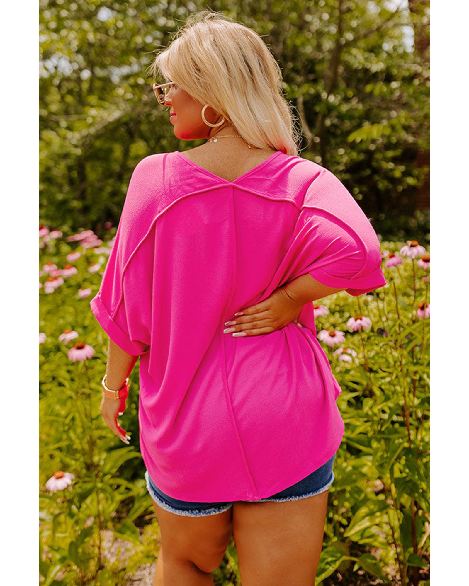 Bright Pink Seamed Back High Low Hem V Neck Cuffed Sleeve Plus Size Tee – 4X