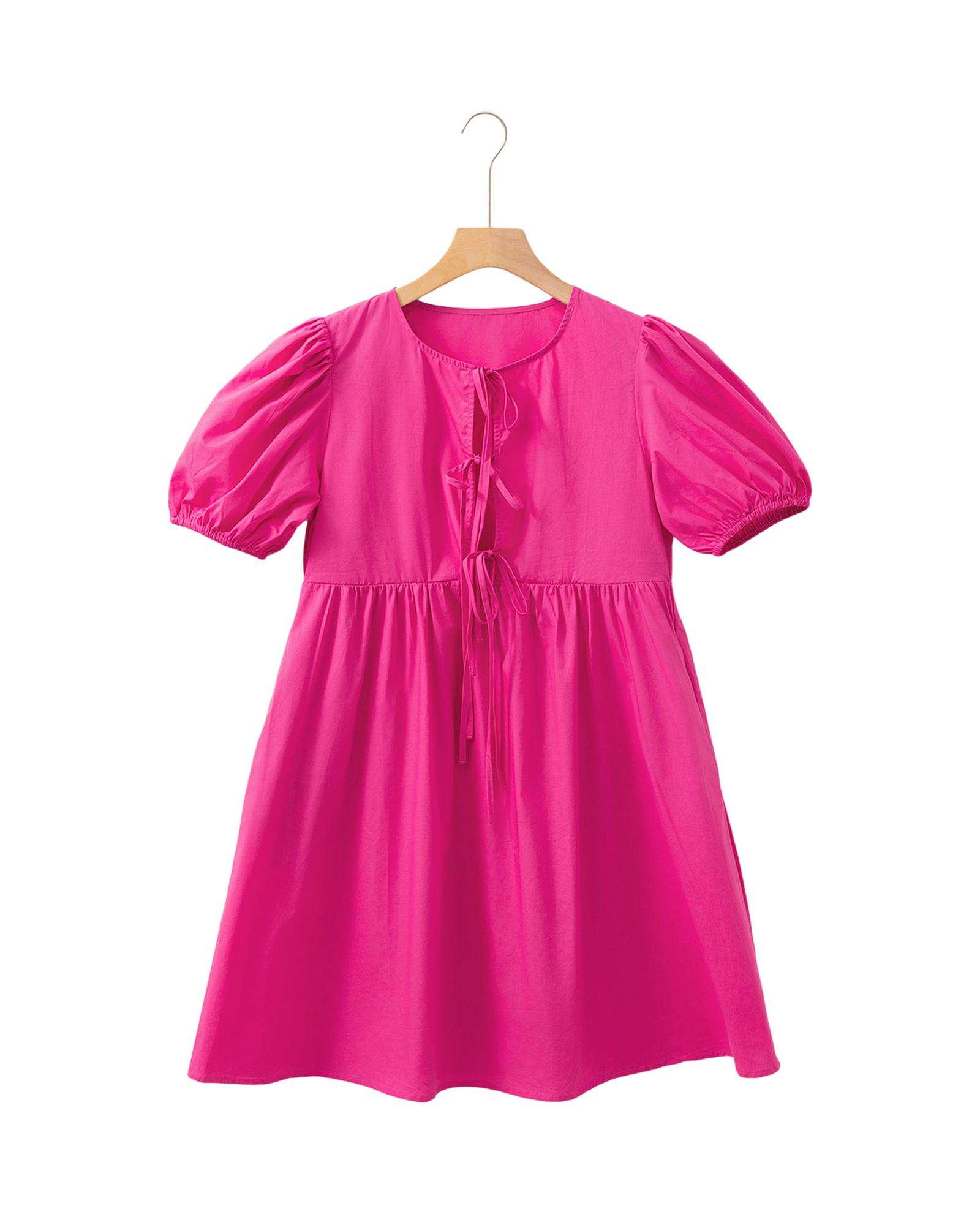 Bright Pink Solid Color Puff Sleeve Tie Front High Waist Mini Dress - S