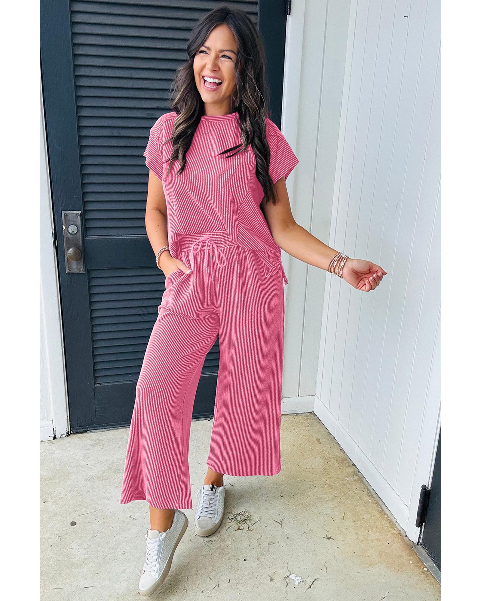 Bright Pink Solid Corded Knit Short Sleeve T Shirt and Wide Leg Pants Set – L