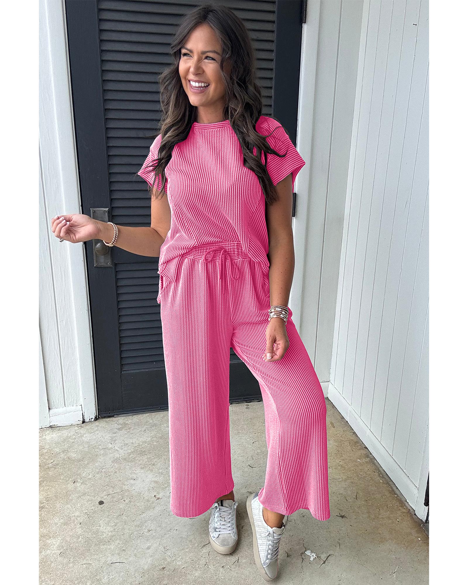 Bright Pink Solid Corded Knit Short Sleeve T Shirt and Wide Leg Pants Set – M