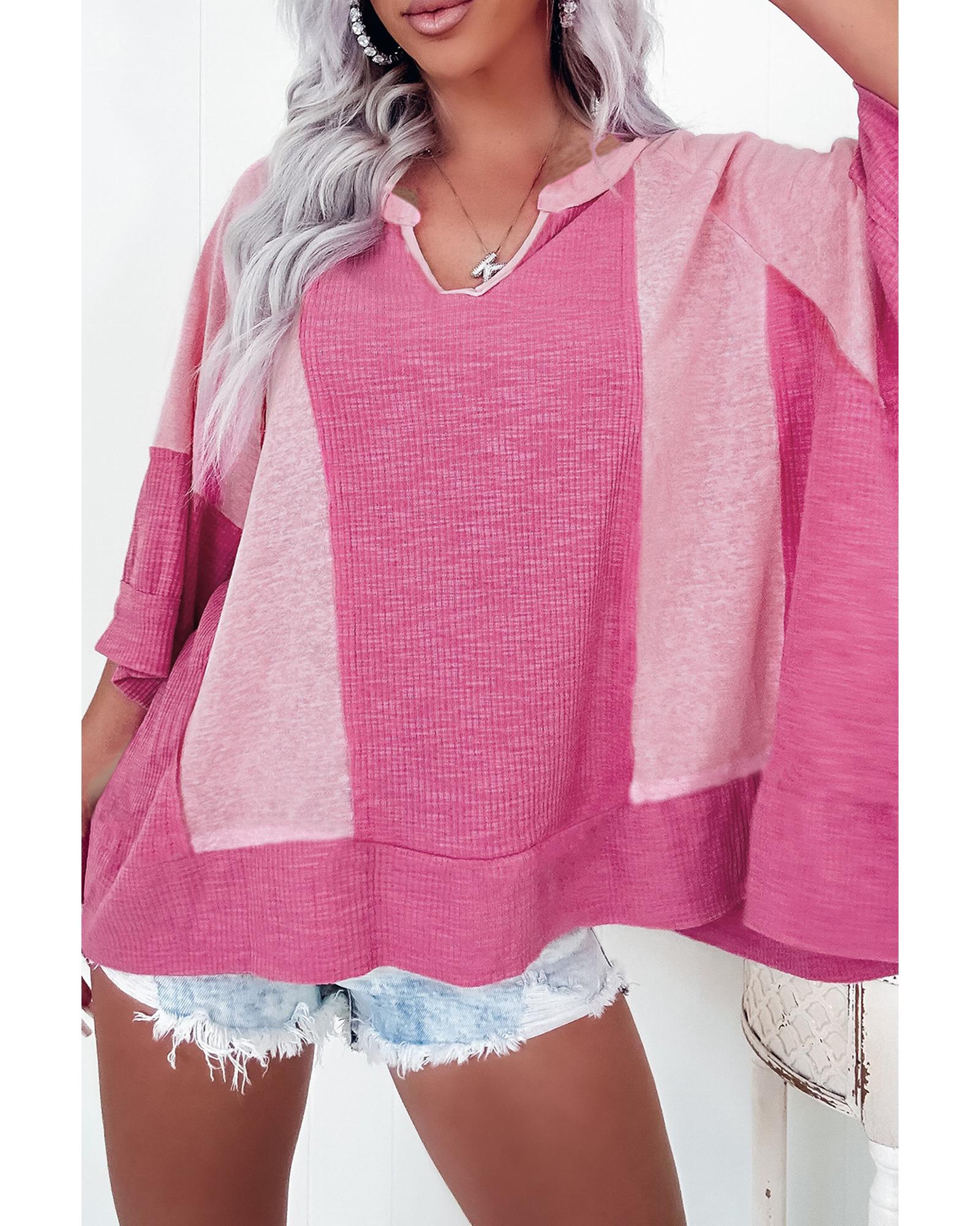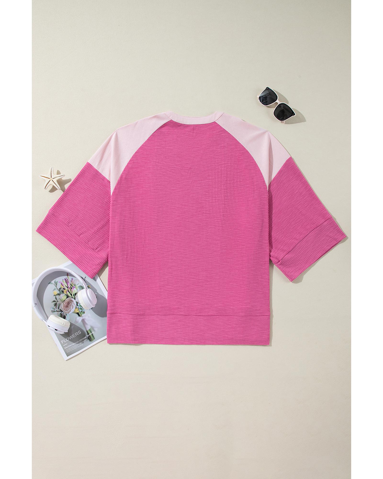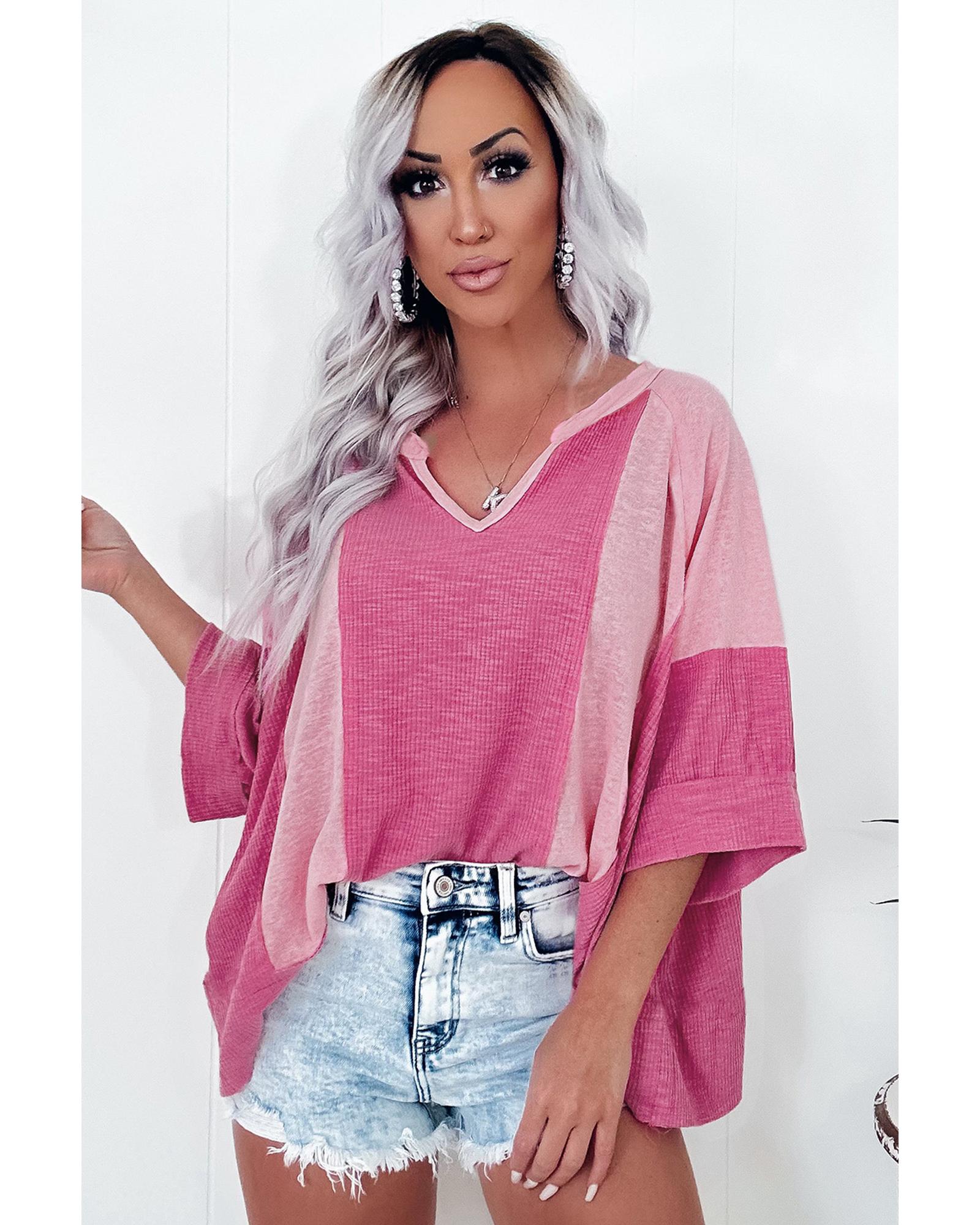 Bright Pink Textured Colorblock 3/4 Sleeve Oversize Top – L