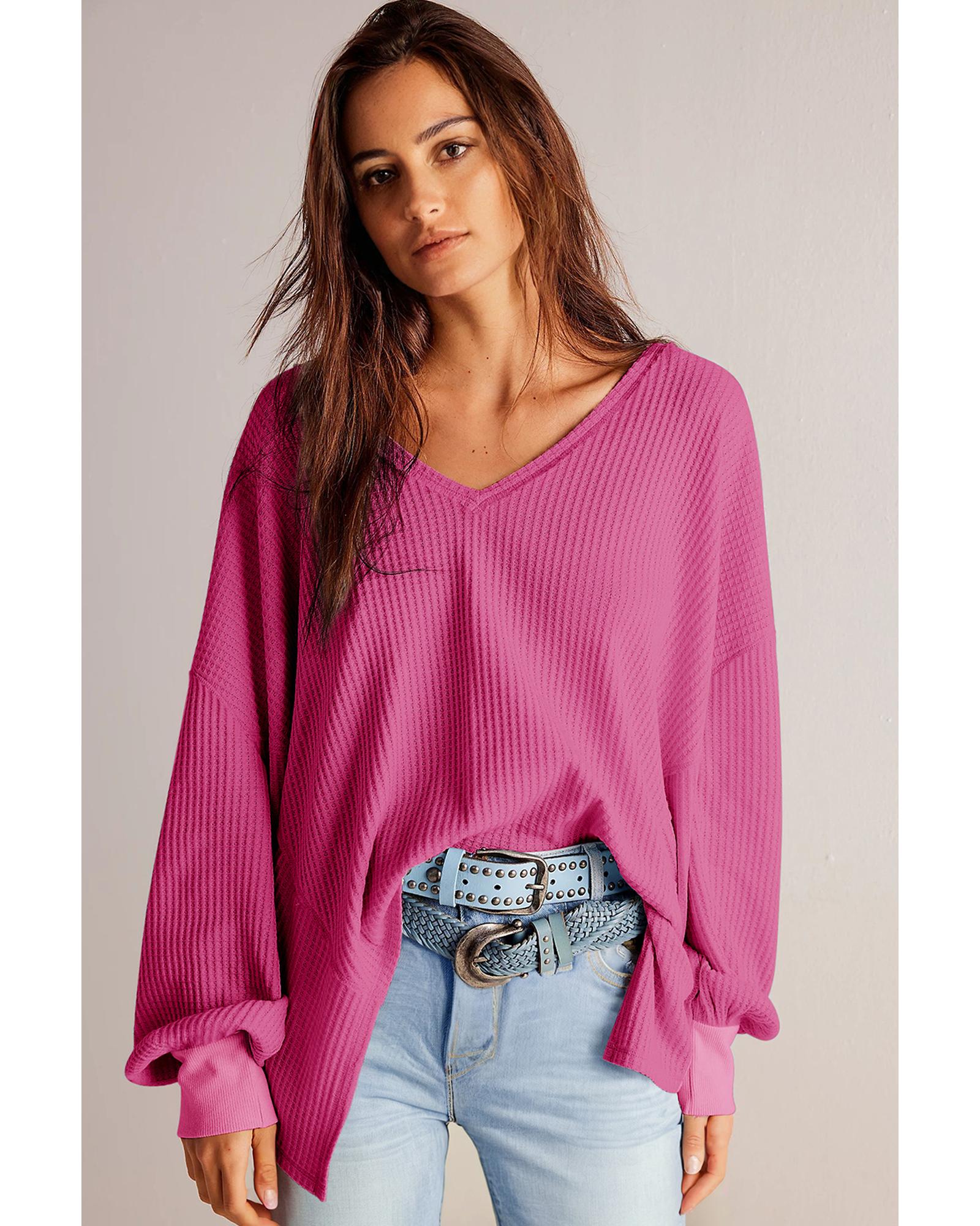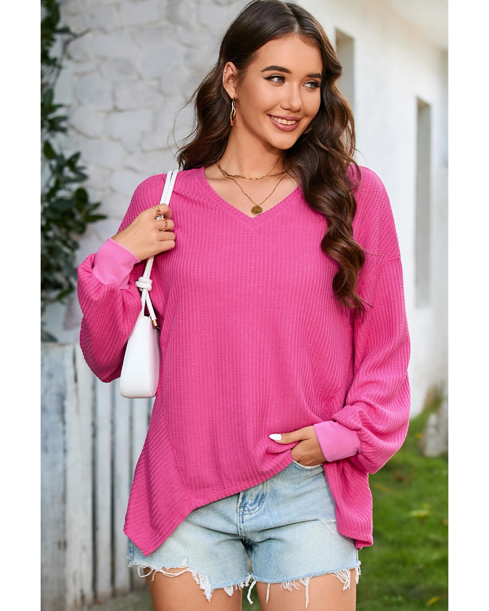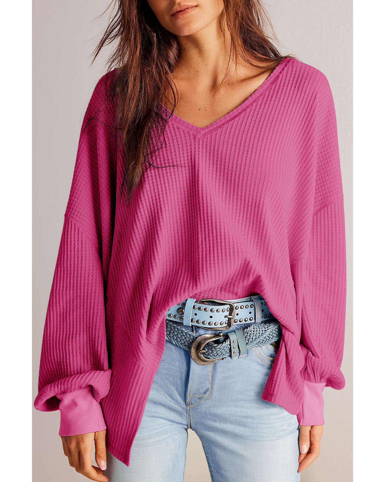 Bright Pink Waffle V Neck Long Sleeve Drop Shoulder Loose Blouse – XL