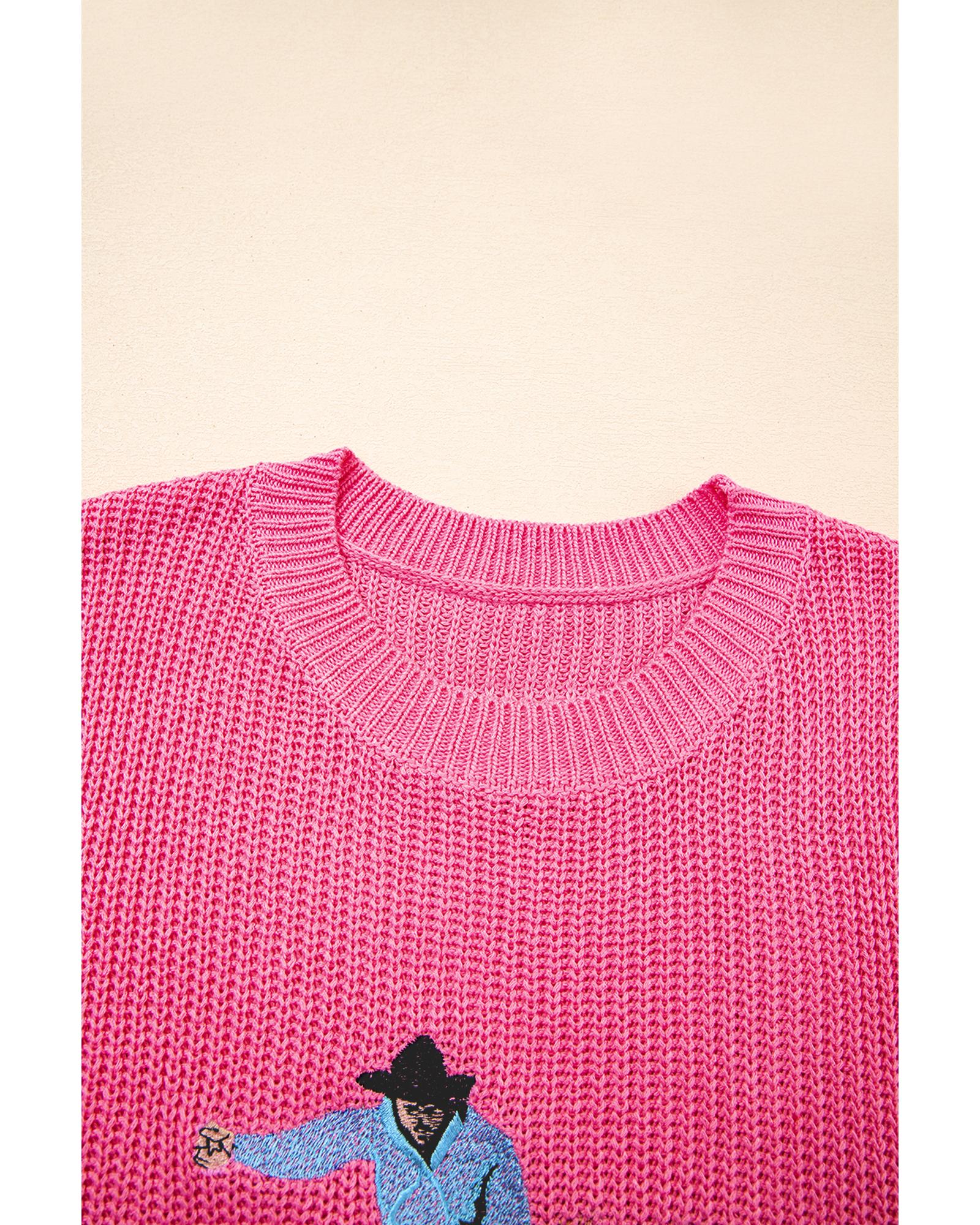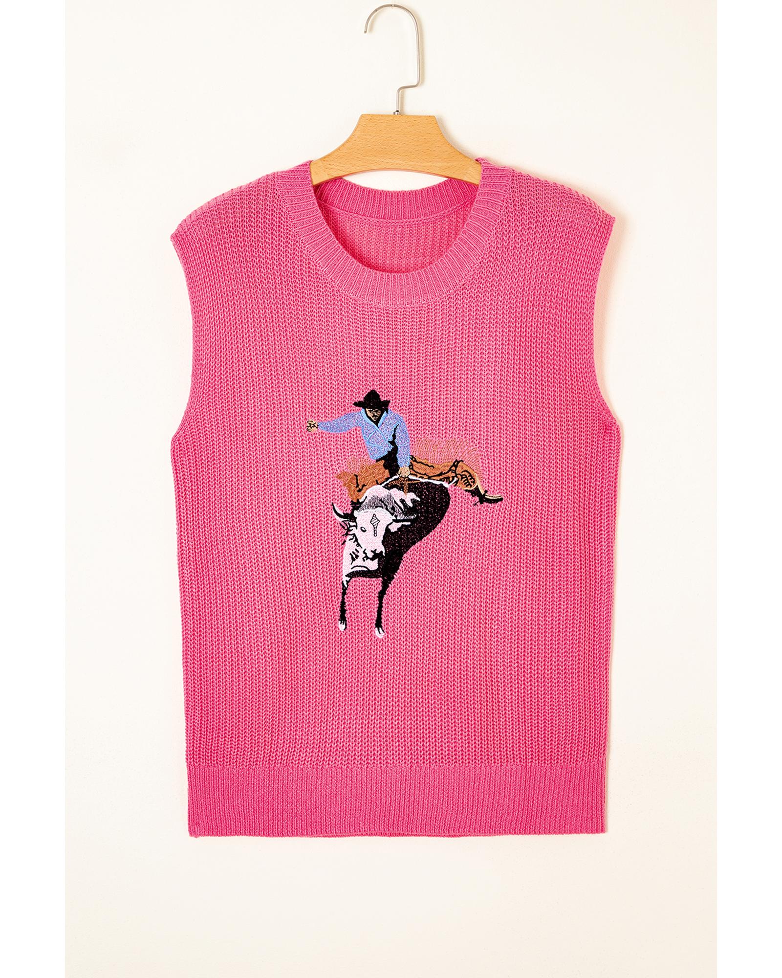 Bright Pink Western Cowboy Embroidery Round Neck Sleeveless Sweater – M
