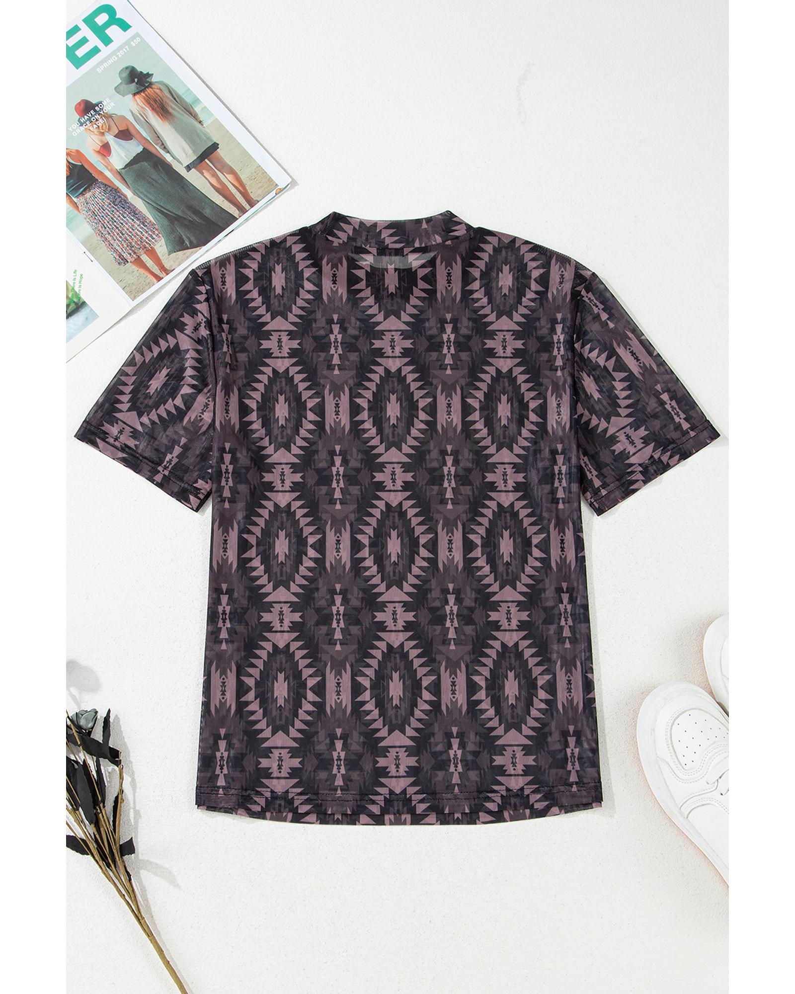 Brown Aztec Print Mock Neck Short Sleeve Mesh T Shirt – L