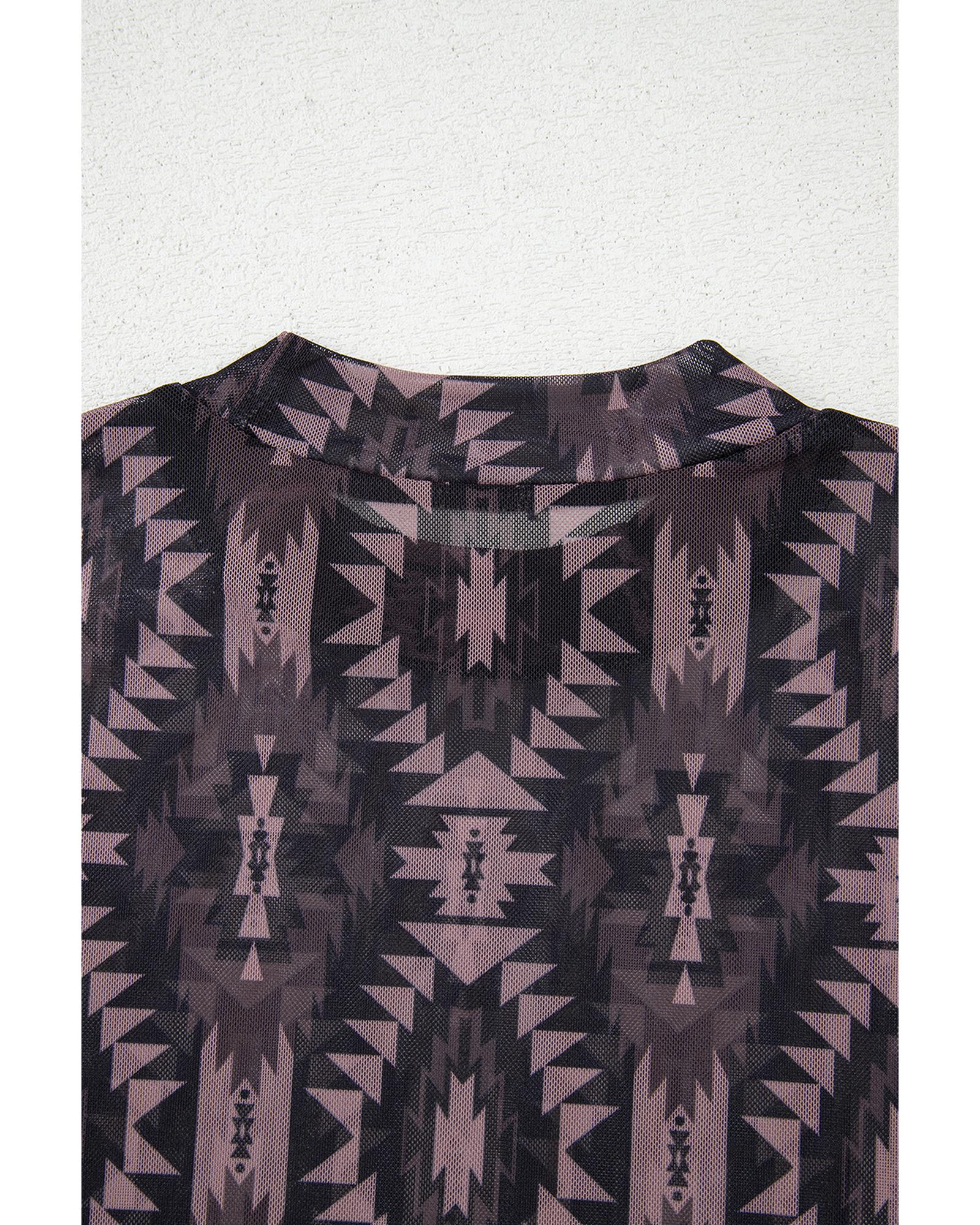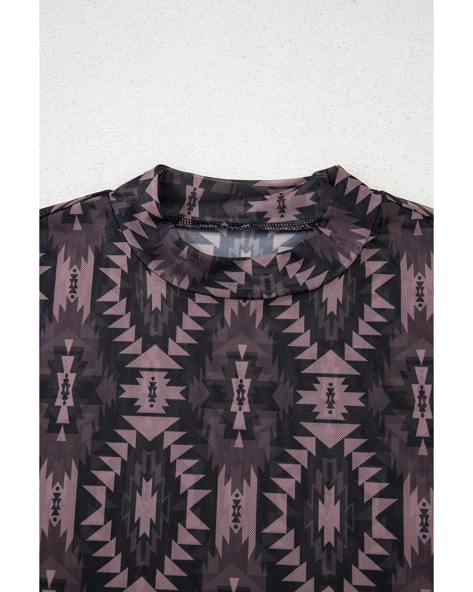 Brown Aztec Print Mock Neck Short Sleeve Mesh T Shirt – S