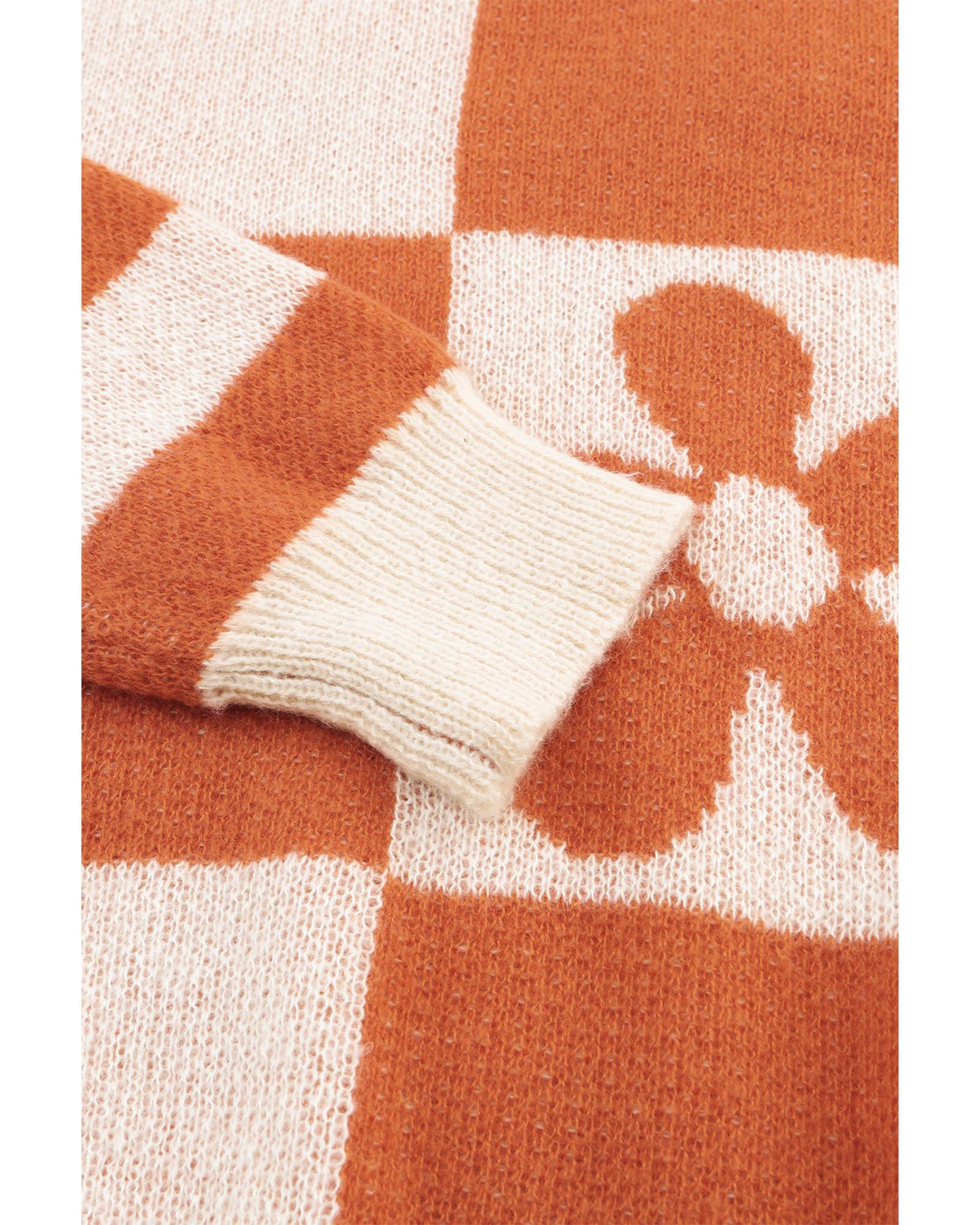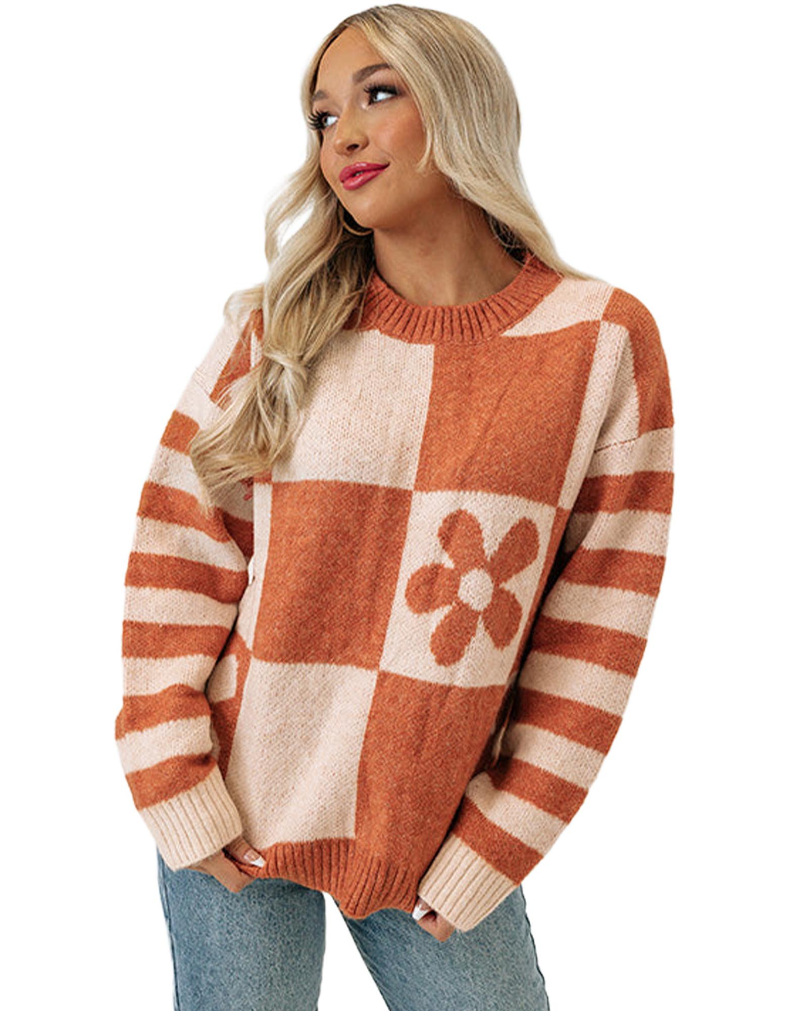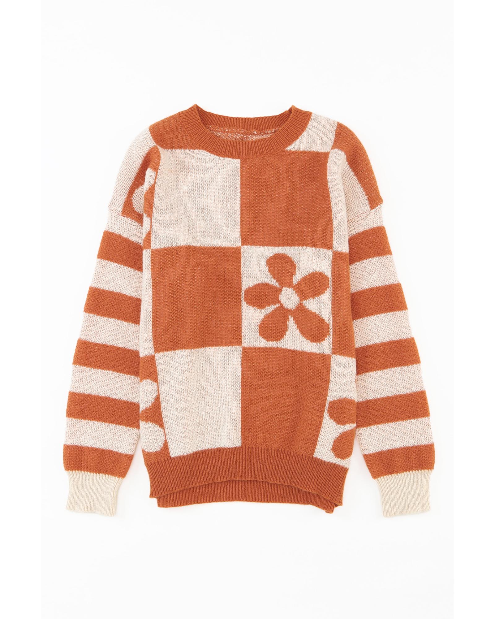 Brown Checkered Floral Print Striped Sleeve Sweater – S