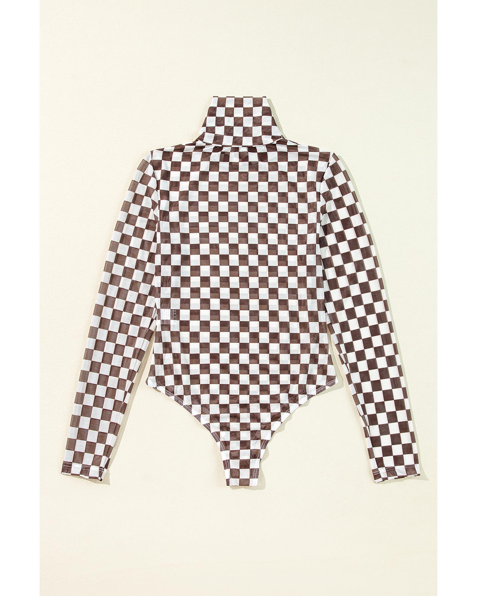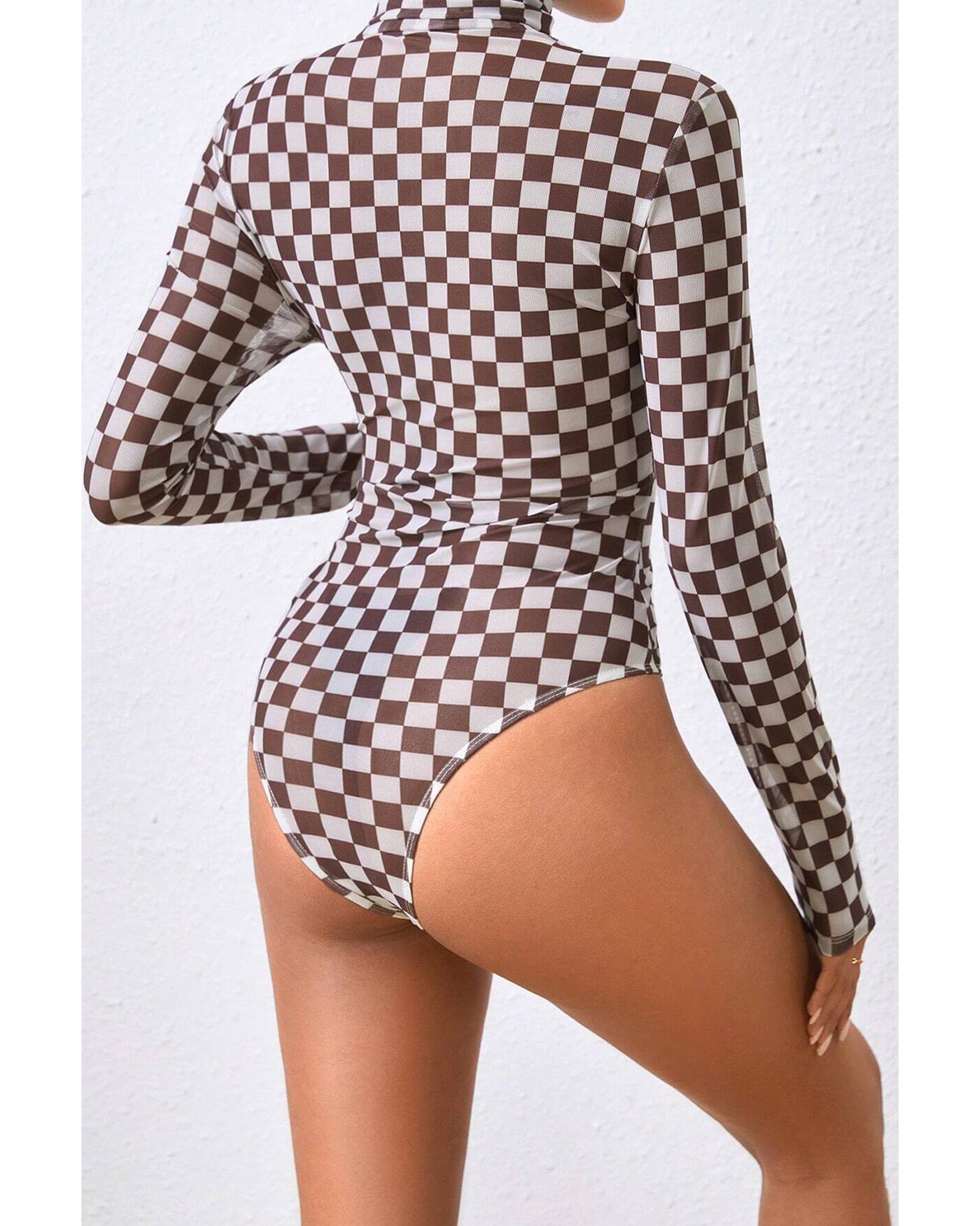 Brown Checkered Printed Long Sleeve High Neck Bodysuit – XL