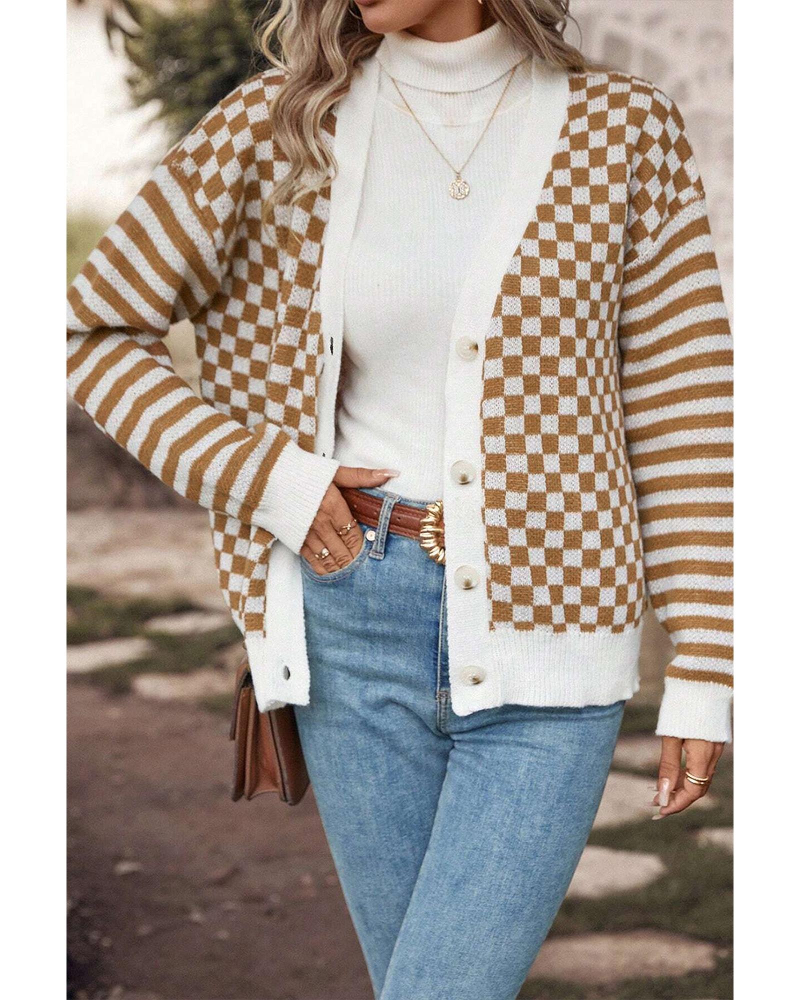 Brown Checkered Striped Patched Buttoned V Neck Cardigan – M