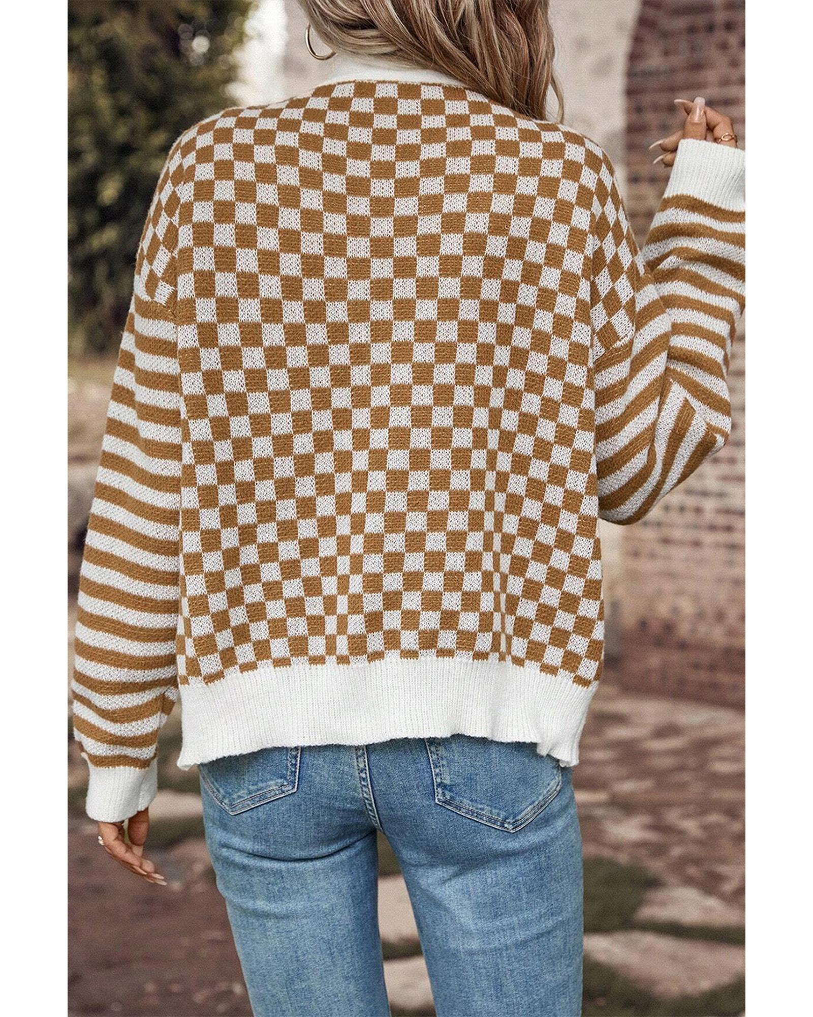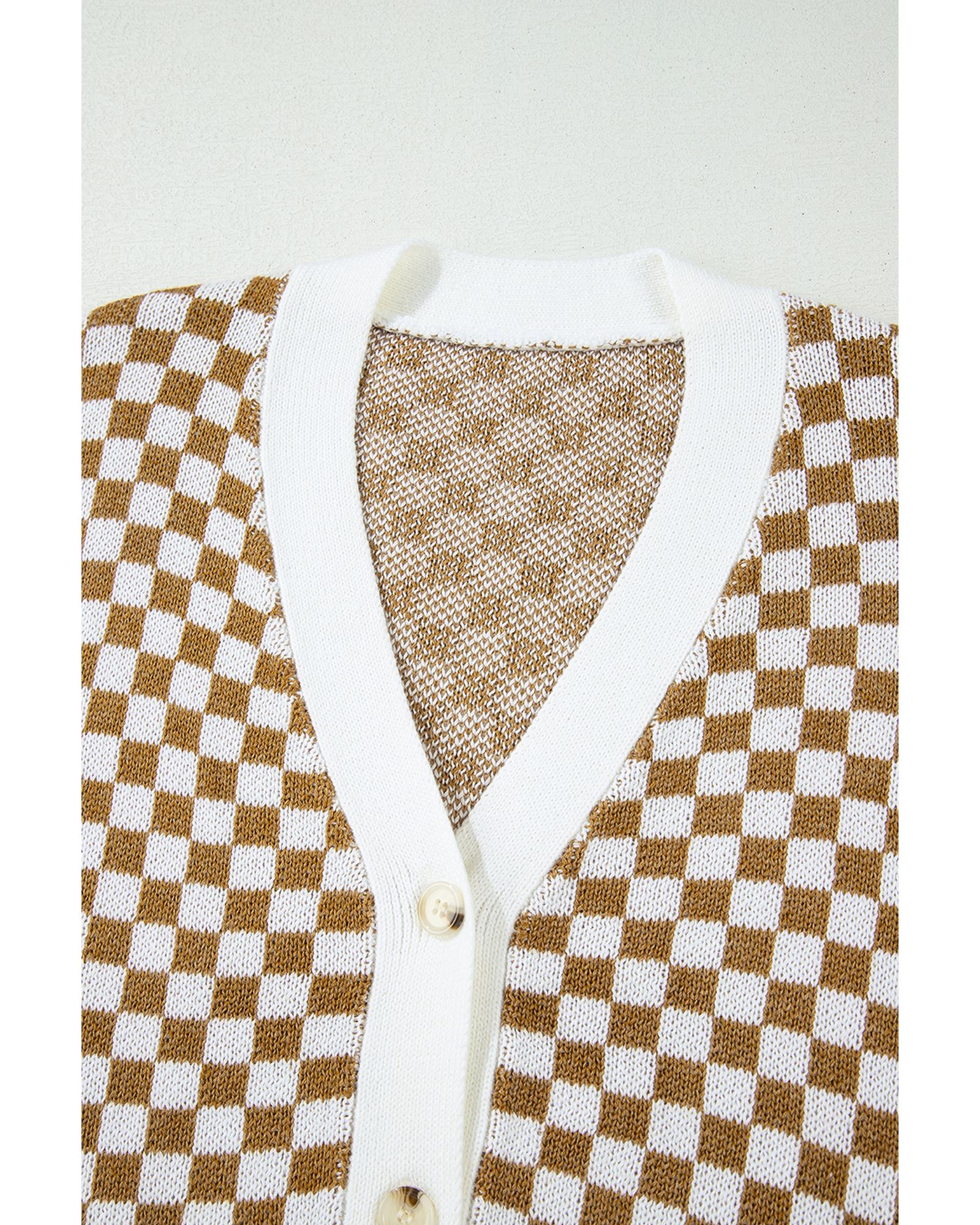 Brown Checkered Striped Patched Buttoned V Neck Cardigan – S