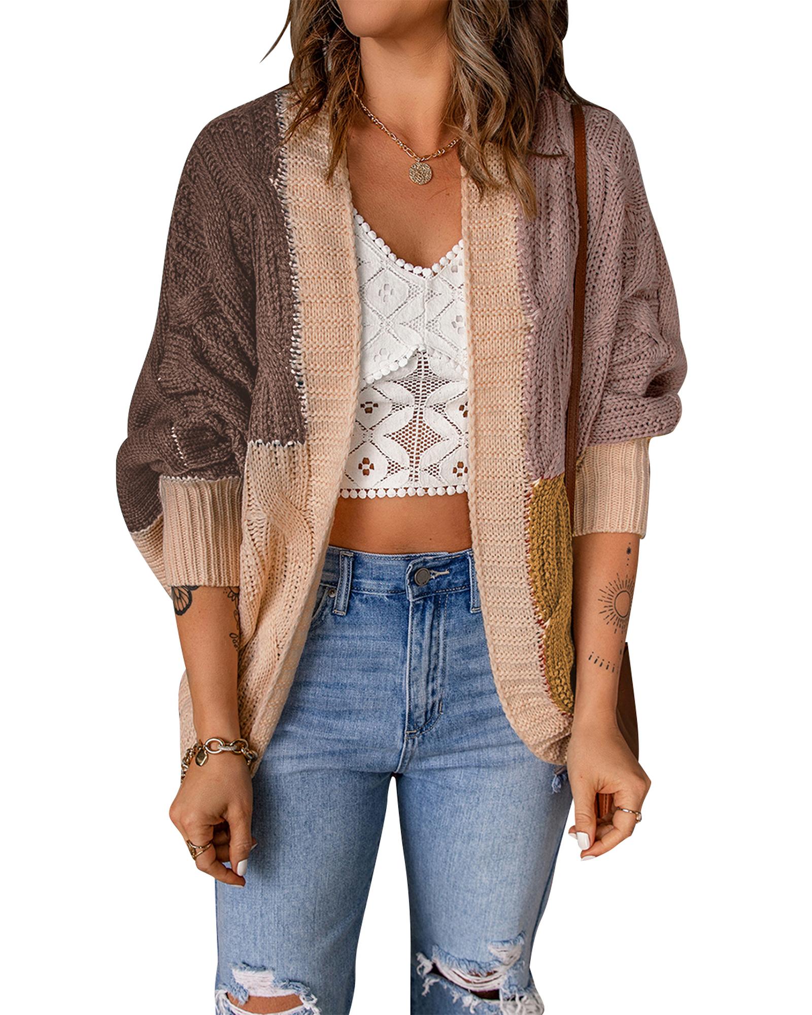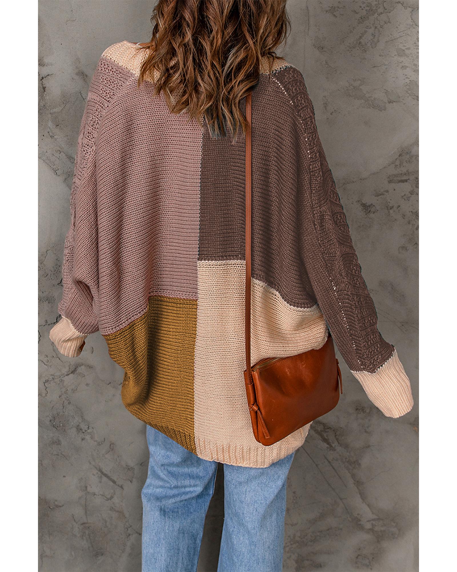 Brown Color Block Loose Open Front Knitted Cardigan – M