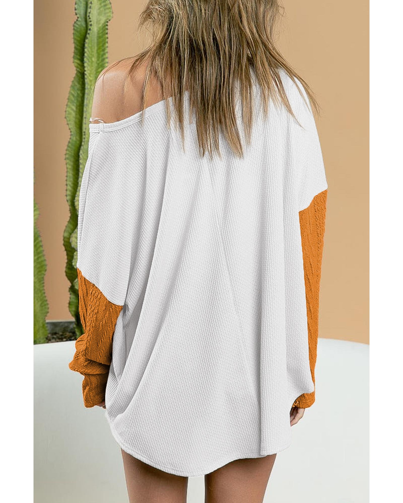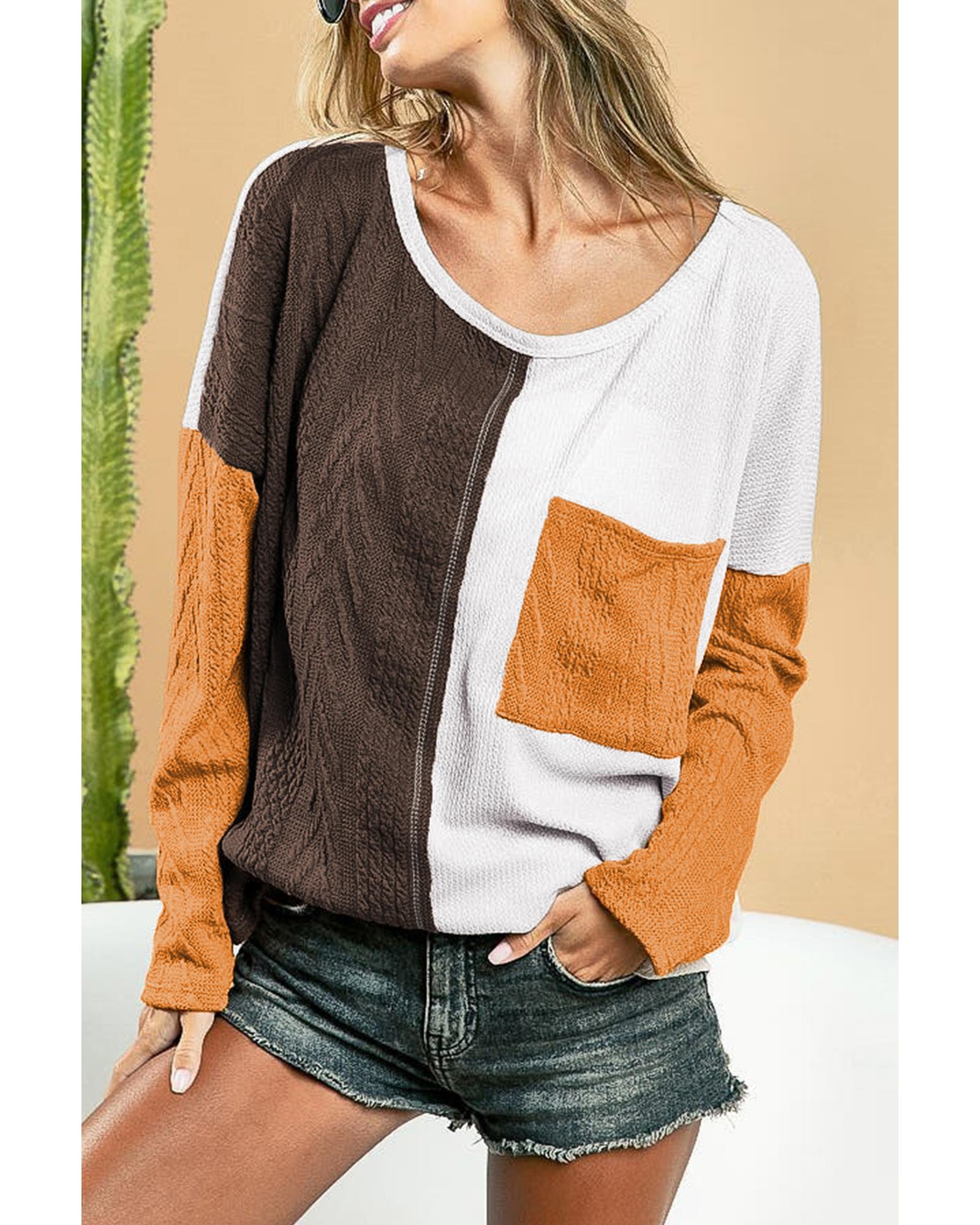 Brown Color Block Patchwork Chest Pocket Long Sleeve Top – S