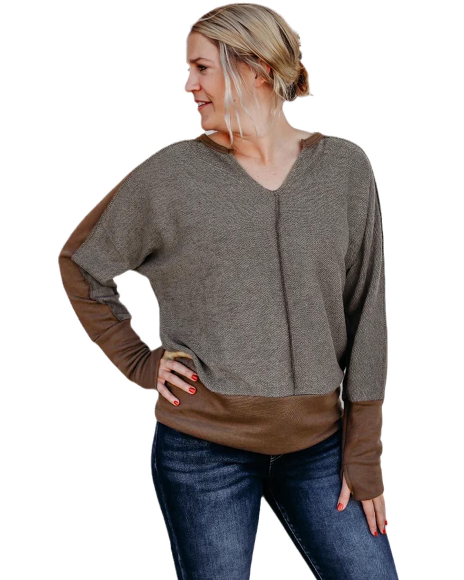 Brown Contrast Patchwork Thumbhole Sleeve Top – M