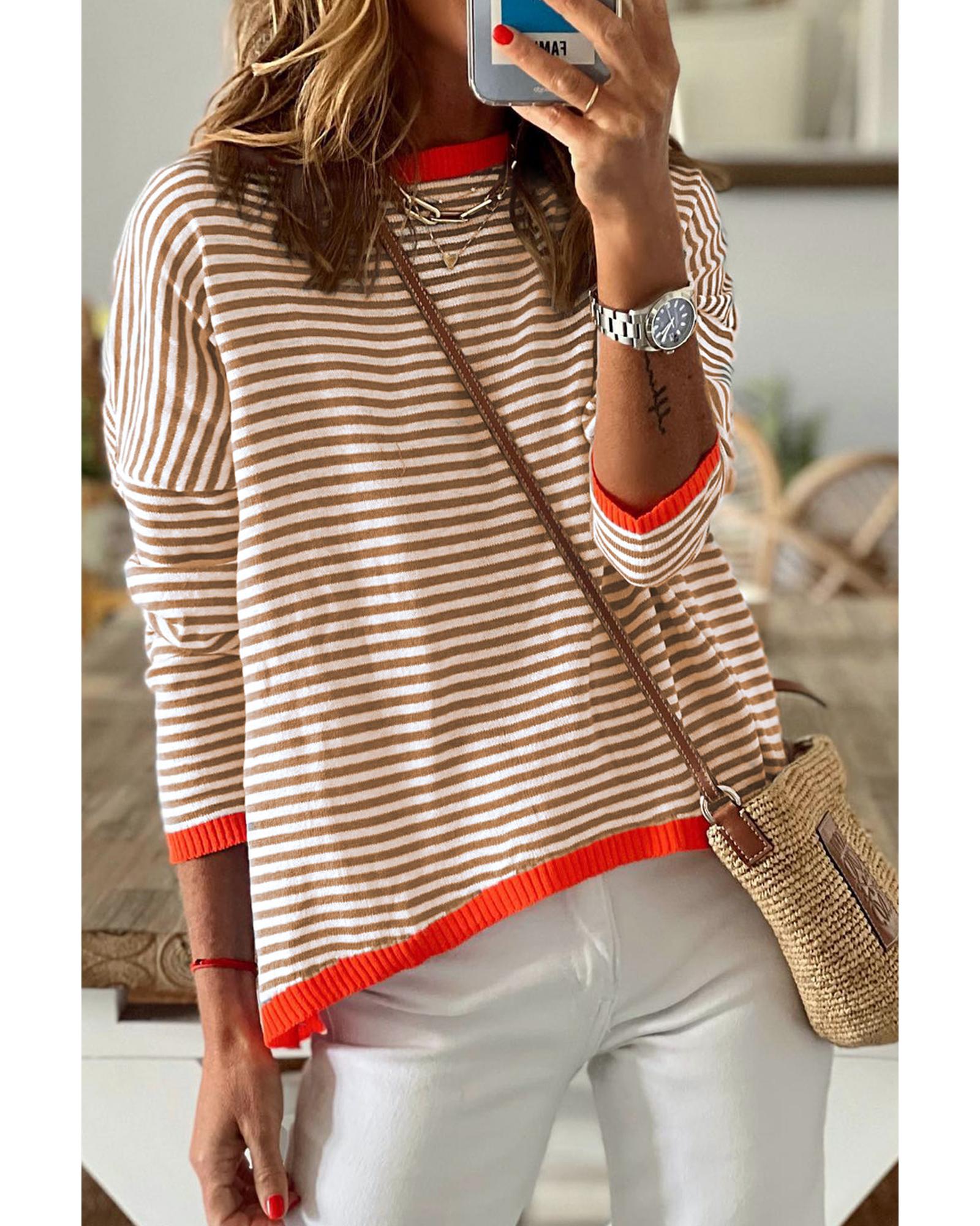Brown Contrast Trimmed Striped Drop Shoulder Sweater – L