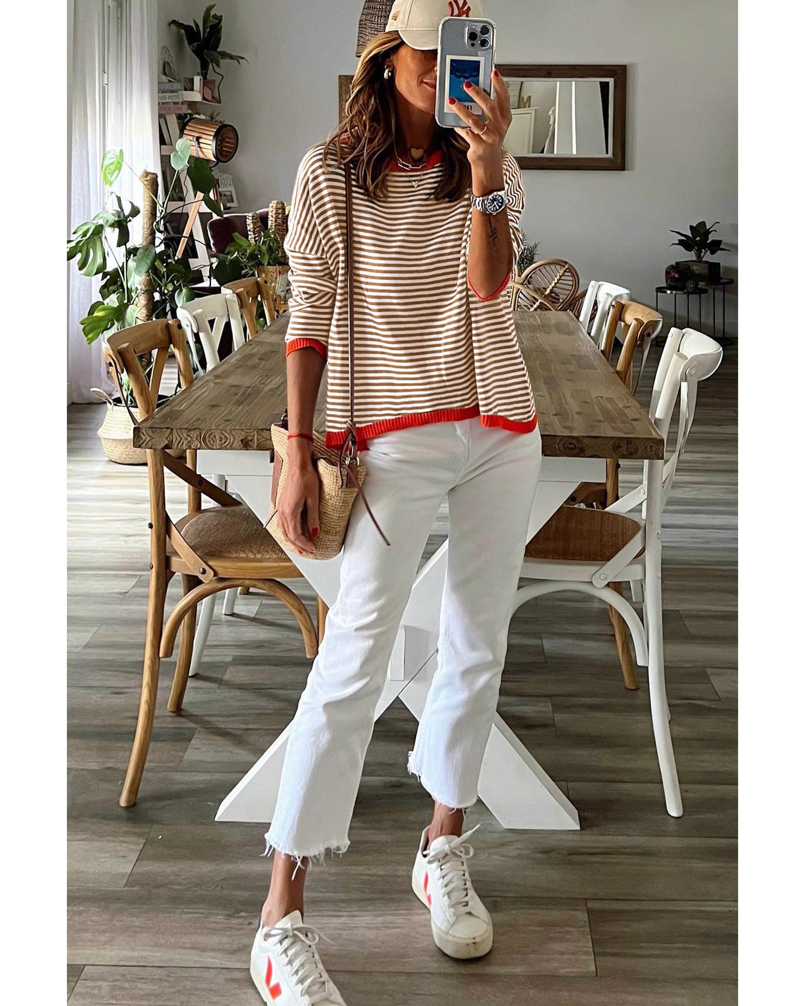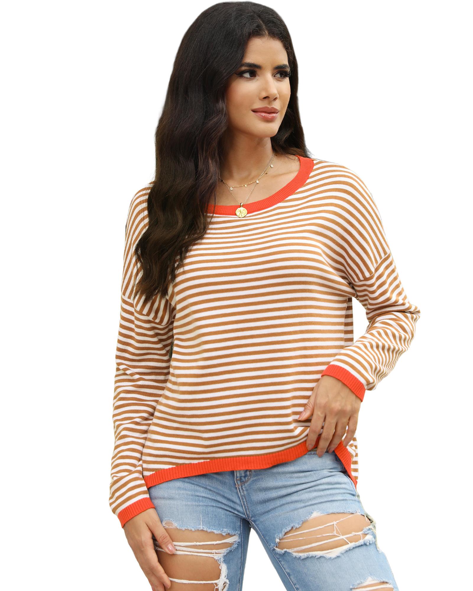 Classic striped sweater with contrast trimmed detailing Chic and comfortable drop shoulder design Regular fit style suitable for most body shapes Versatile piece that pairs well with jeans joggers or skirts Available in various sizes
