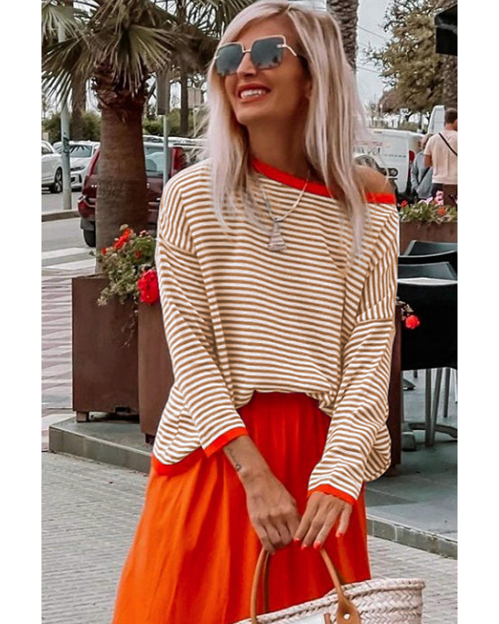 Brown Contrast Trimmed Striped Drop Shoulder Sweater – XL