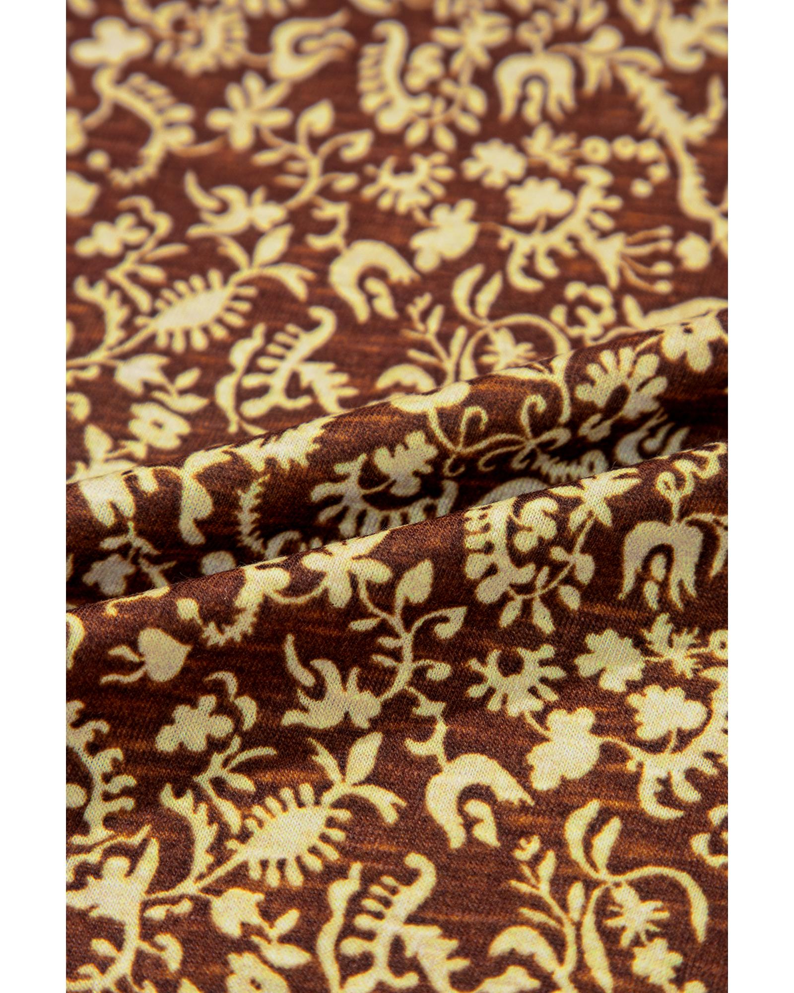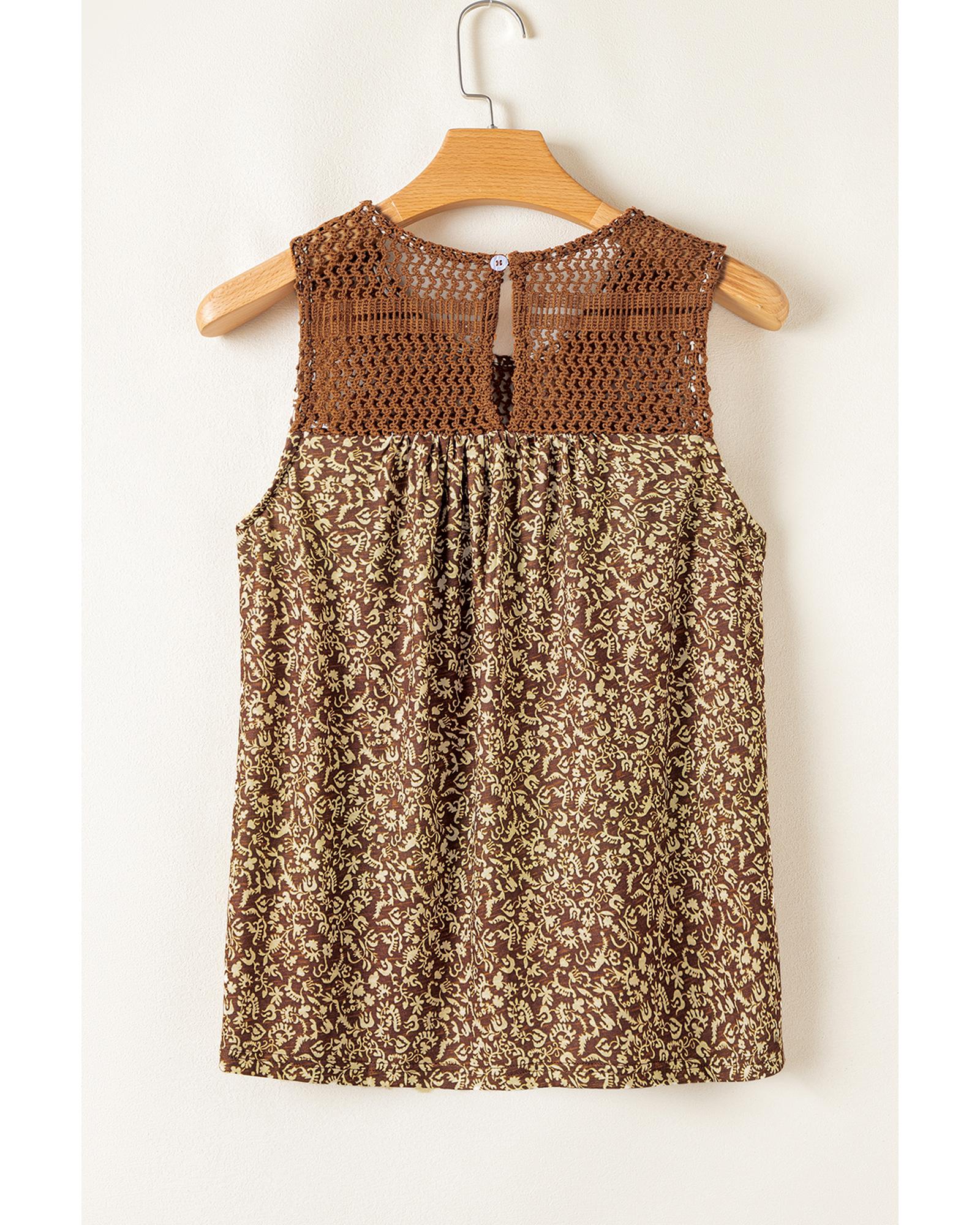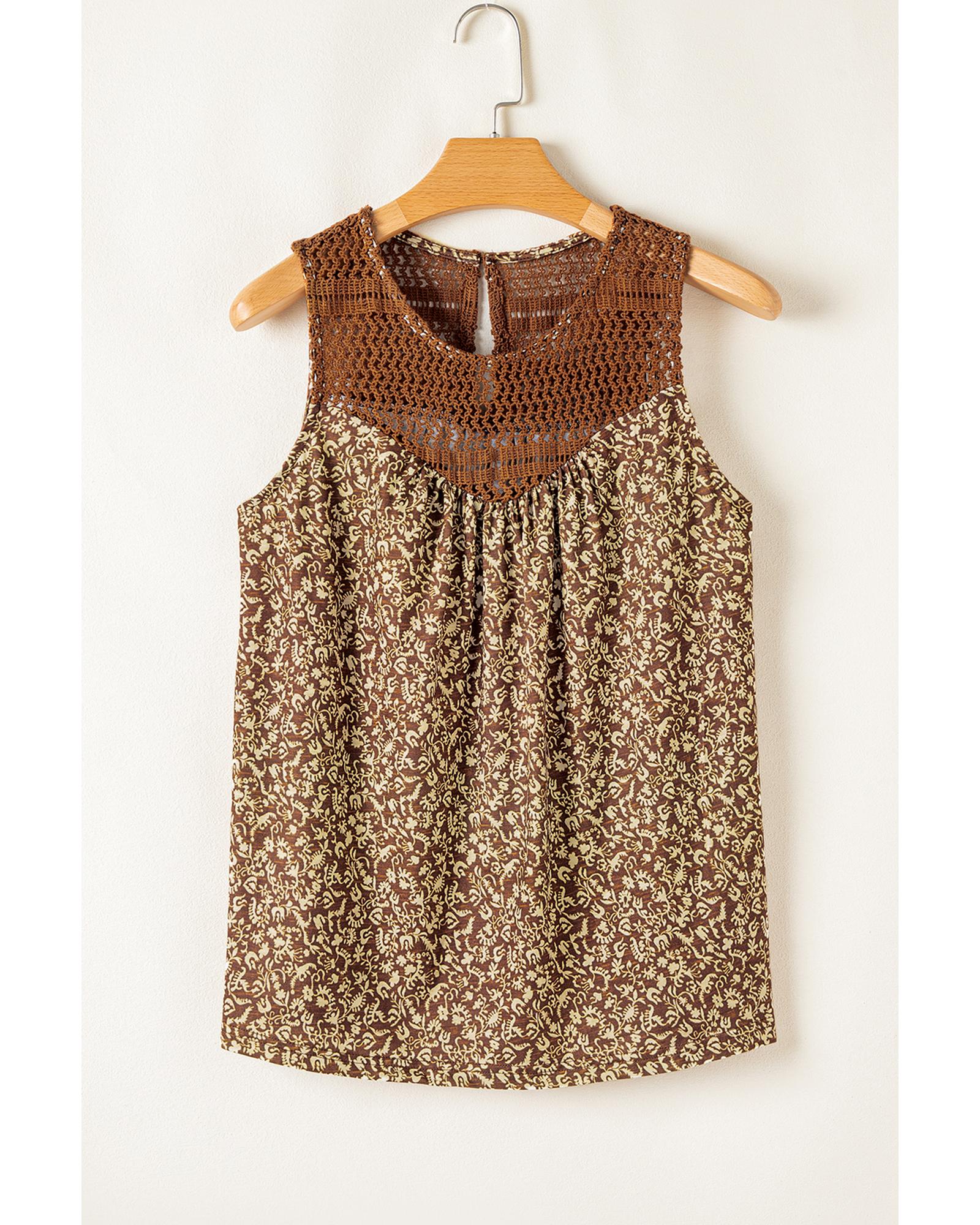 Brown Eyelet Knit Yoke Patchwork Printed Flowy Fit Tank Top – S