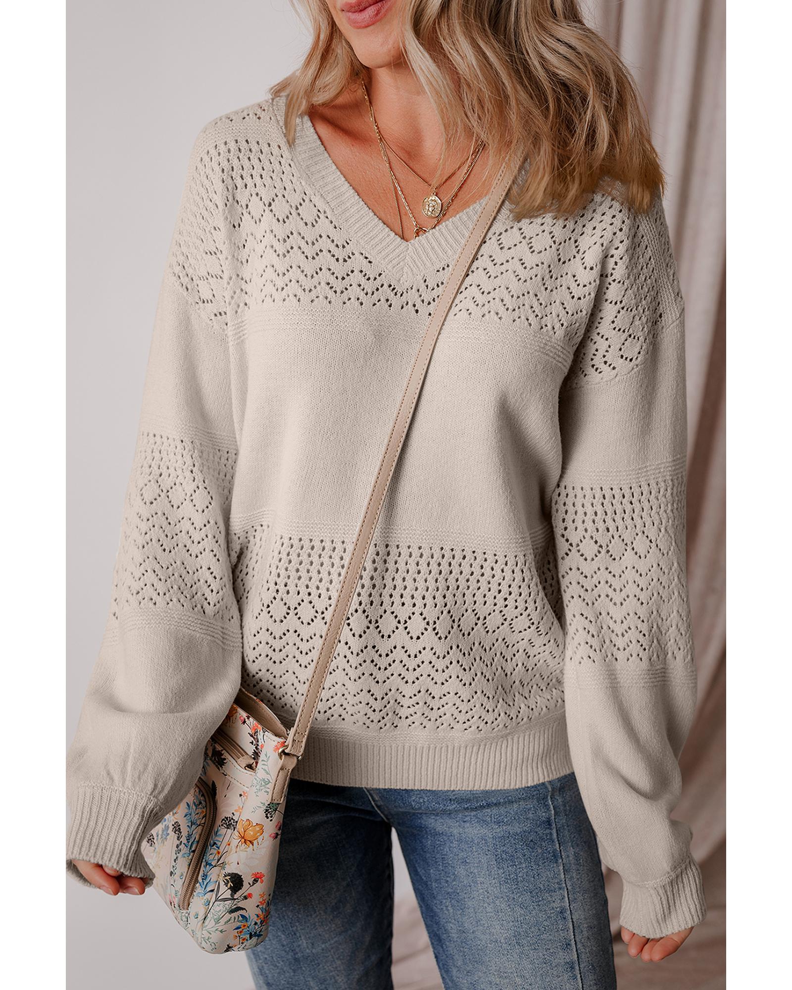 Brown Eyelet Pattern Detail V Neck Drop Shoulder Sweater – 2XL