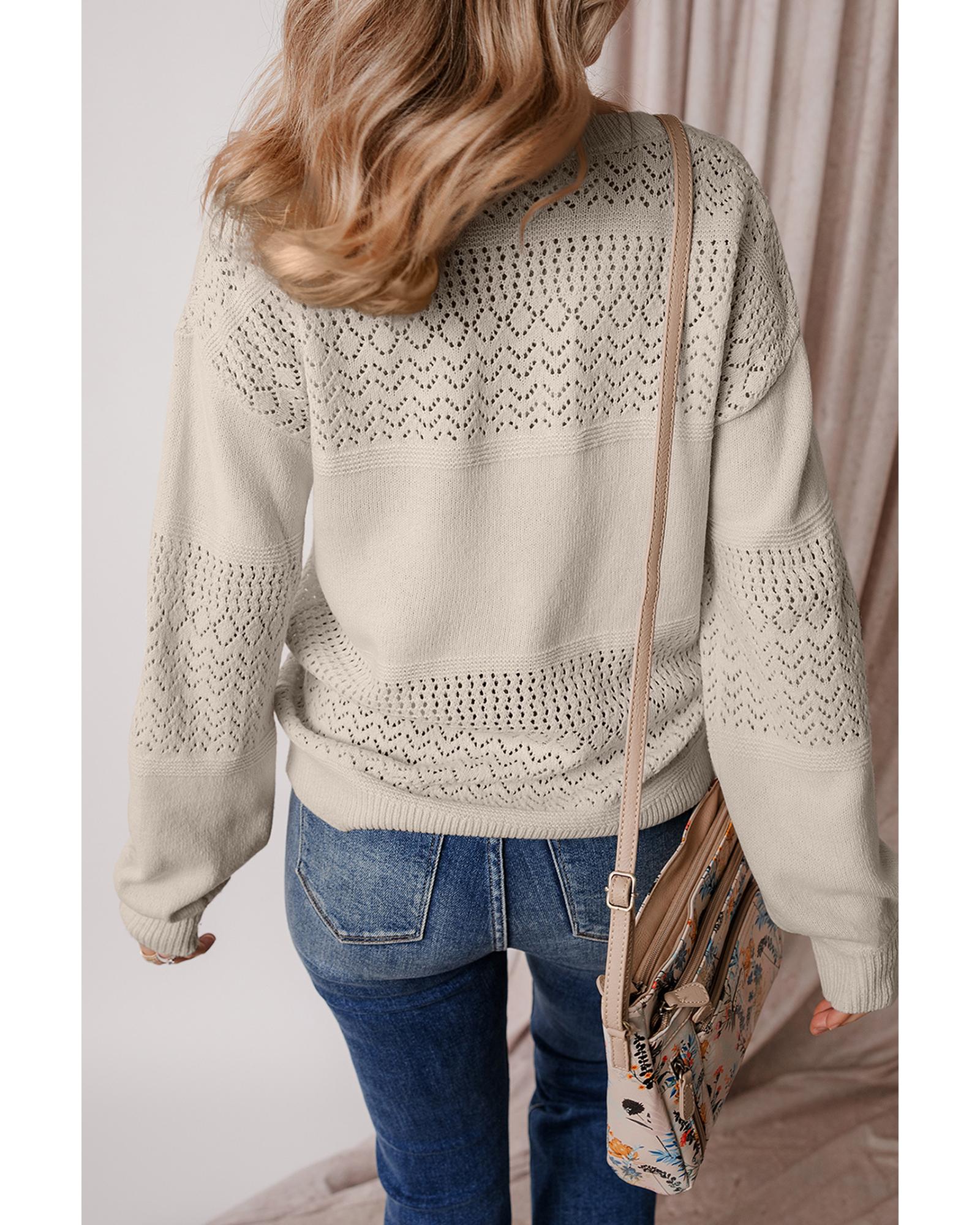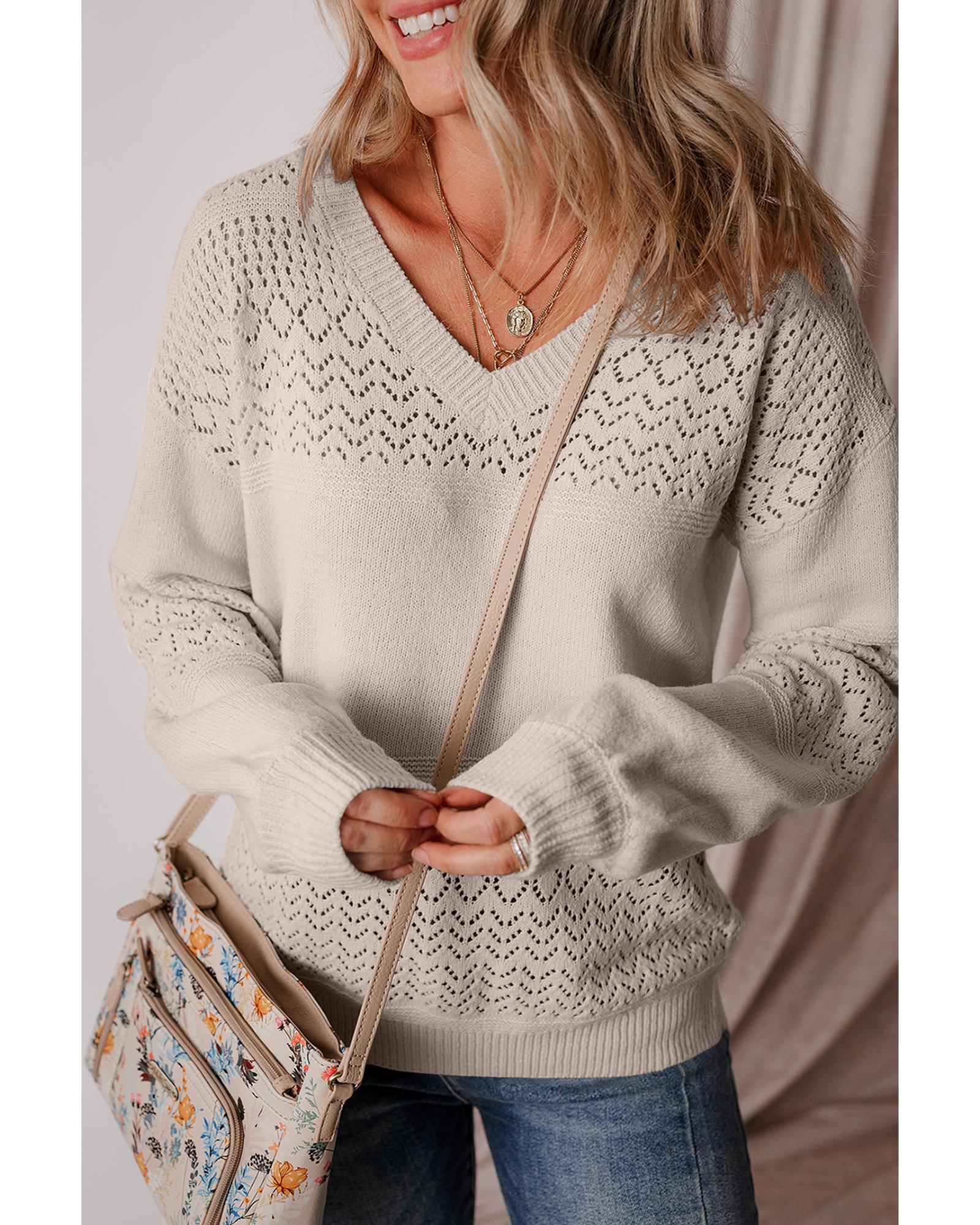 Brown Eyelet Pattern Detail V Neck Drop Shoulder Sweater – L