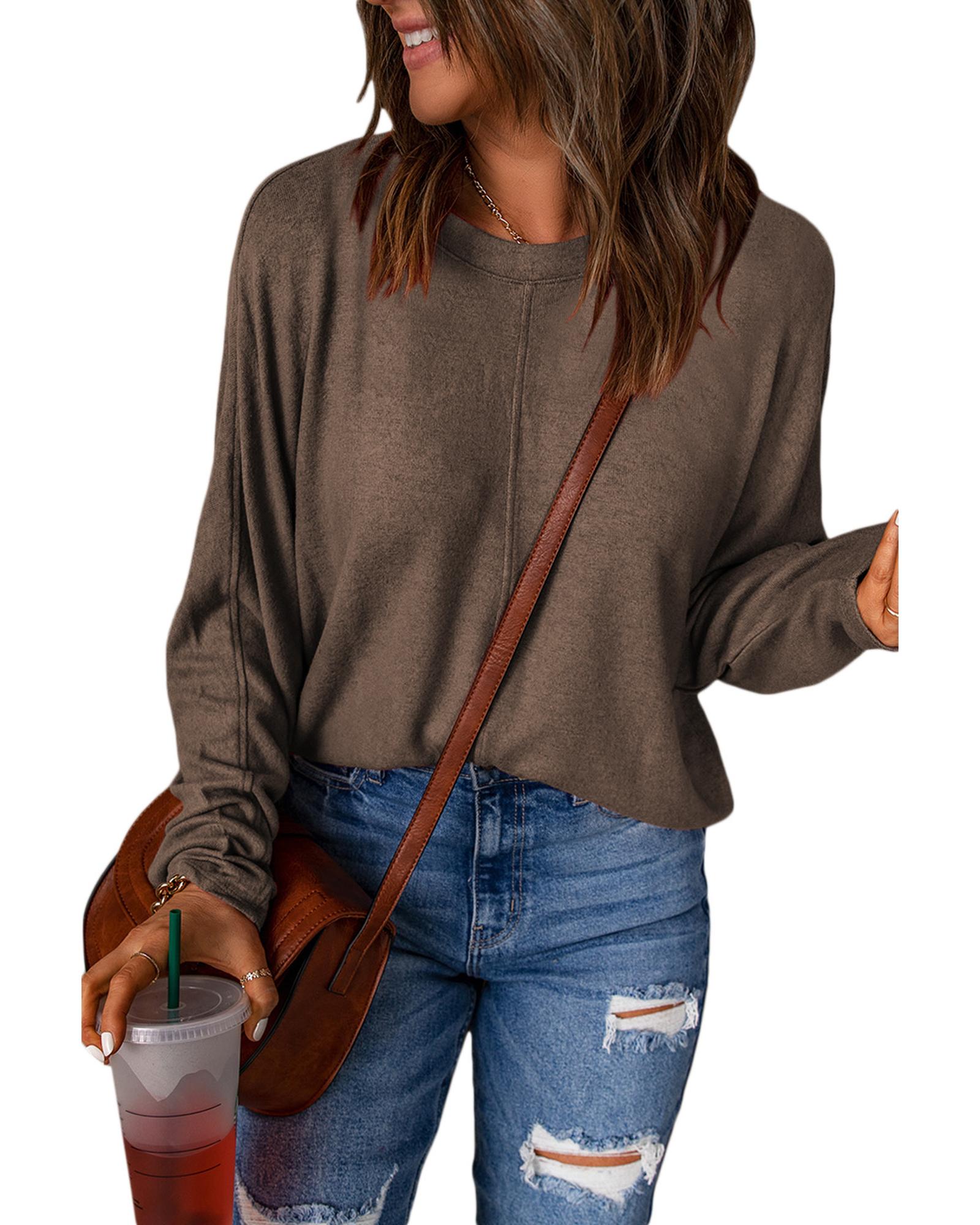 Brown Fiery Solid Color Patchwork Long Sleeve Top – L