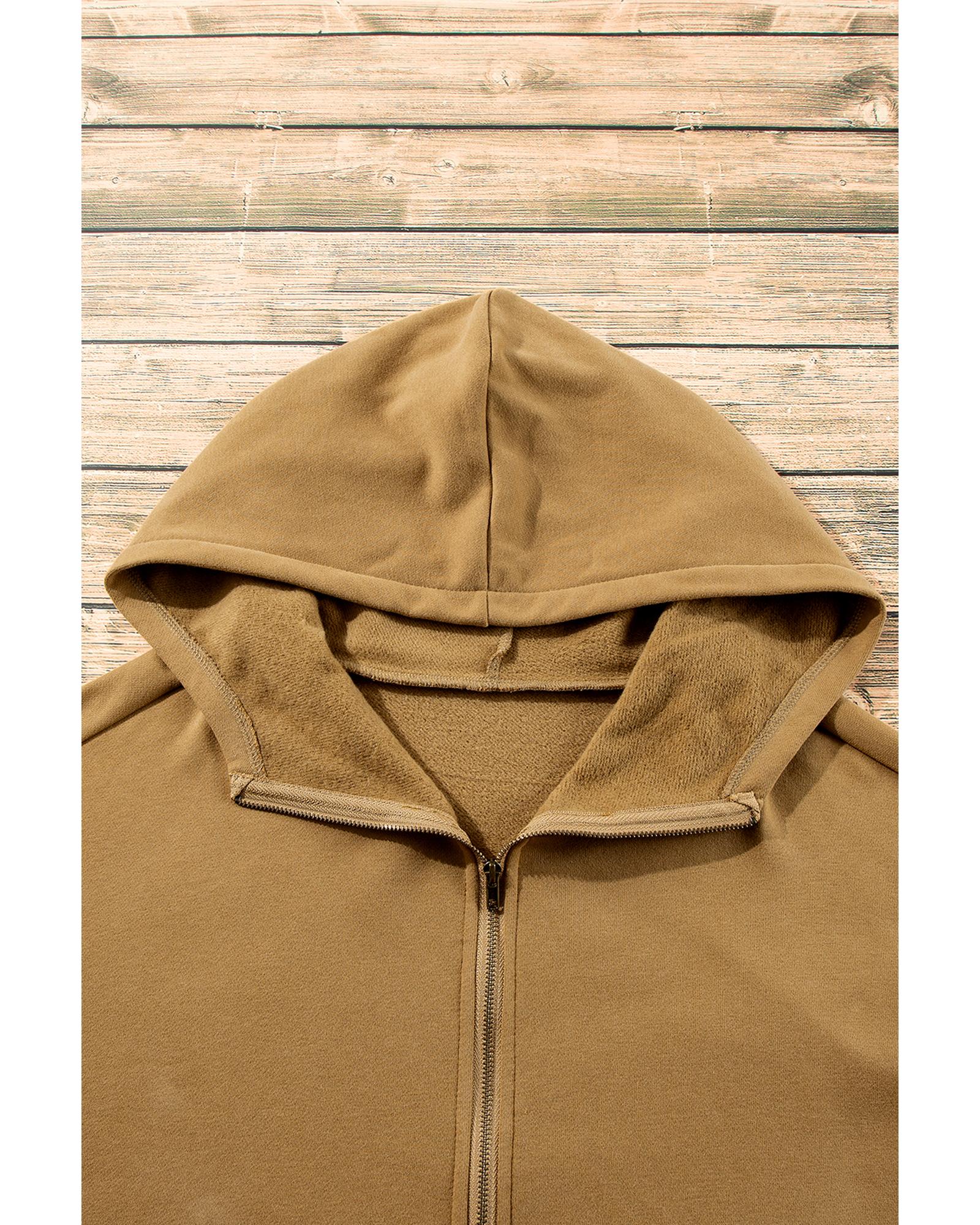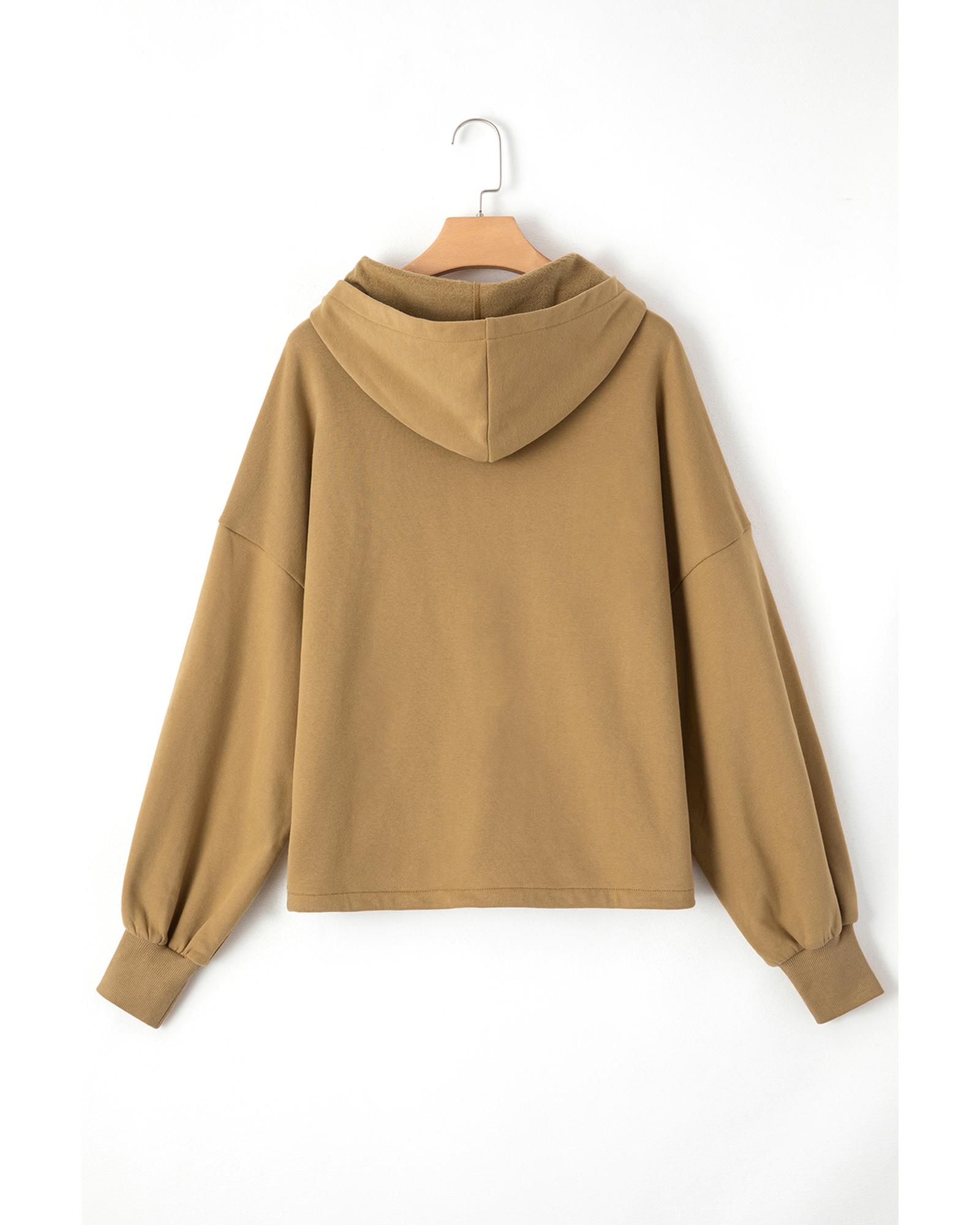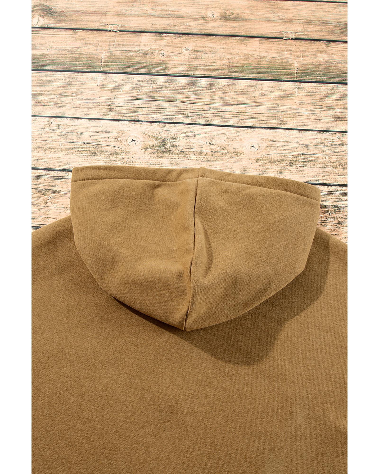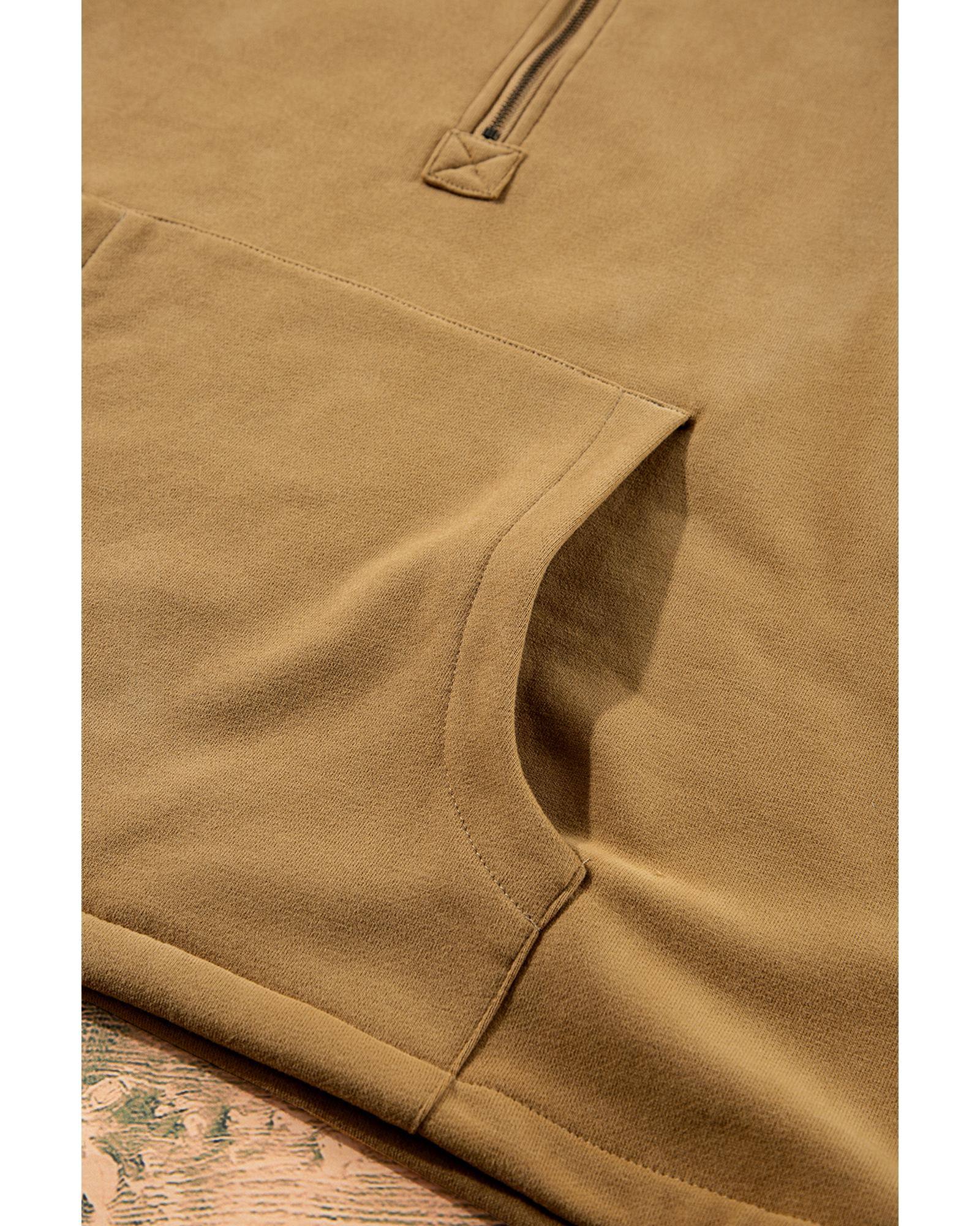 Brown Fleece Lined Half Zipper Kangaroo Pockets Loose Hoodie – L