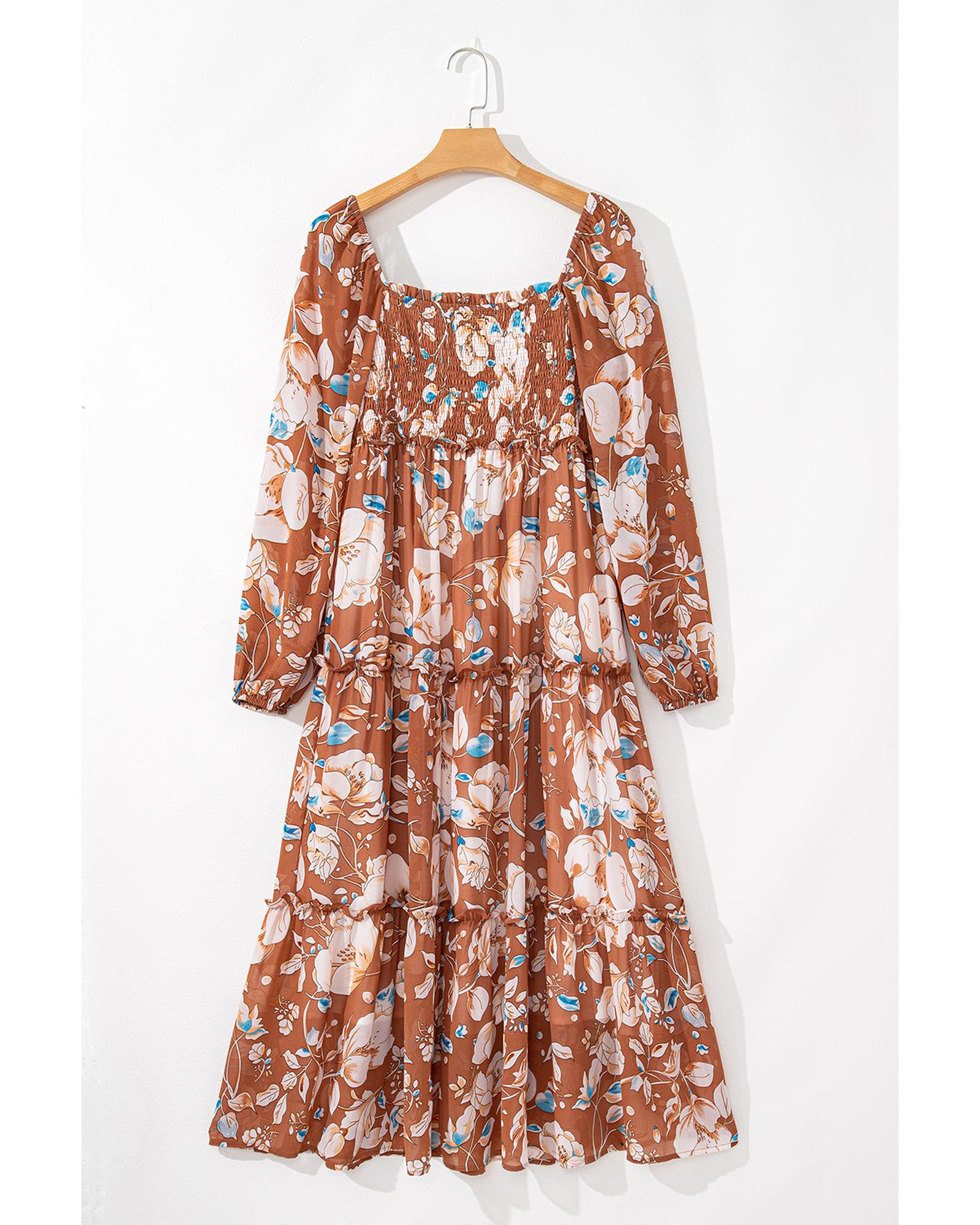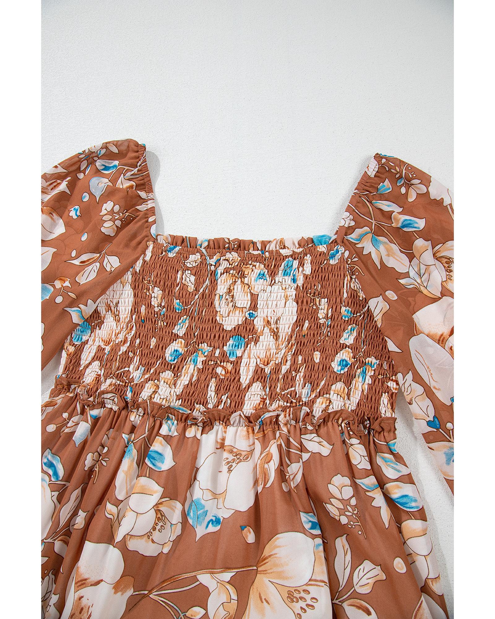 - Brown Floral Print Shirred Square Neck High Waist Maxi Dress