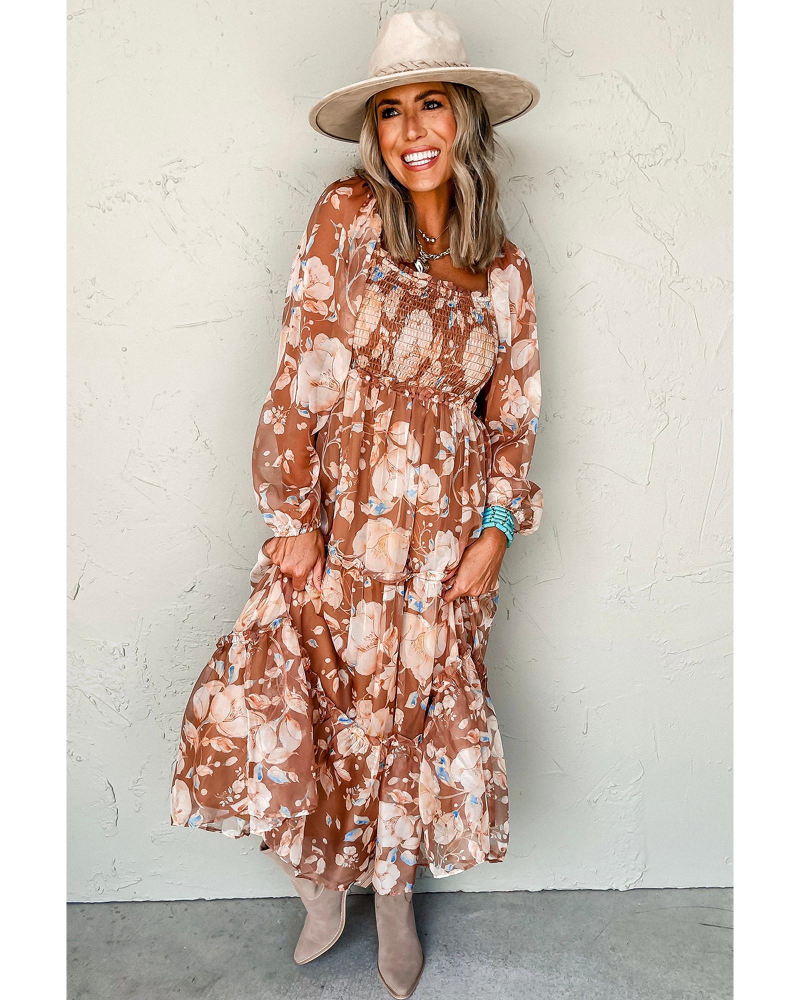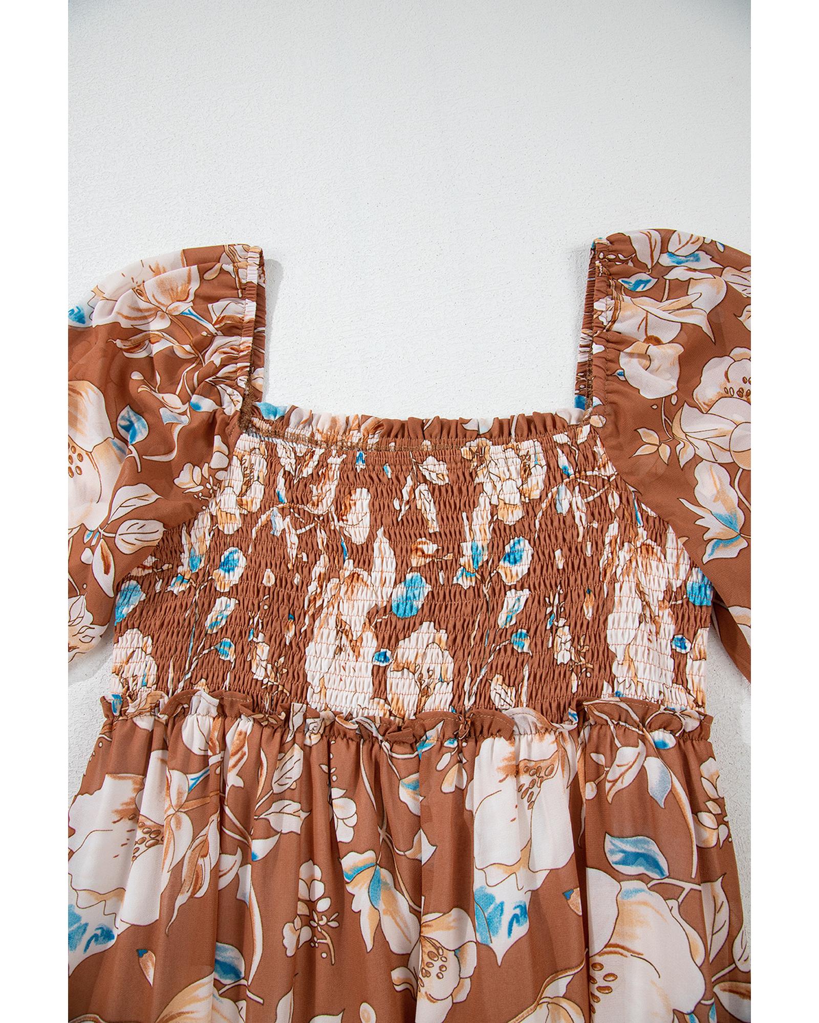 • Brown Floral Print Shirred Square Neck High Waist Maxi Dress