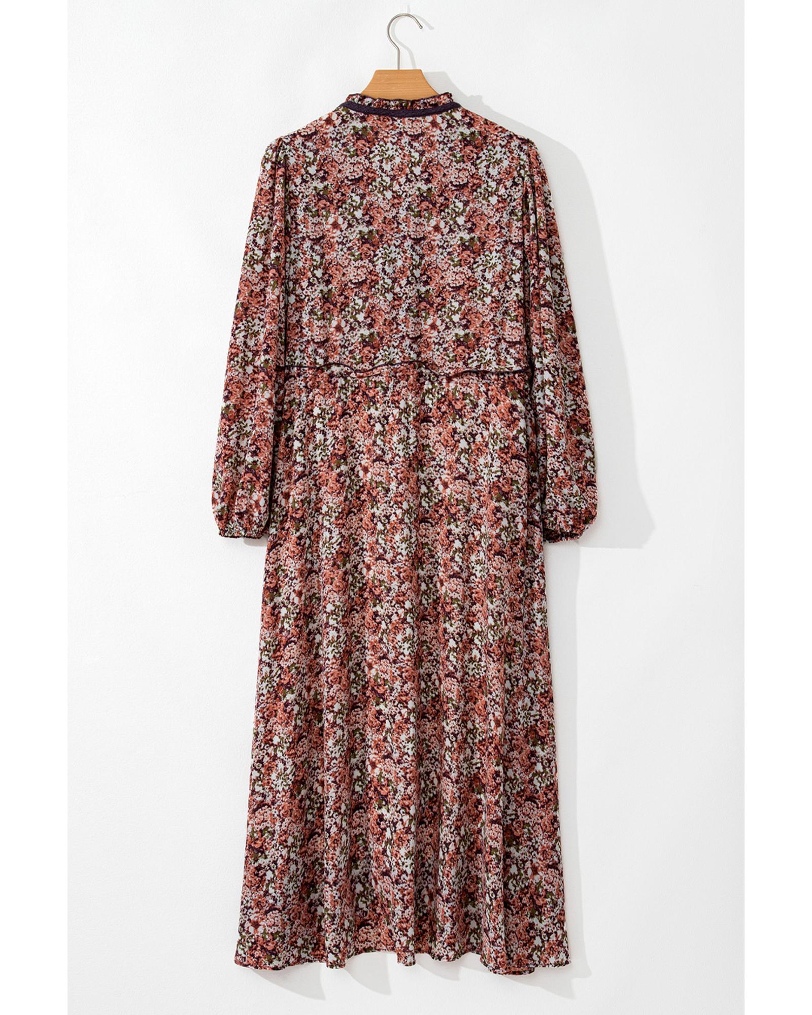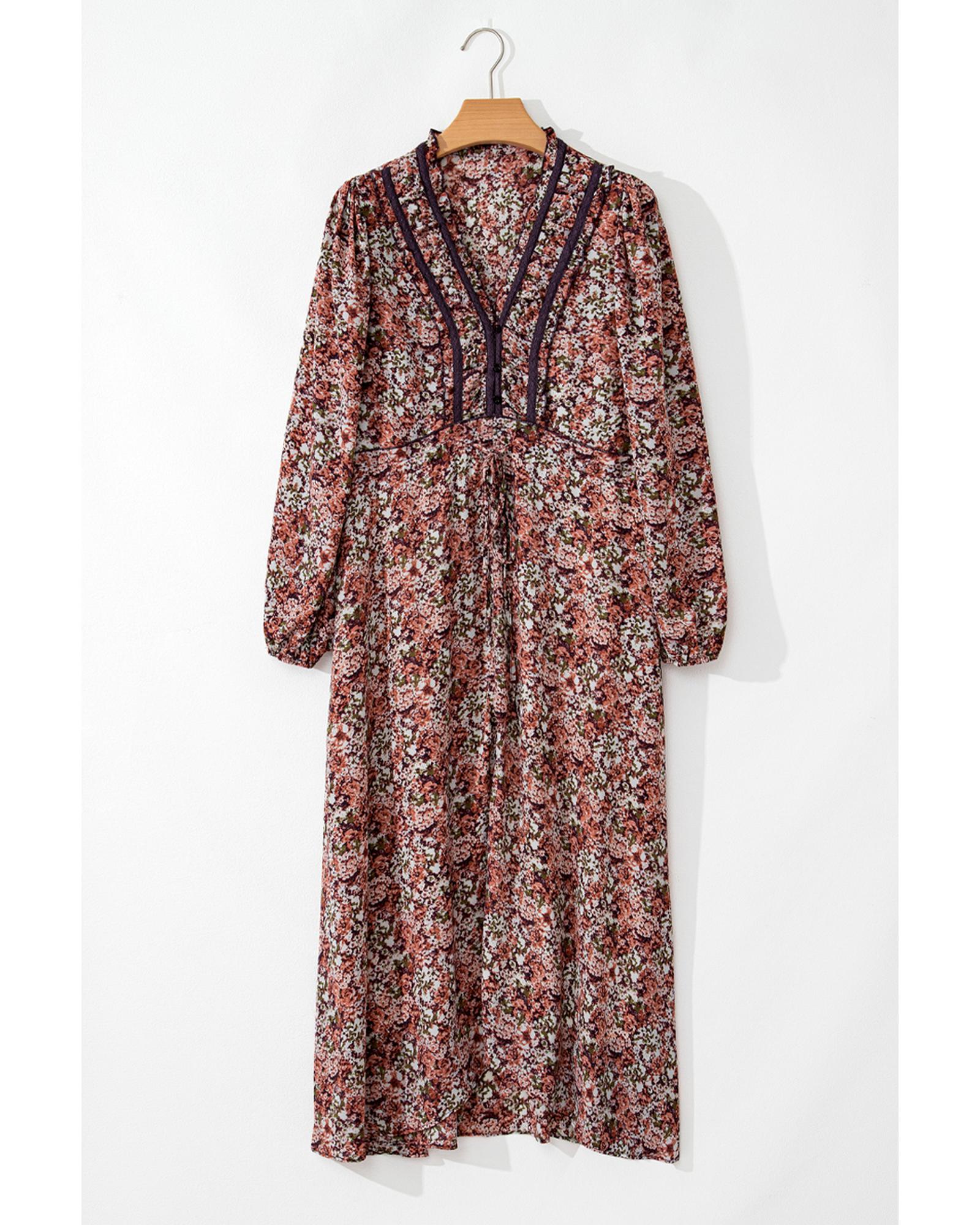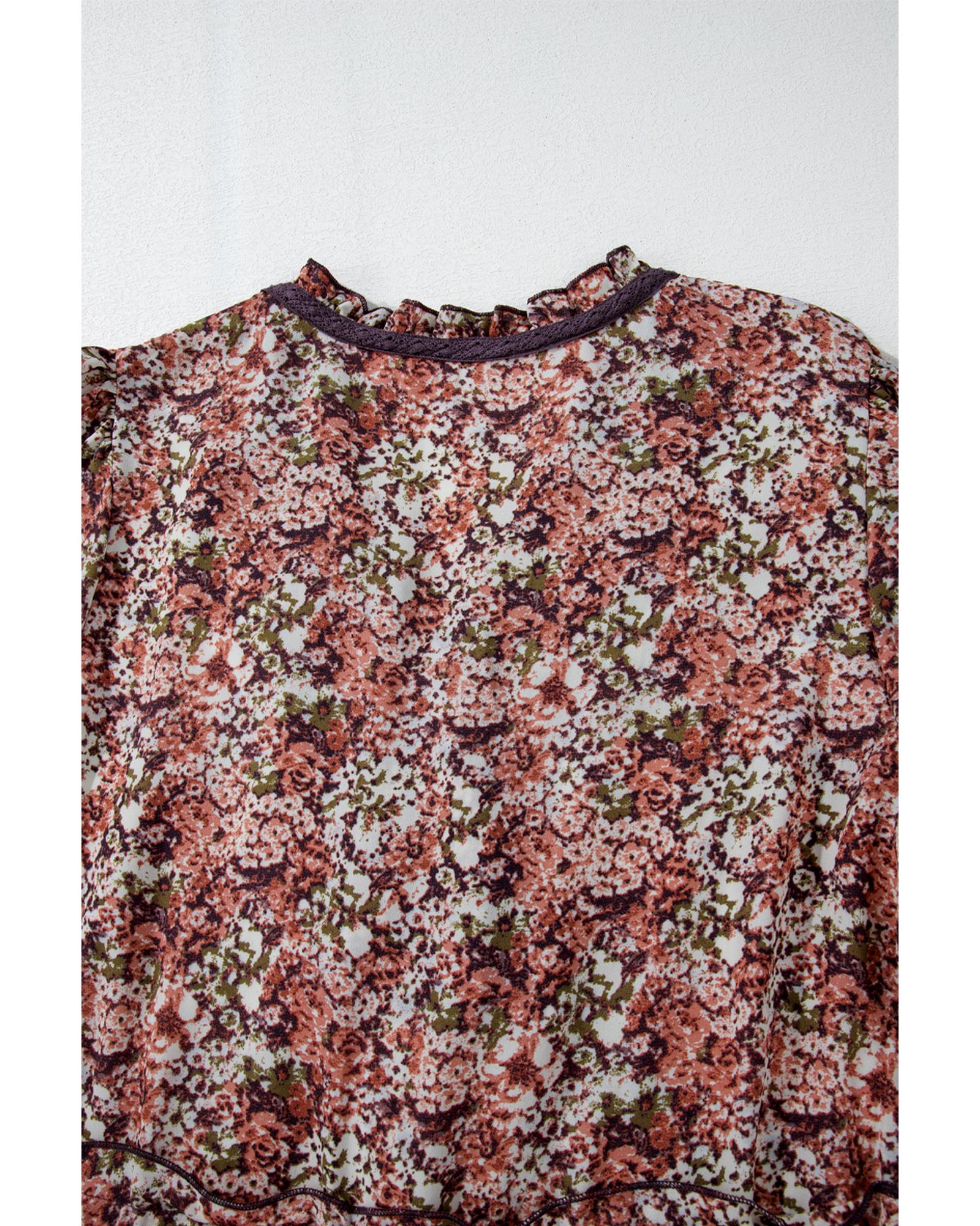 Brown Floral Print Split Front Tiered Frilled V Neck Midi Dress – L