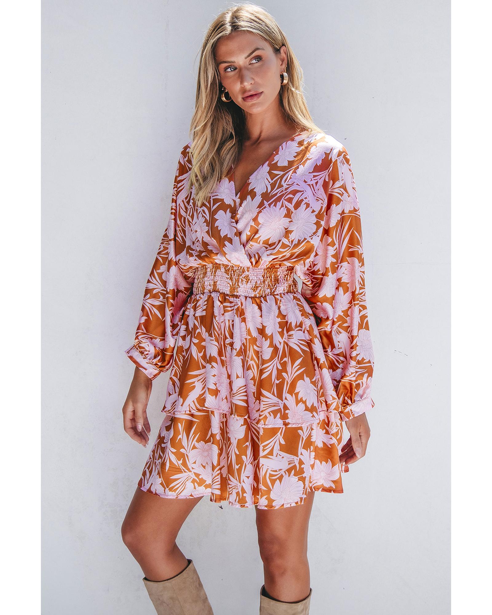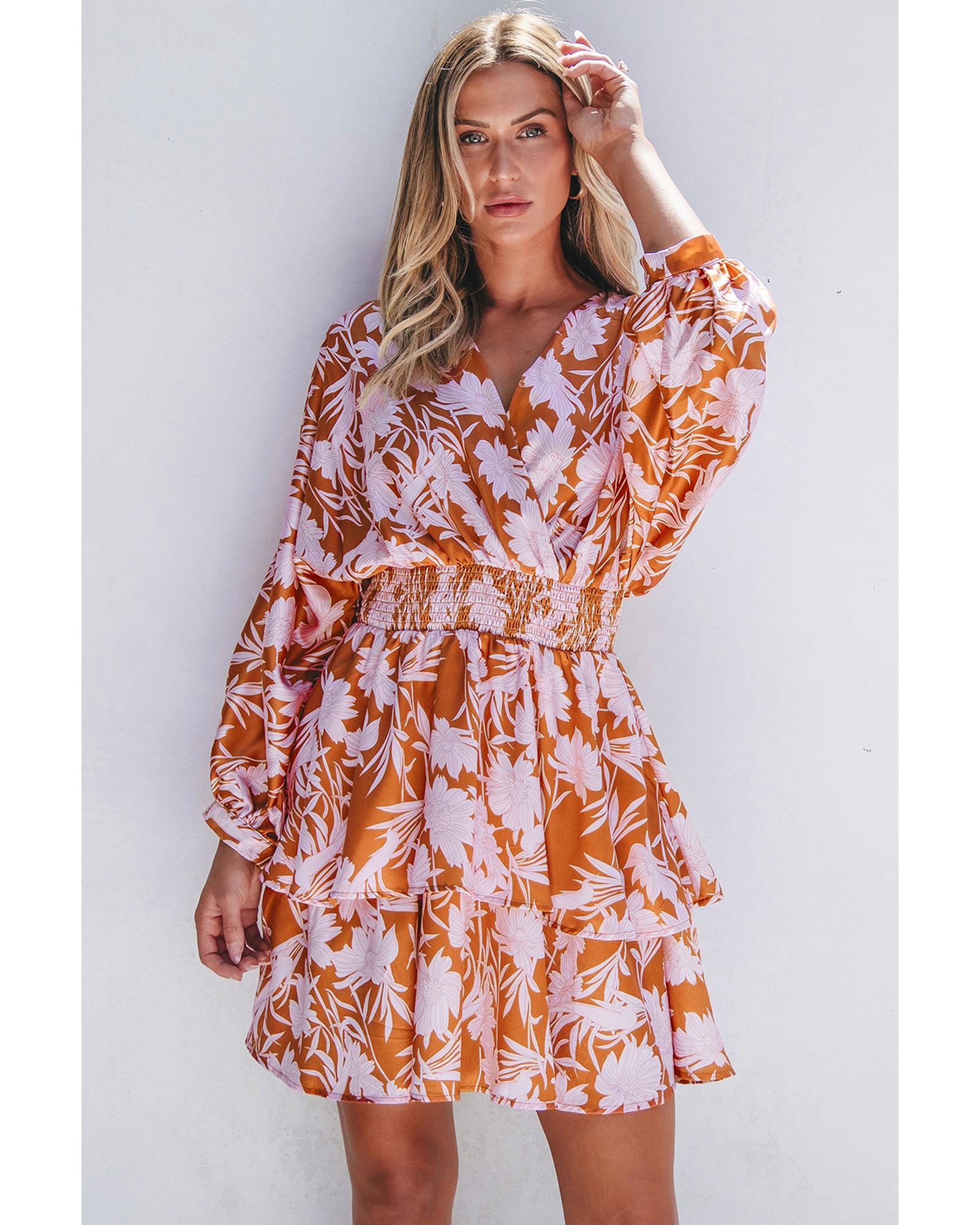 Brown Floral Puff Sleeve Smocked Waist Layered Dress – S
