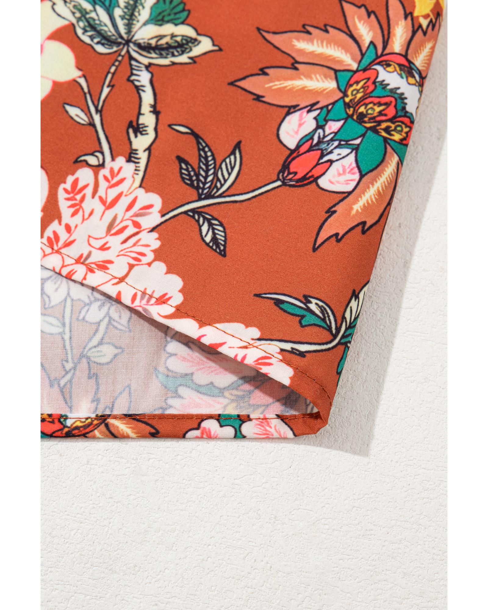 Brown Floral Stitched V Neck Frilled Trim Puff Short Sleeve Blouse – 4X