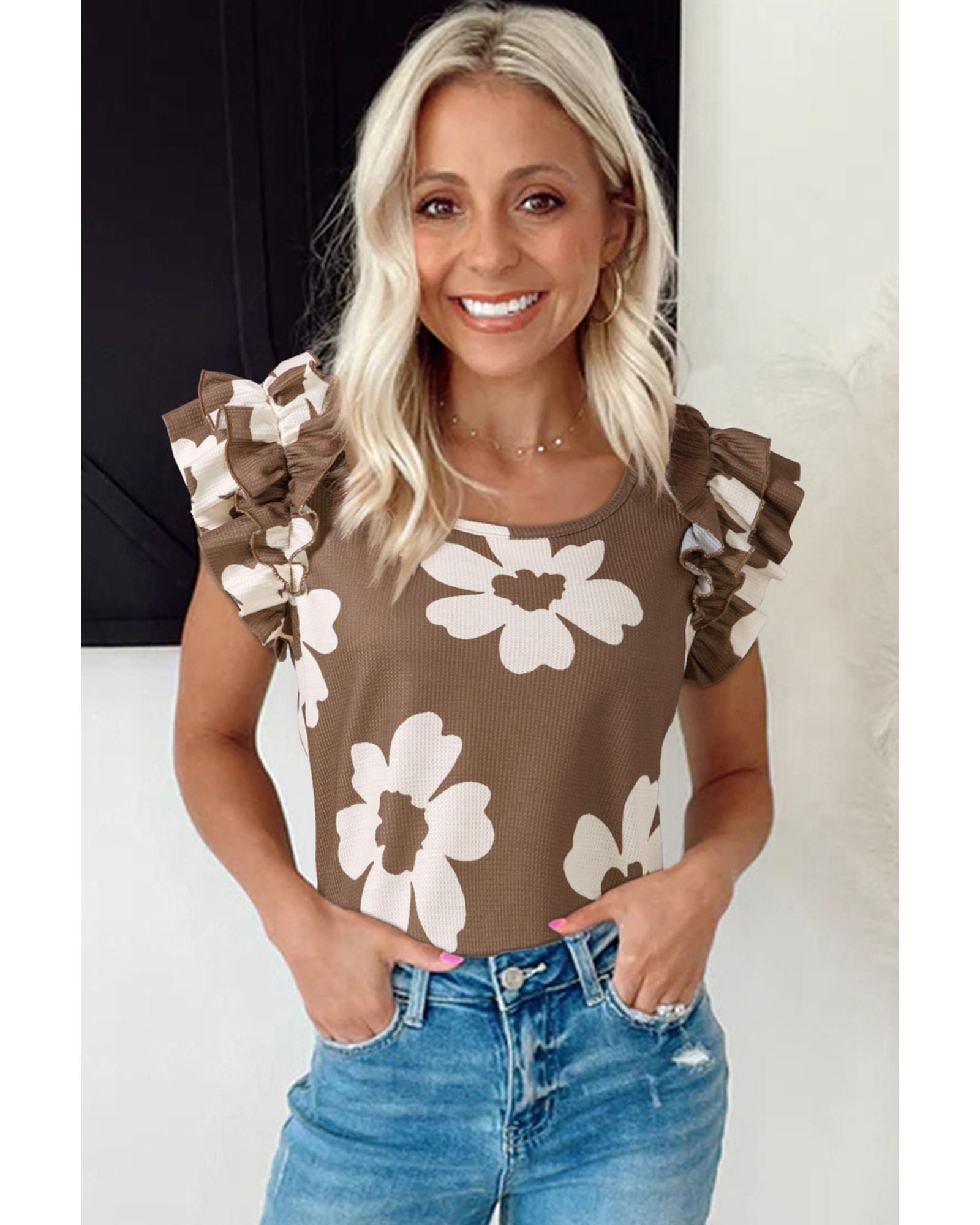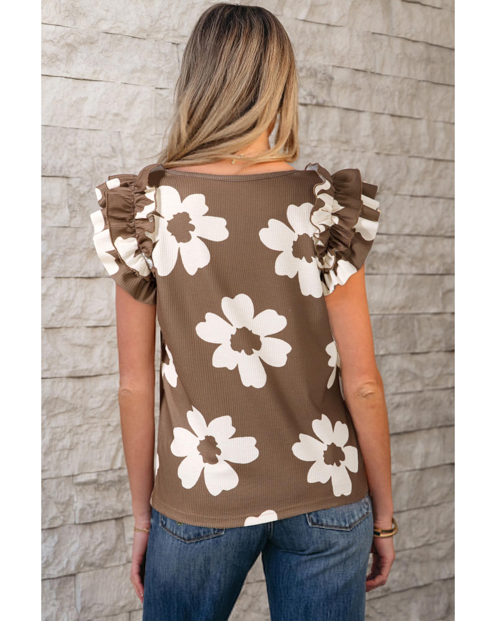 Brown Floral Textured Ruffled Short Sleeve Square Neck Blouse – S