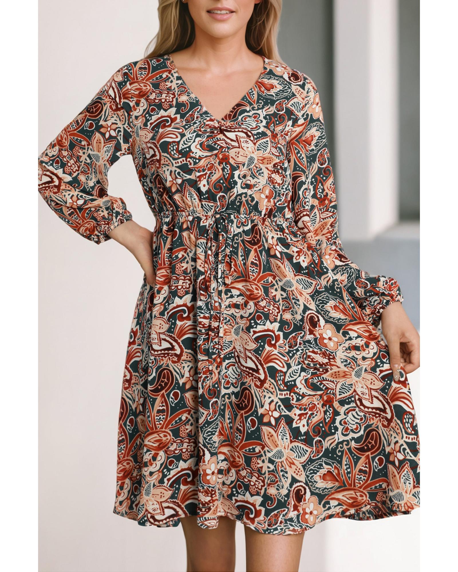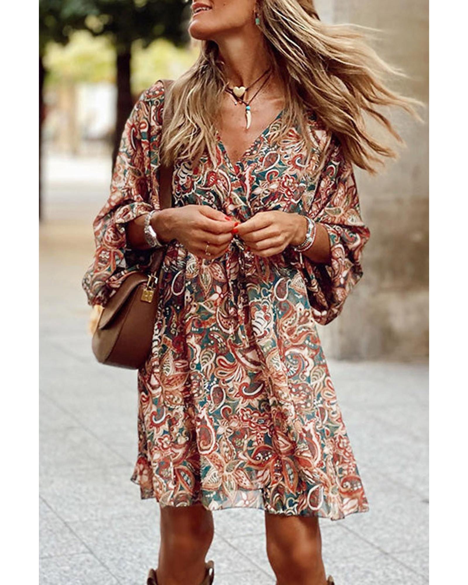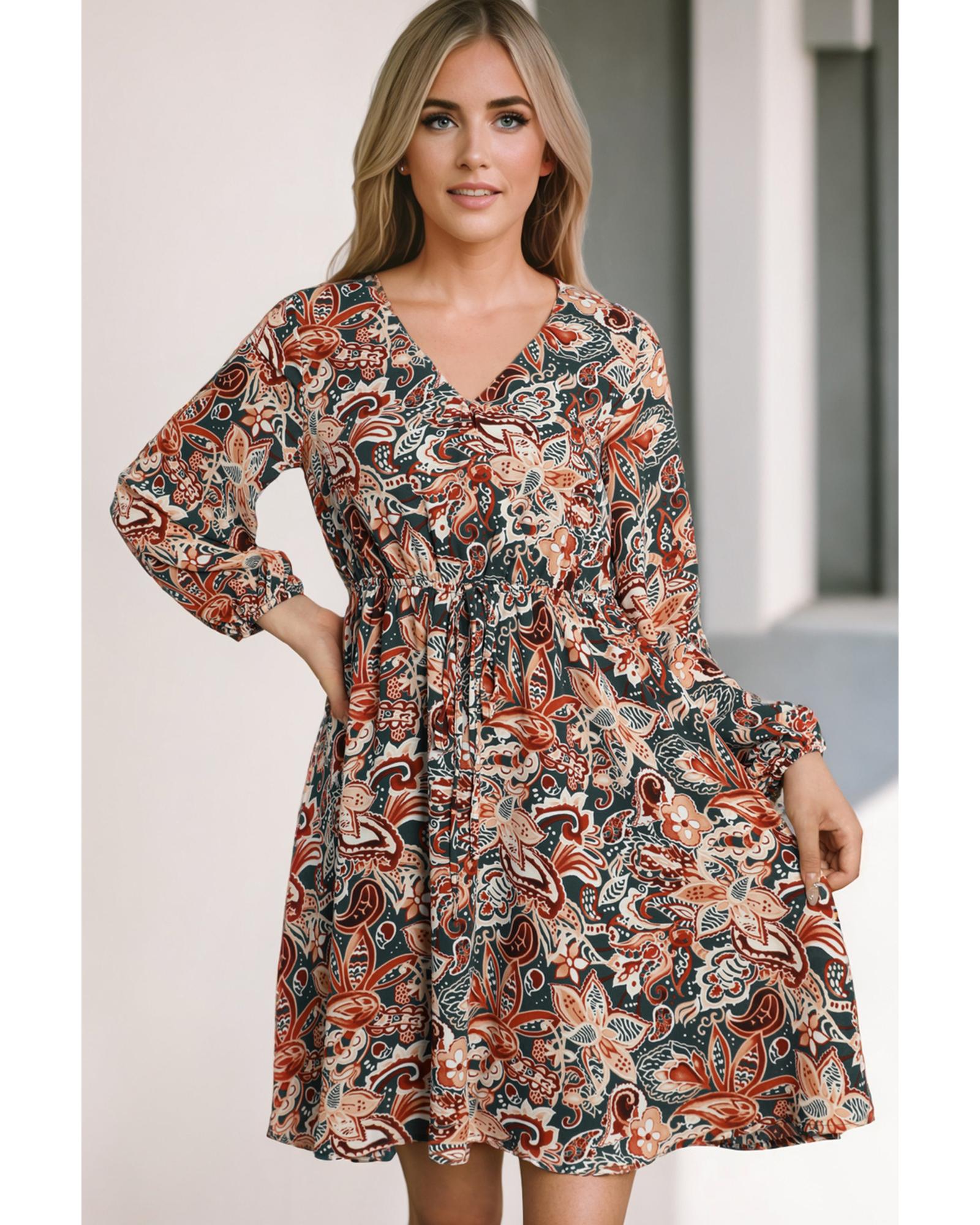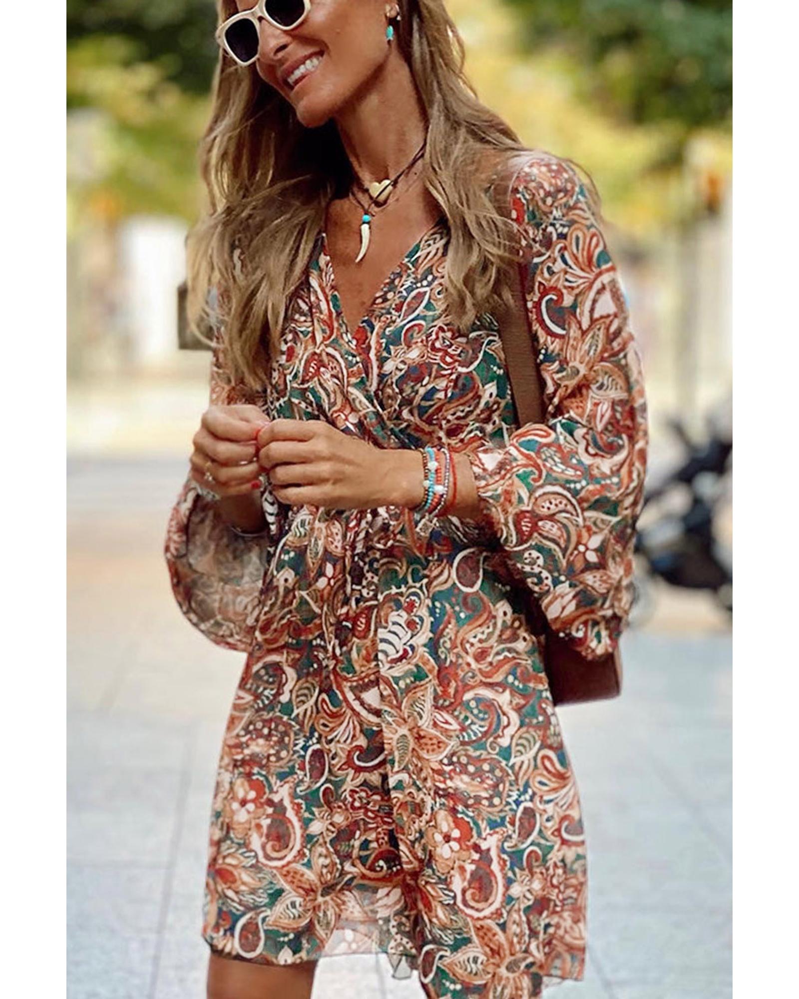 Brown Geometric Print Long Sleeve Surplice Flowy Dress – S