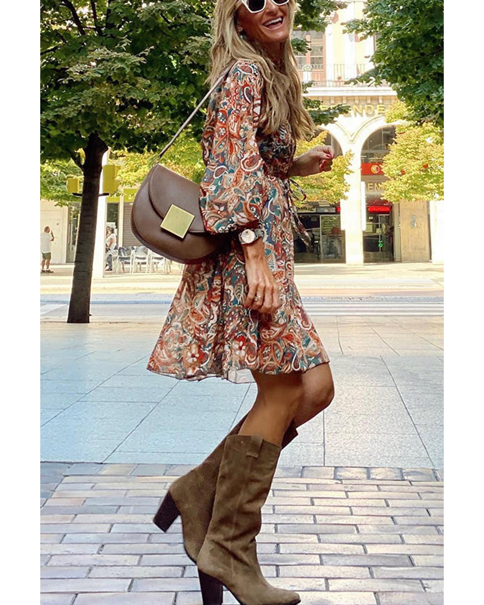 Brown Geometric Print Long Sleeve Surplice Flowy Dress – XL