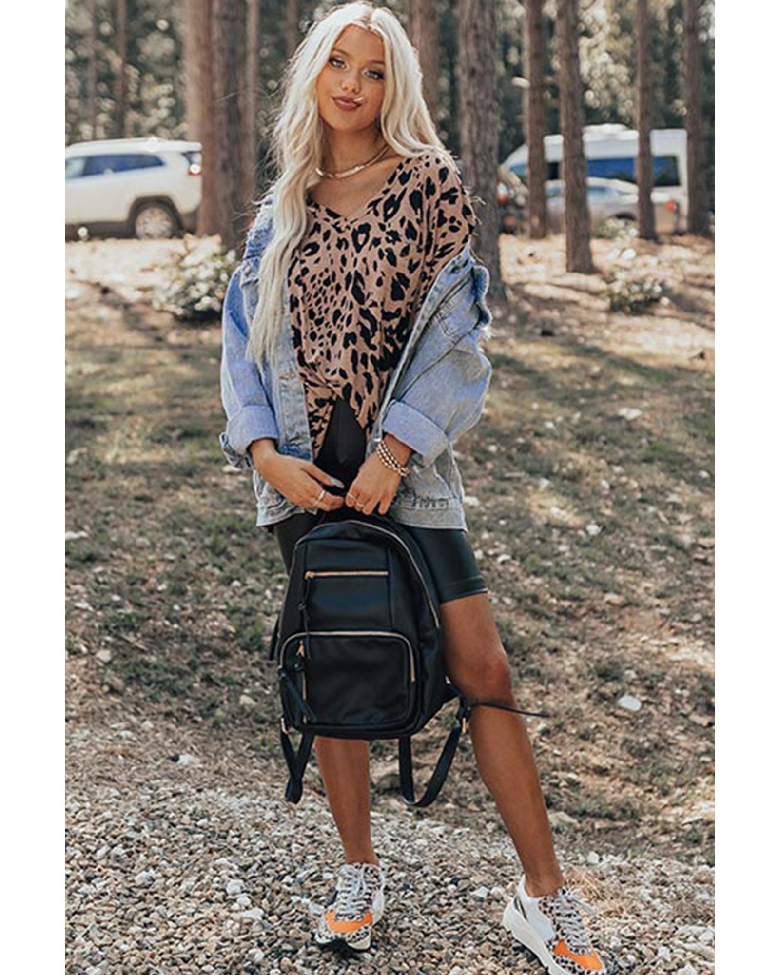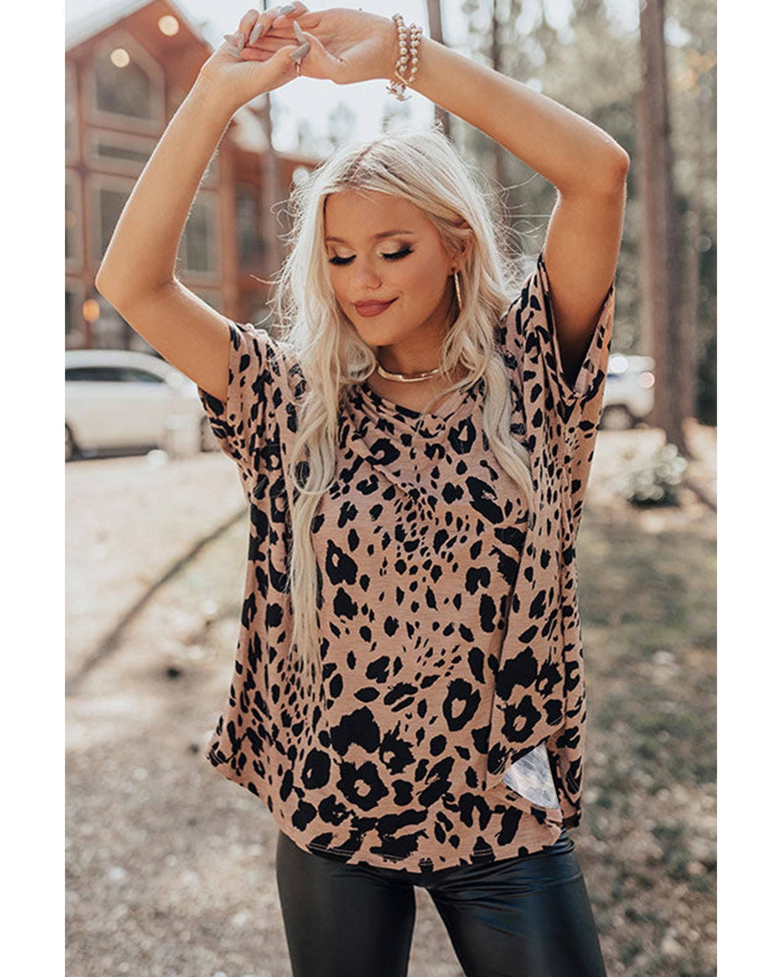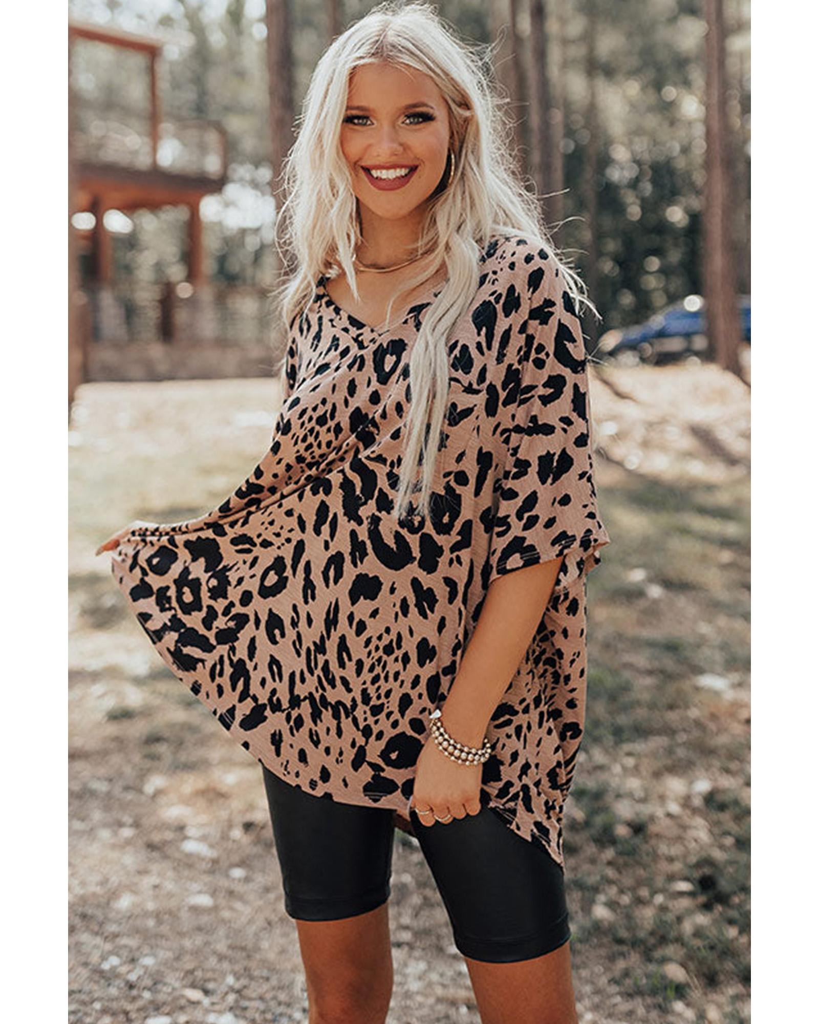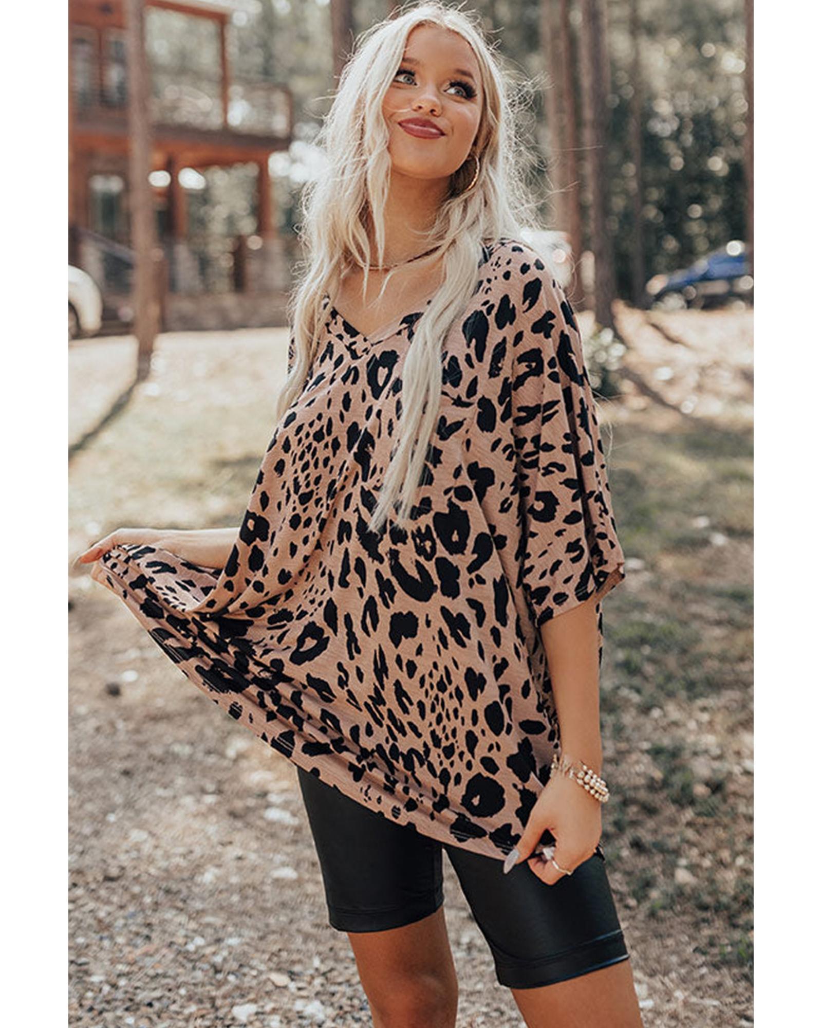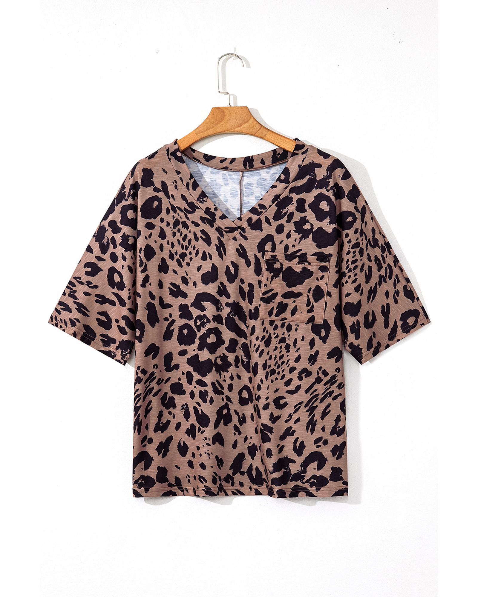 Brown Leopard Print V Neck Half Sleeve Oversized Tee – L
