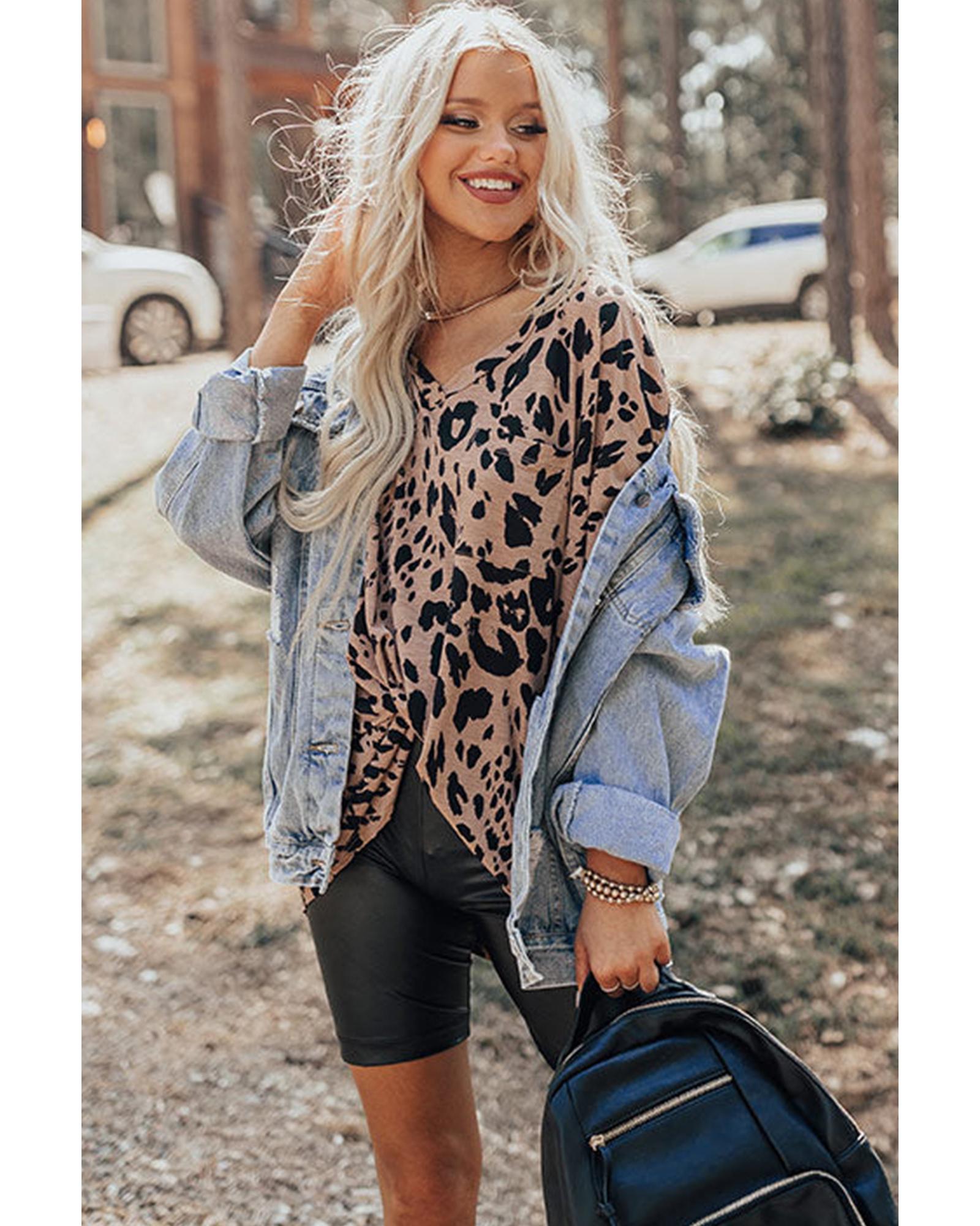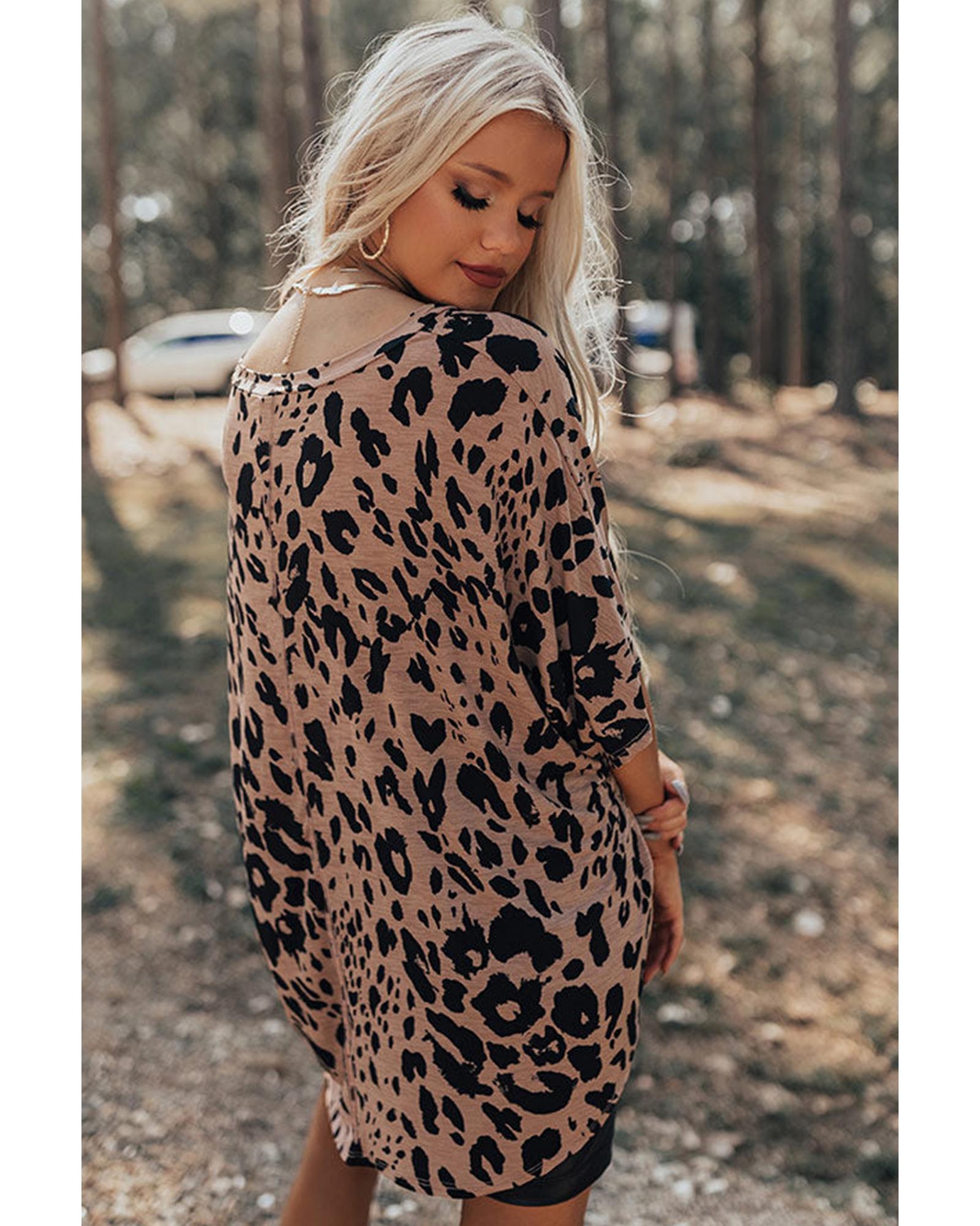 Brown Leopard Print V Neck Half Sleeve Oversized Tee – S