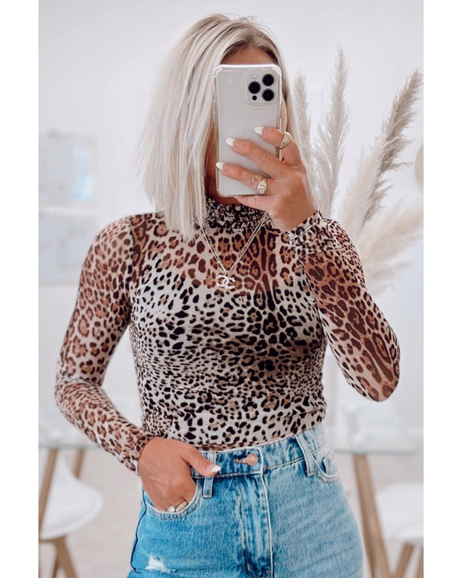 - Brown Leopard Smocked Neck Mesh Long Sleeve Bodysuit