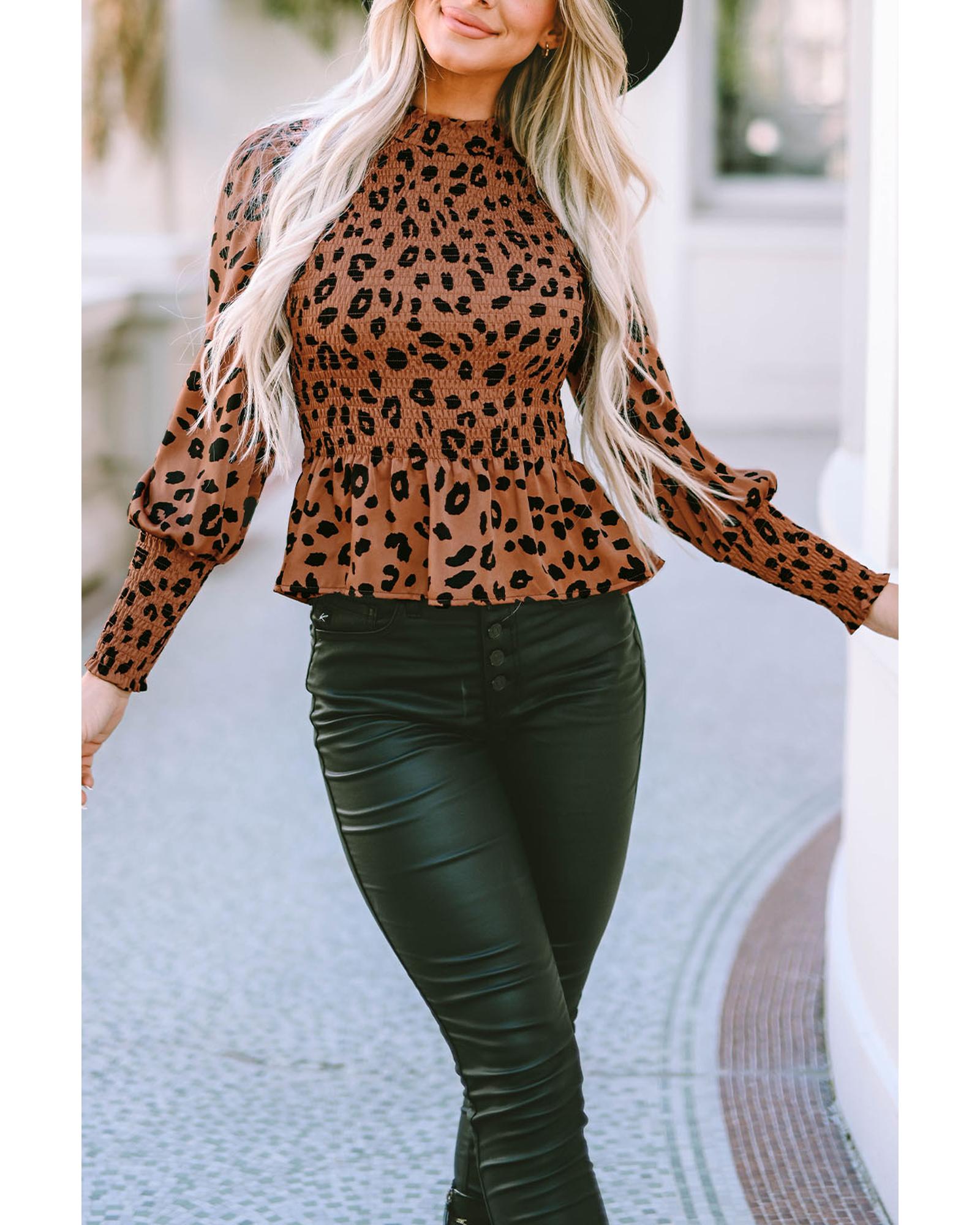 Brown Leopard Smocked Puff Sleeve Peplum Top – L