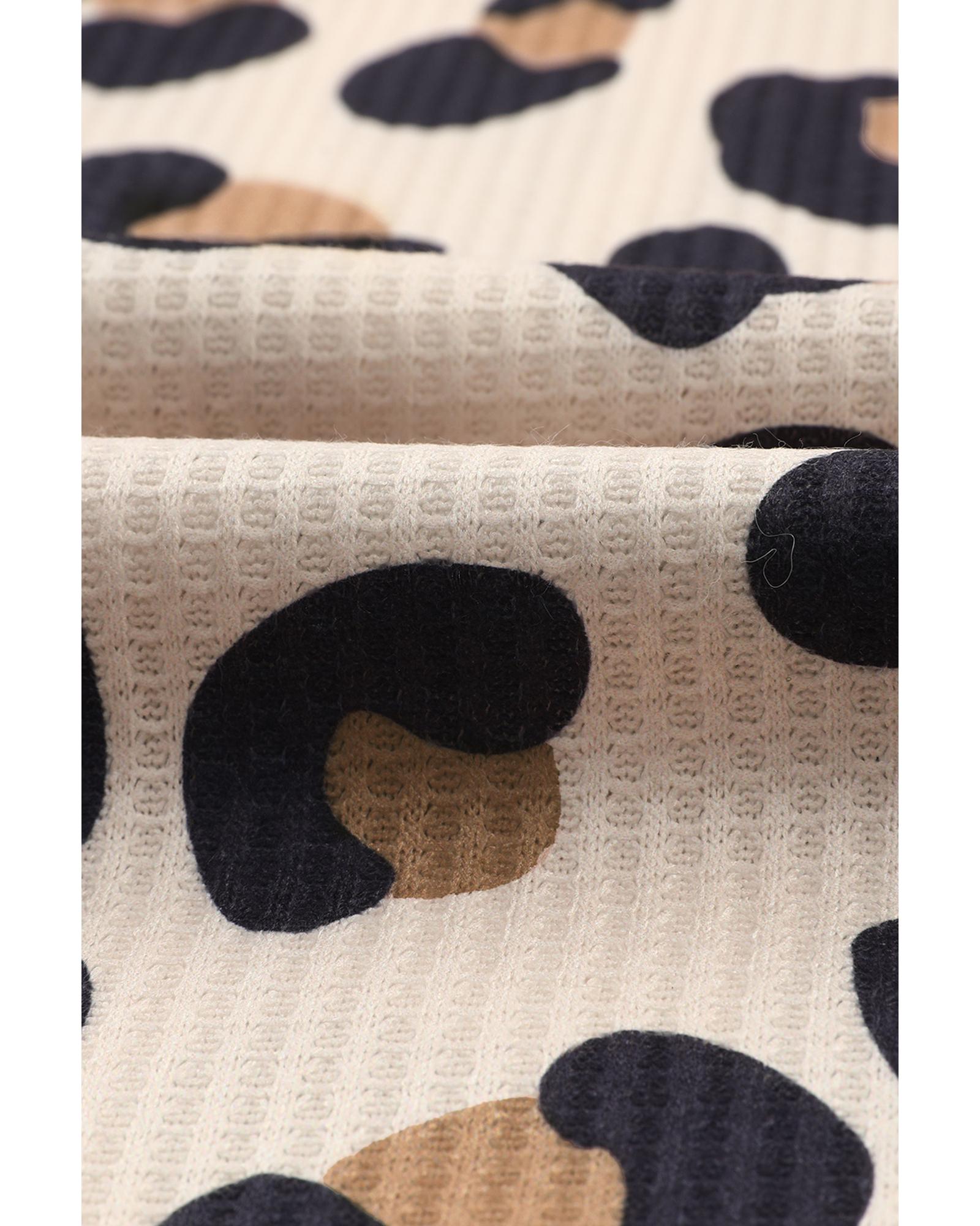 Brown Leopard Splicing Waffle Knit V Neck Top – S