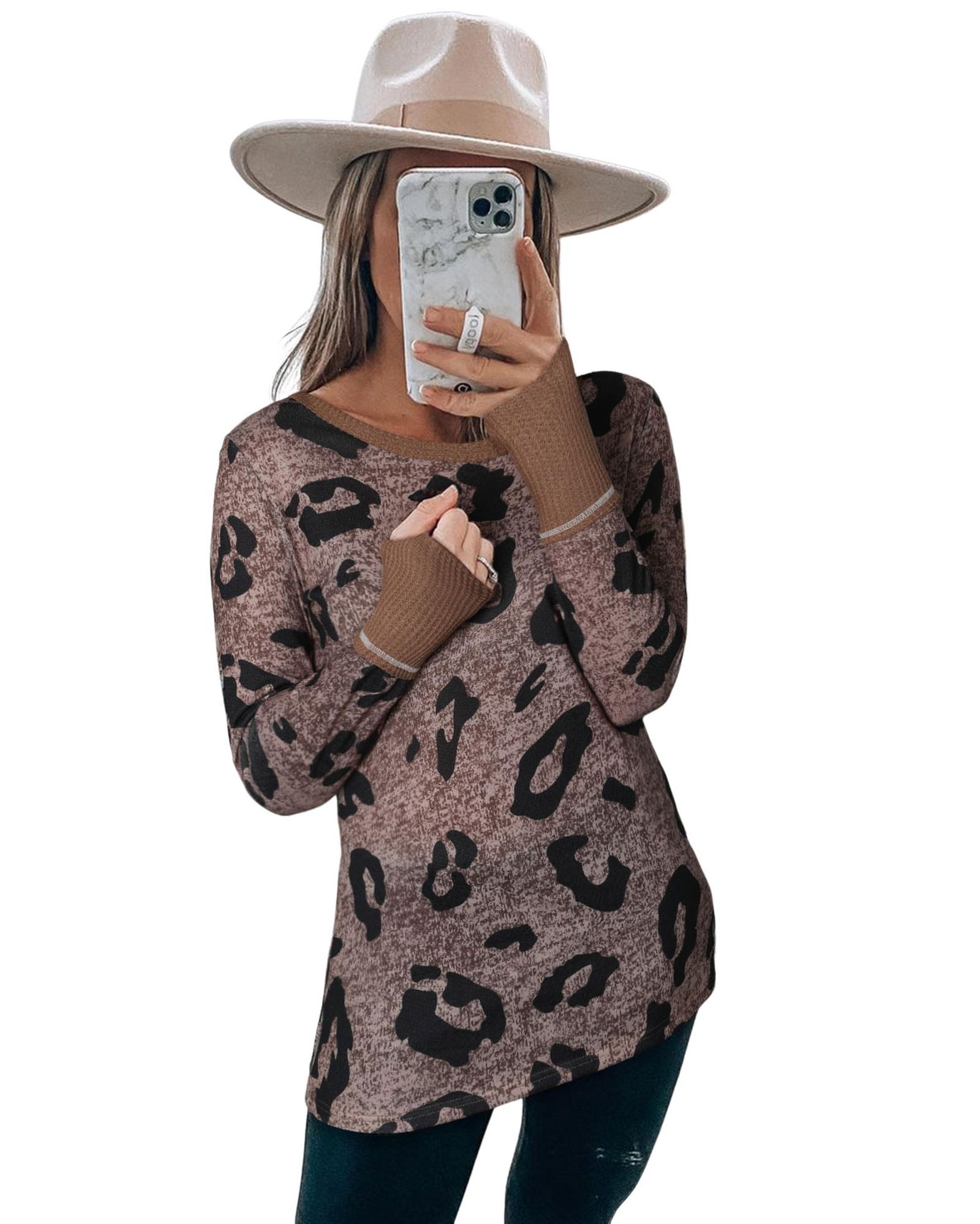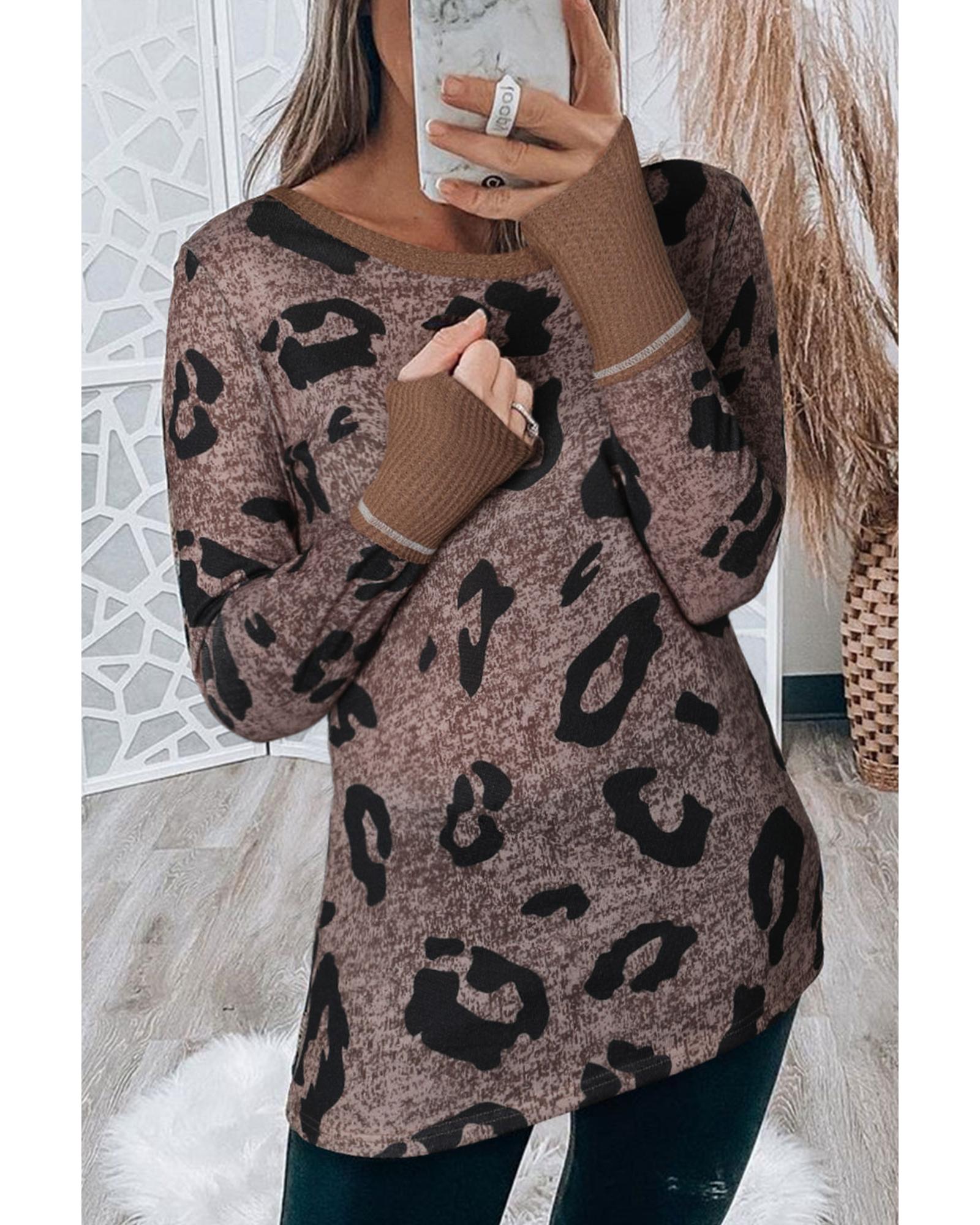Brown Leopard Spling Thumbhole Long Sleeve Top – M