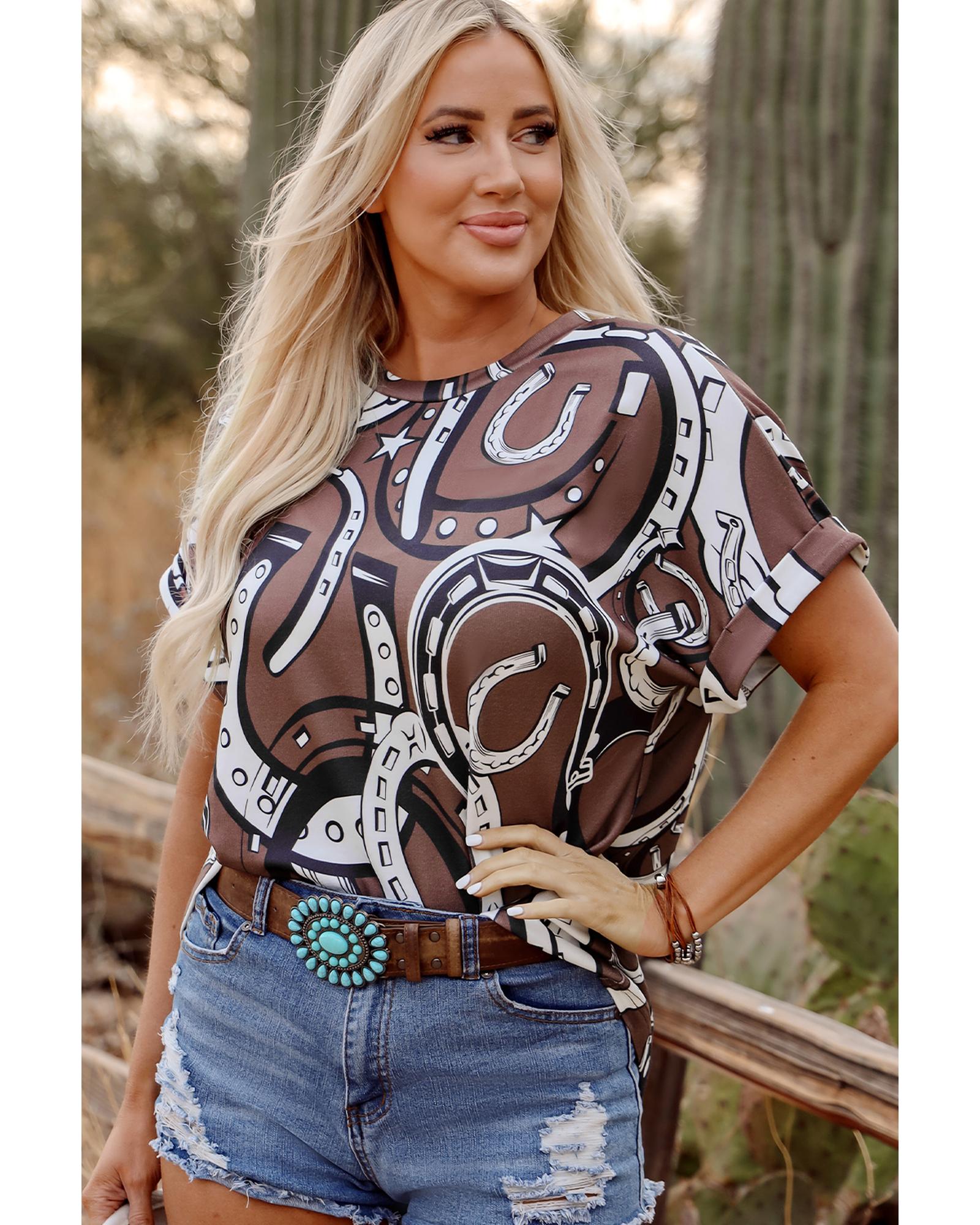 Brown Lucky Horseshoes Graphic Dolman T-shirt – L