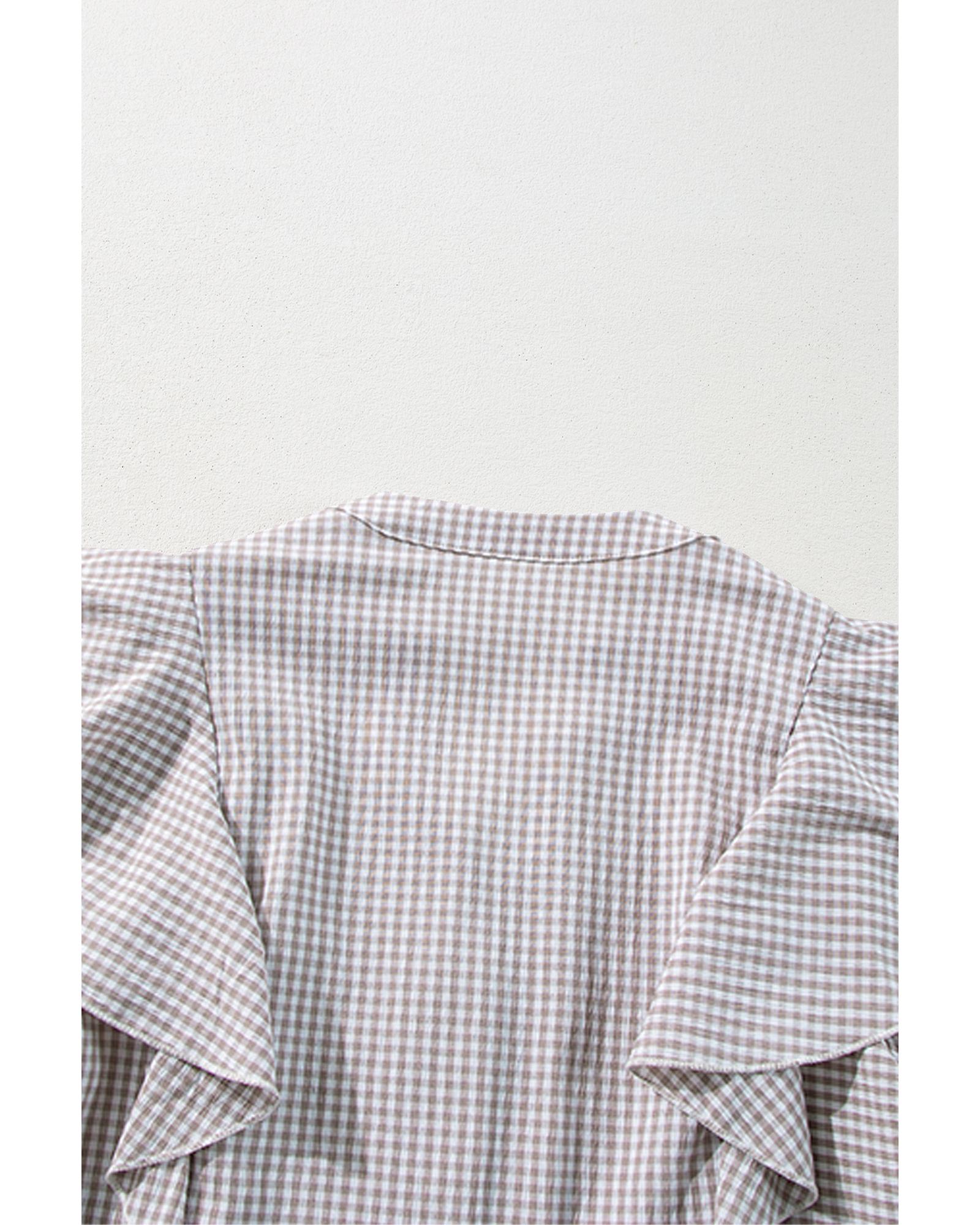 Brown Plaid Flounce Sleeve Notched Neck Ruffled Shirt – XL