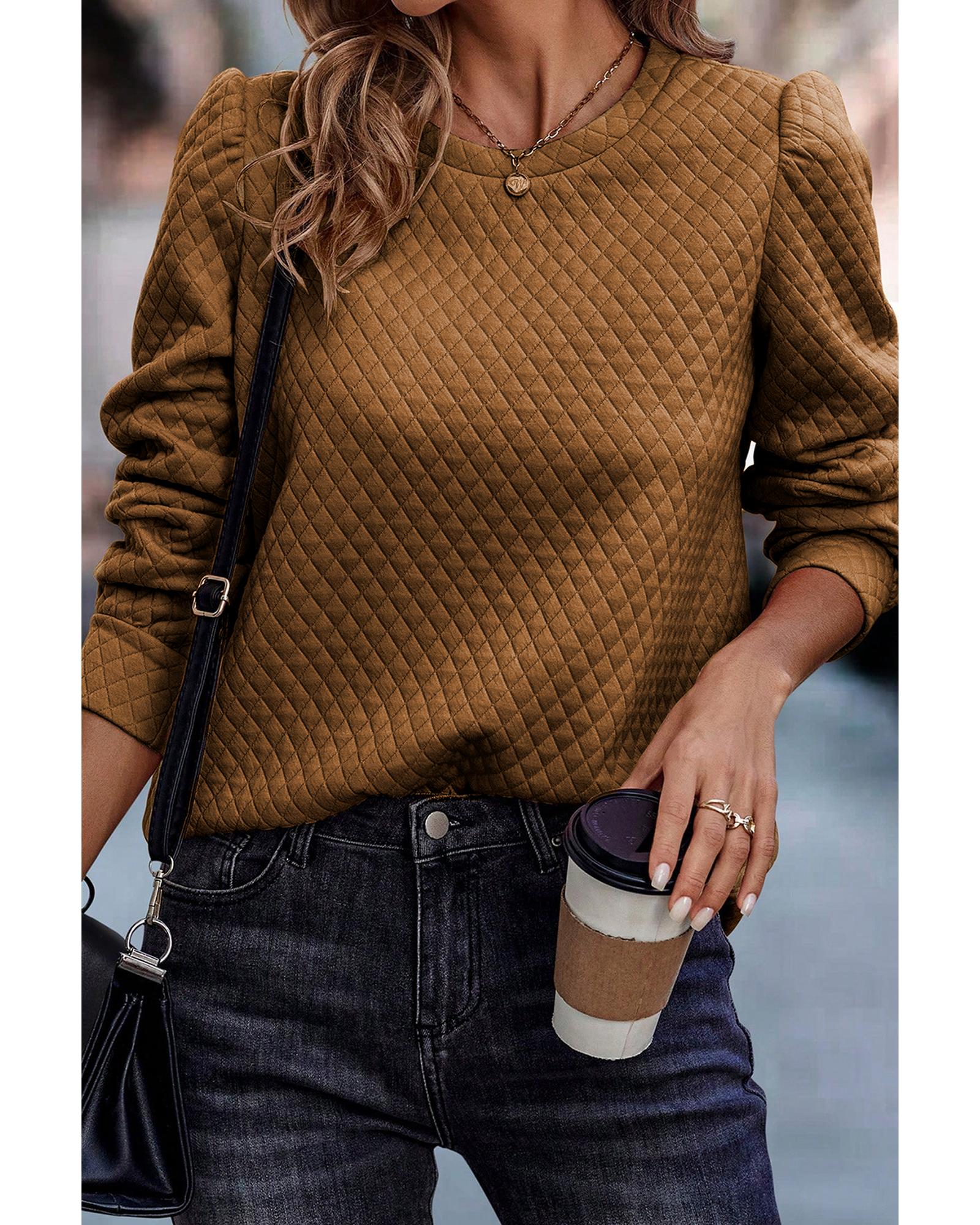 Brown Solid Color Quilted Puff Sleeve Pullover Sweatshirt – S