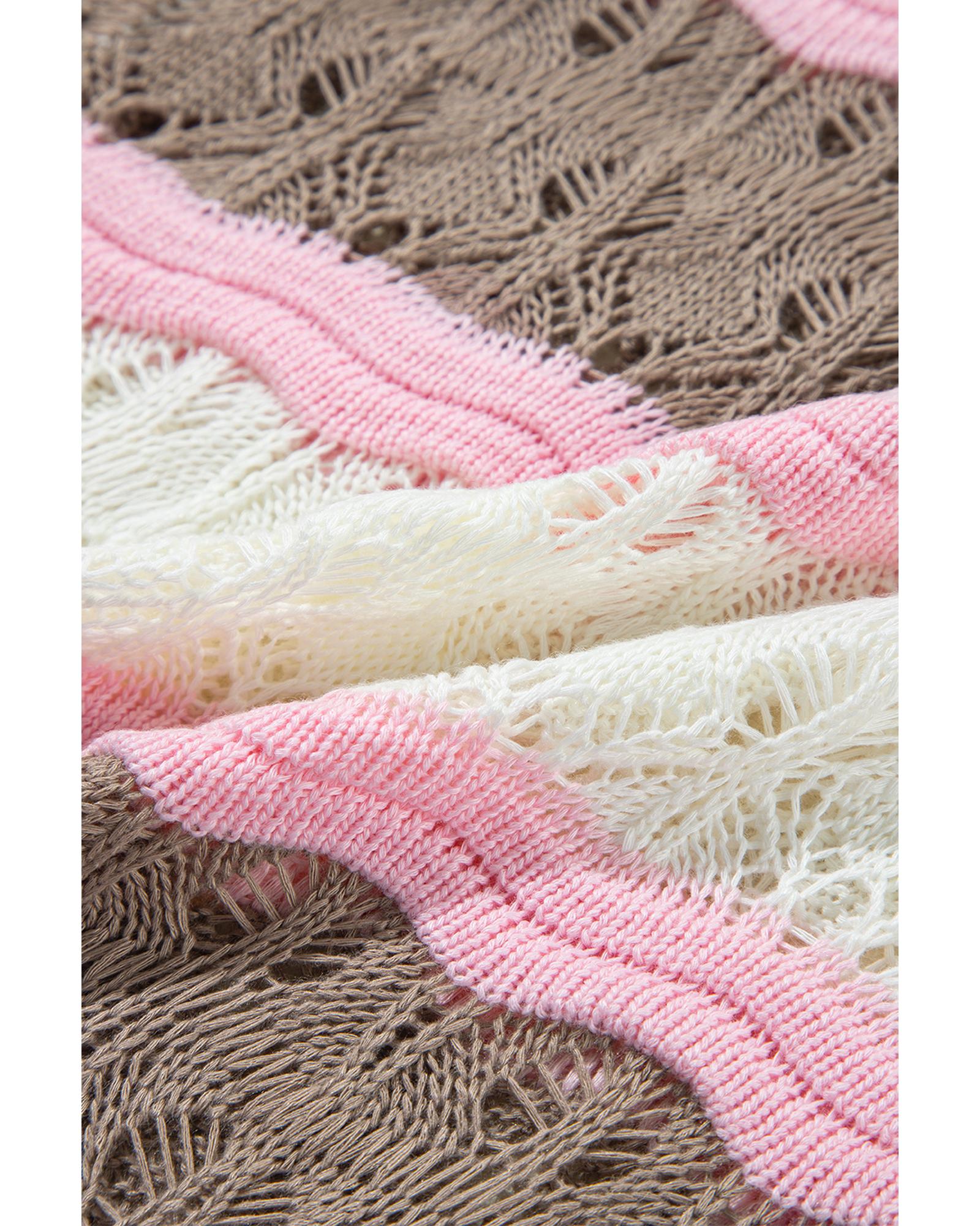 - Brown Stripe Color Block Hollow Out Crochet Half Sleeve Sweater