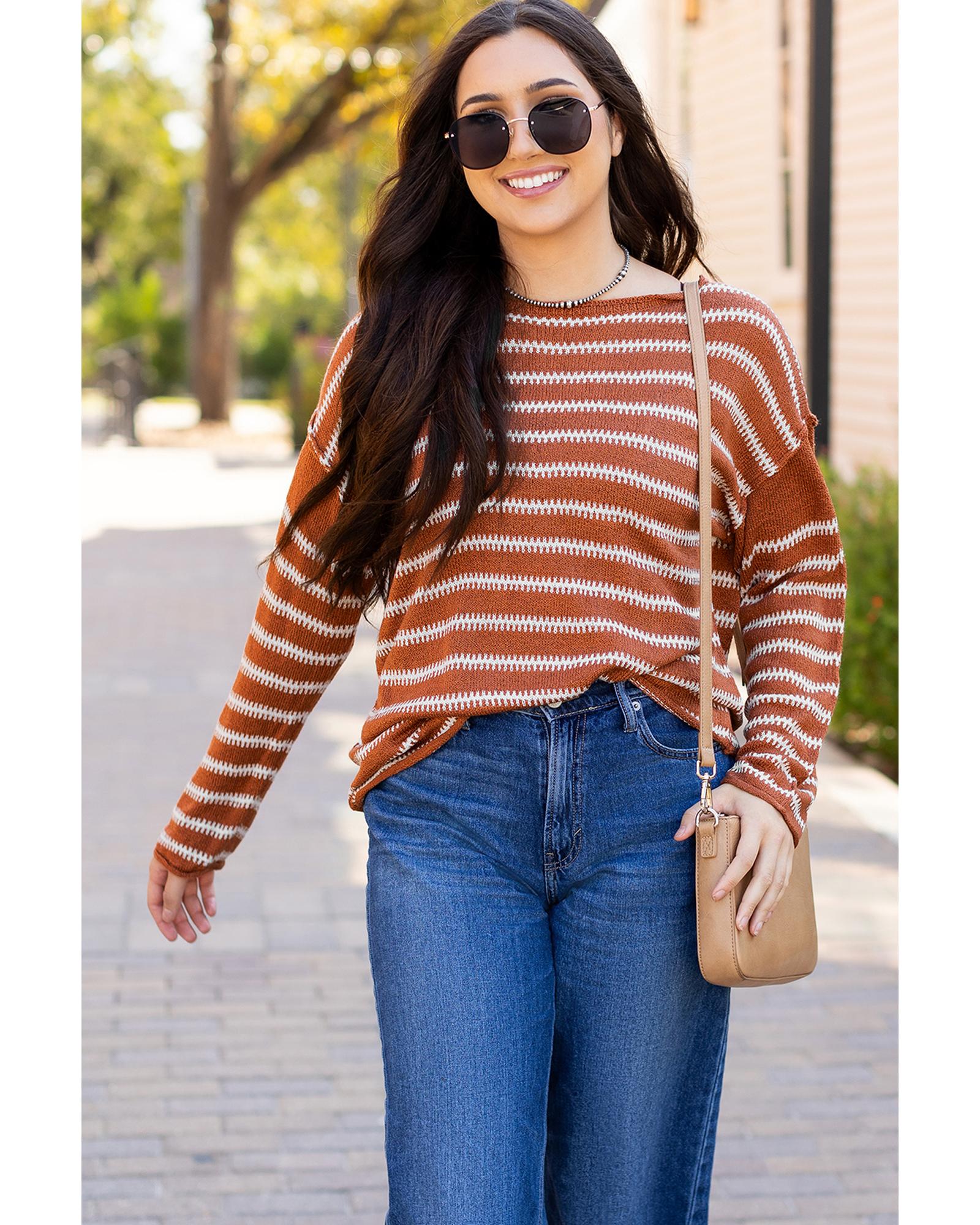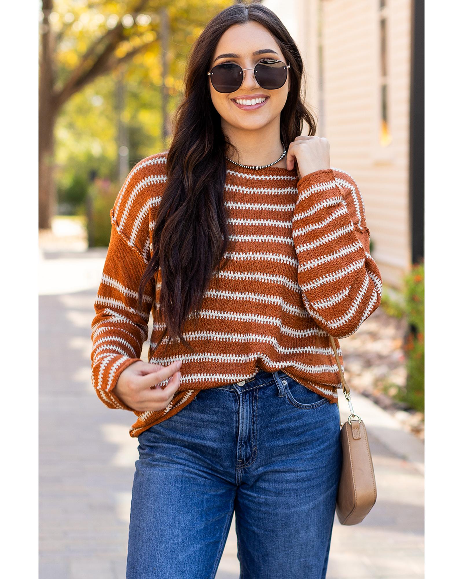 Brown Stripe Drop Shoulder Casual Sweater – L