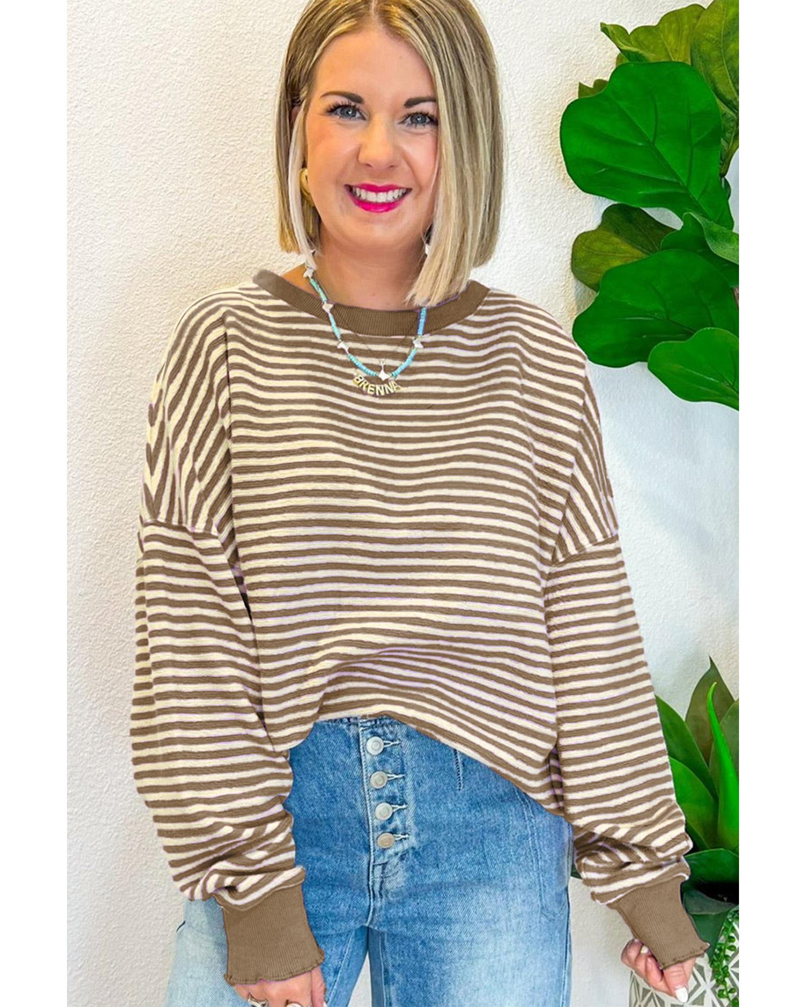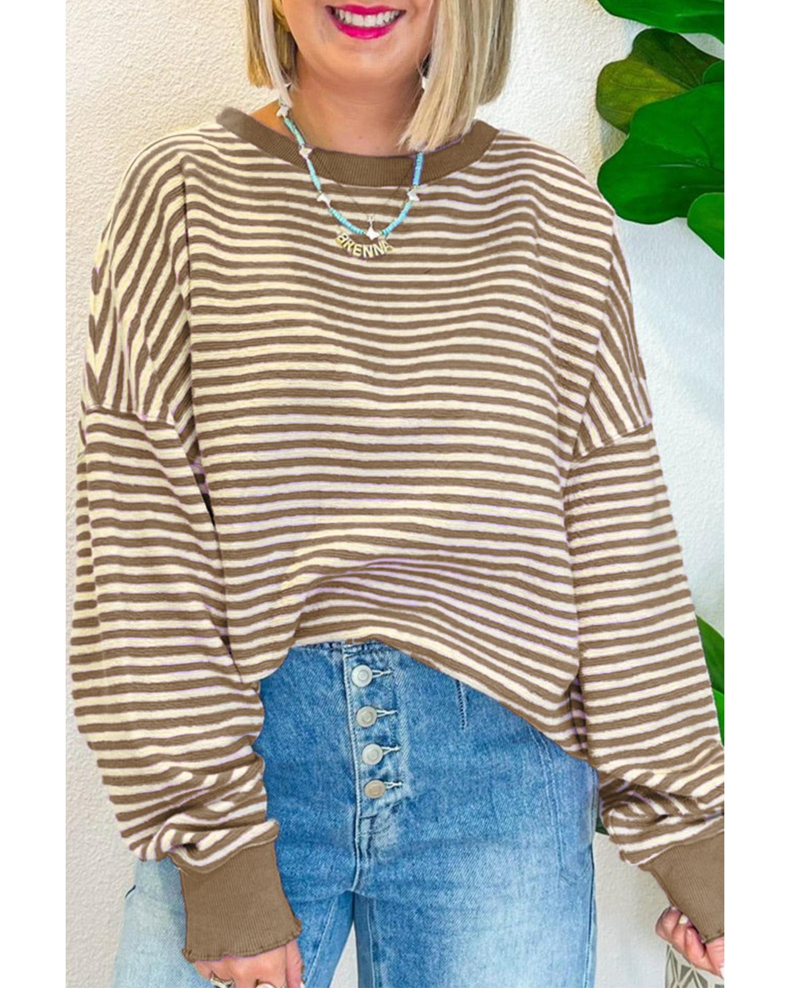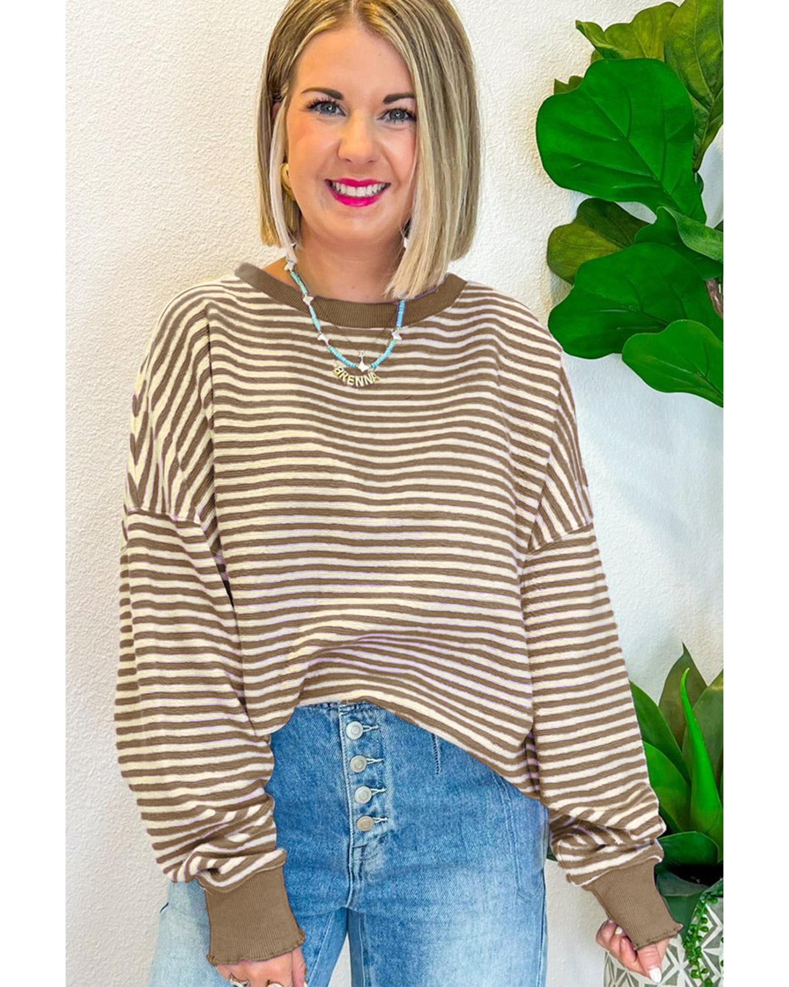 - Brown Stripe Loose Drop Shoulder Long Sleeve Top