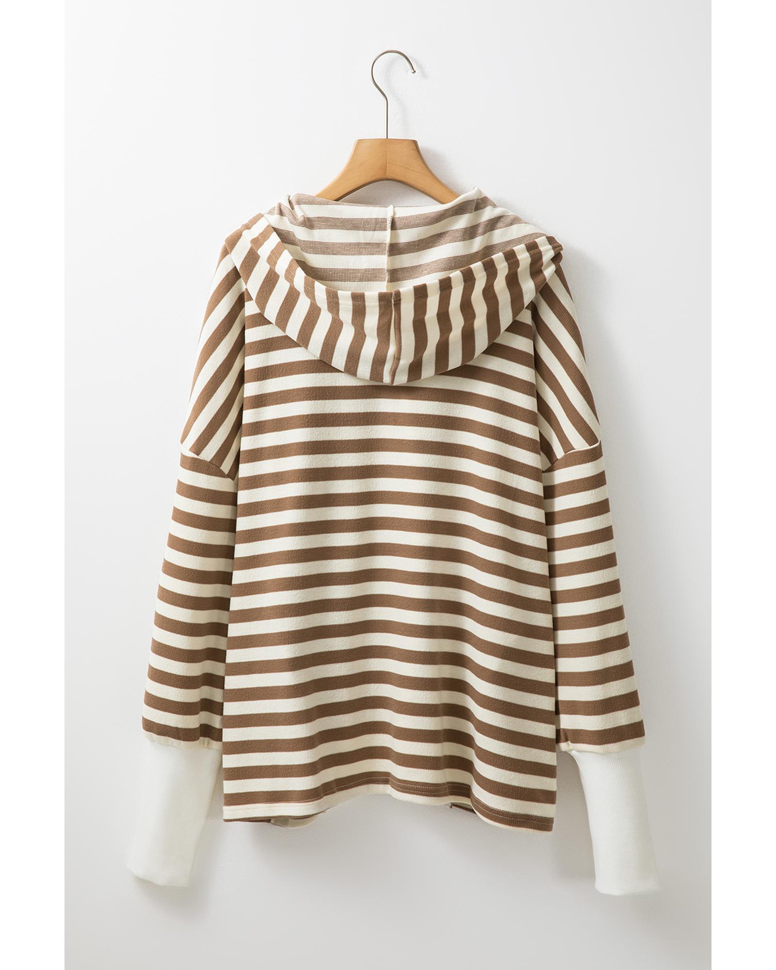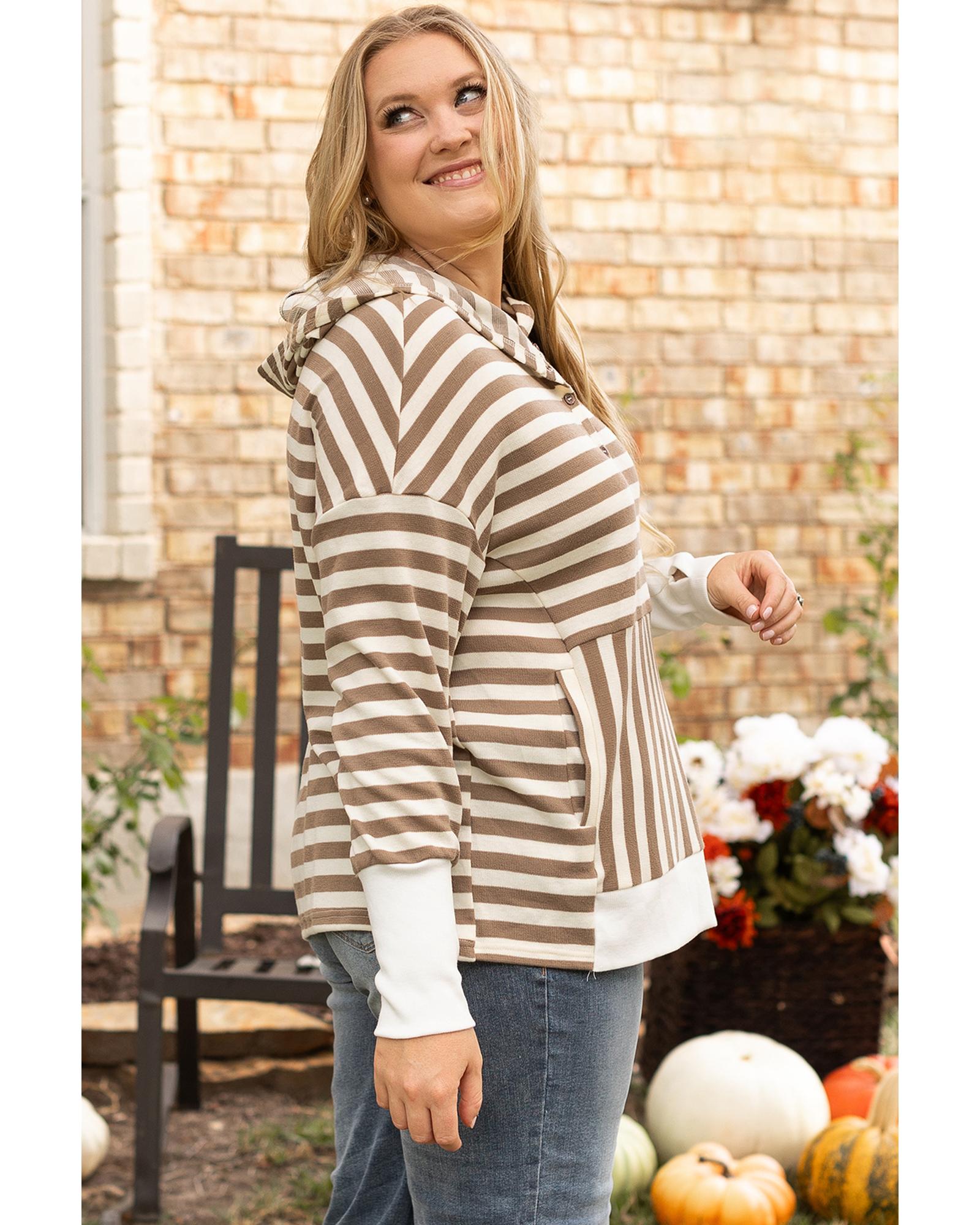 Brown Stripe Quarter Buttons Drop Sleeve Plus Size Hoodie – 1X